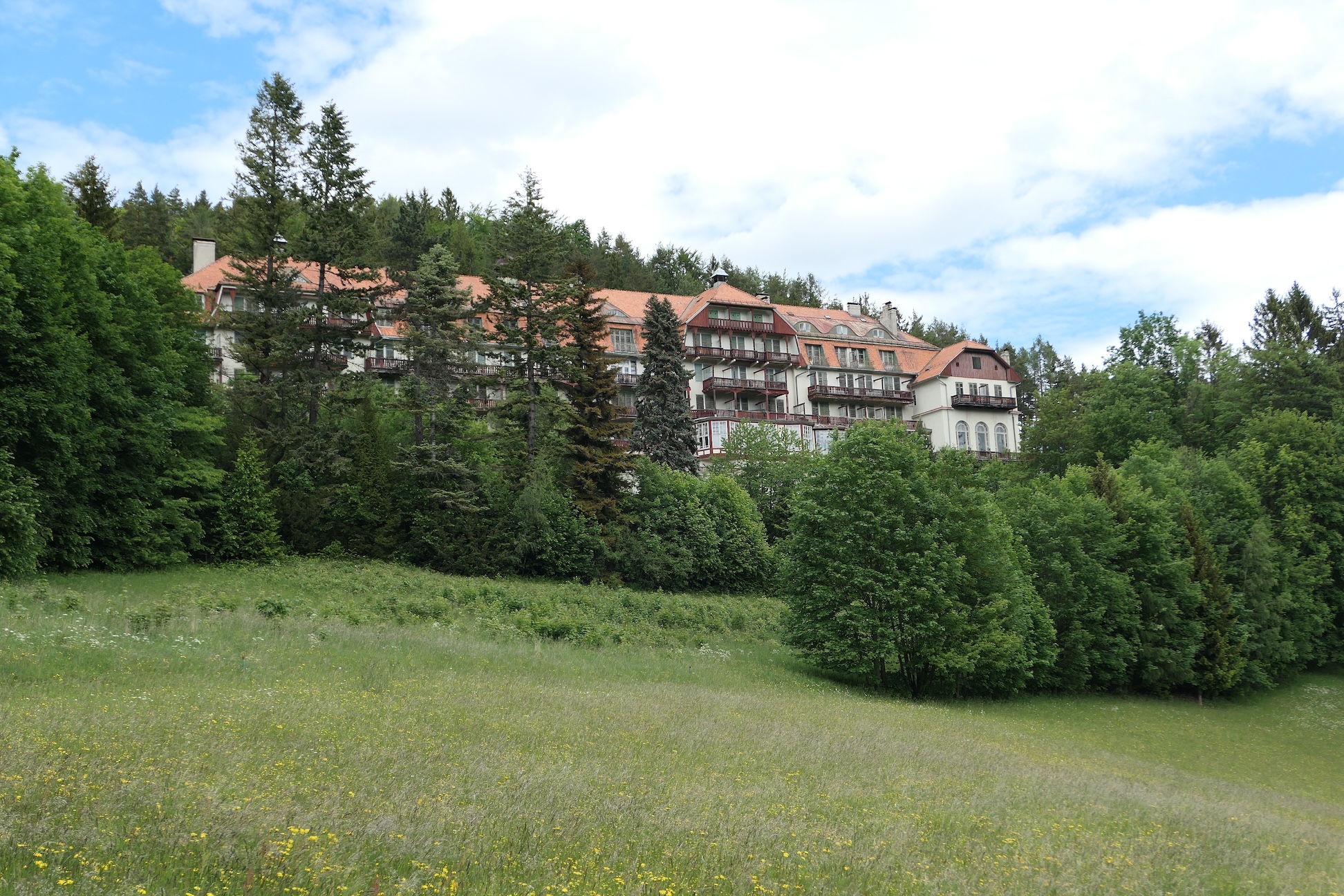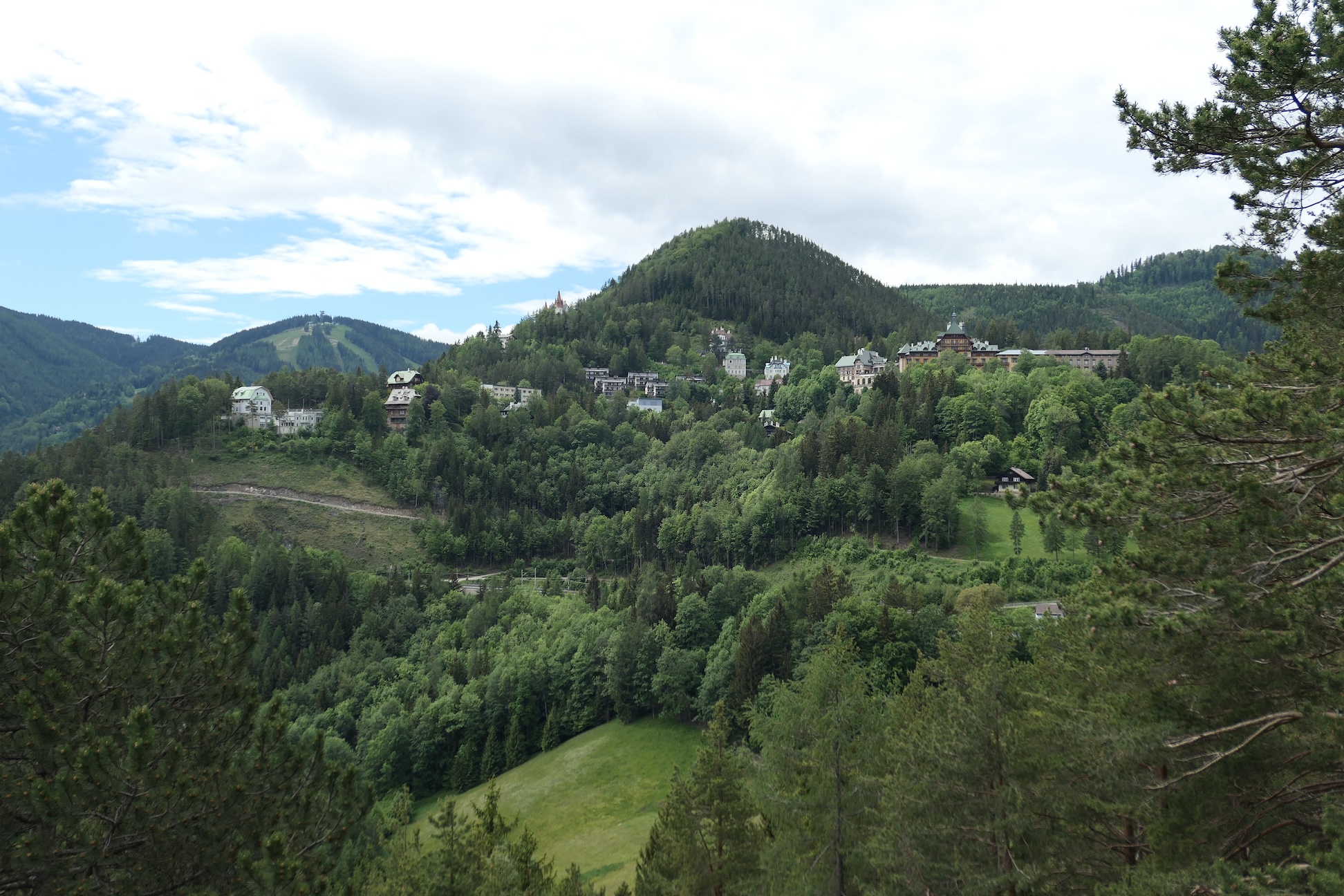 Die Wanderung startete bei wolkigem Himmel und angenehmen Temperaturen am Bahnhof Semmering. Entlang der Bahn ging es bergauf und bergab durch kühle Wälder vorbei am alten Kurhaus Semmering zur Station Wolfsbergkogel.