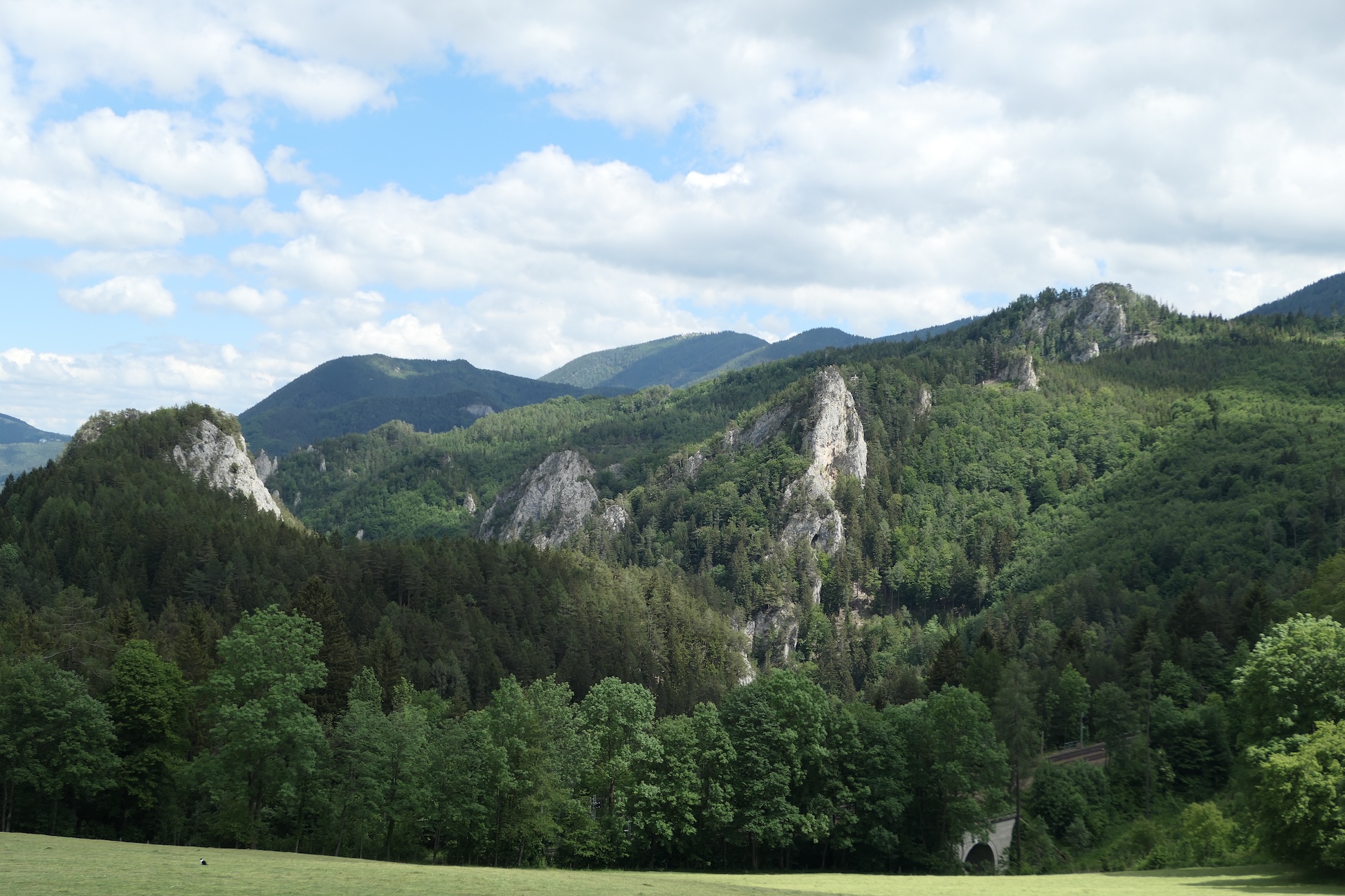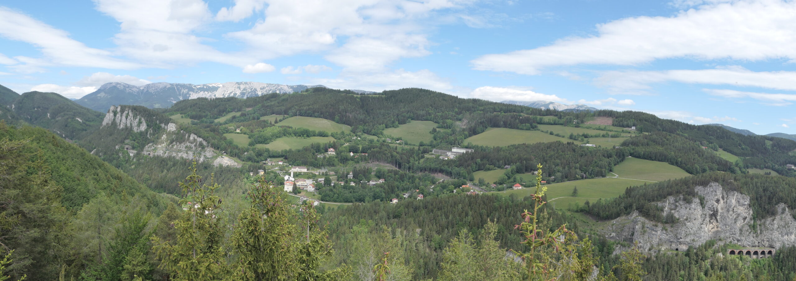 Mit solchen Ausblicken flogen diese ersten Kilometer nur so an mir vorüber, obwohl es auch einige Male bergauf ging. Die Informationstafeln zur Geschichte der Semmeringbahn, die es in regelmäßigen Abständen gab, ließen die Zeit umso schneller vergehen. Ich machte kurz Rast, um meinen mitgebrachten Apfel und einige Nüsse zu essen und gönnte mir beim Ghega-Museum (das ich aus Zeitgründen nicht besuchte) einen Kaffee, entschied mich aber dagegen, hier bereits eine längere Mittagspause einzulegen. Länger pausieren und etwas essen wollte ich erst, wenn ich zumindest die Hälfte des Weges geschafft hätte – ein Fehler, wie sich dann später herausstellen sollte. 😉
