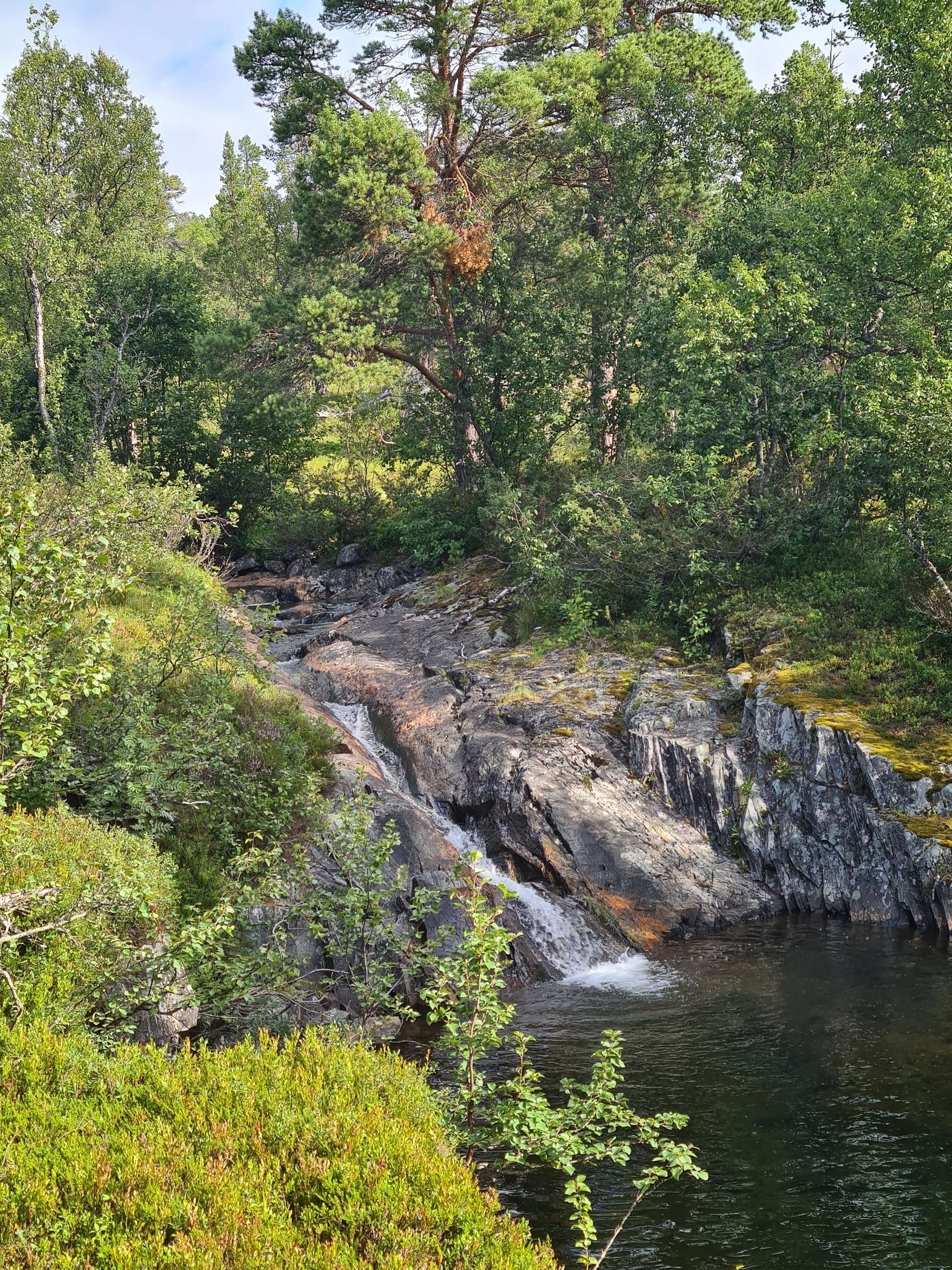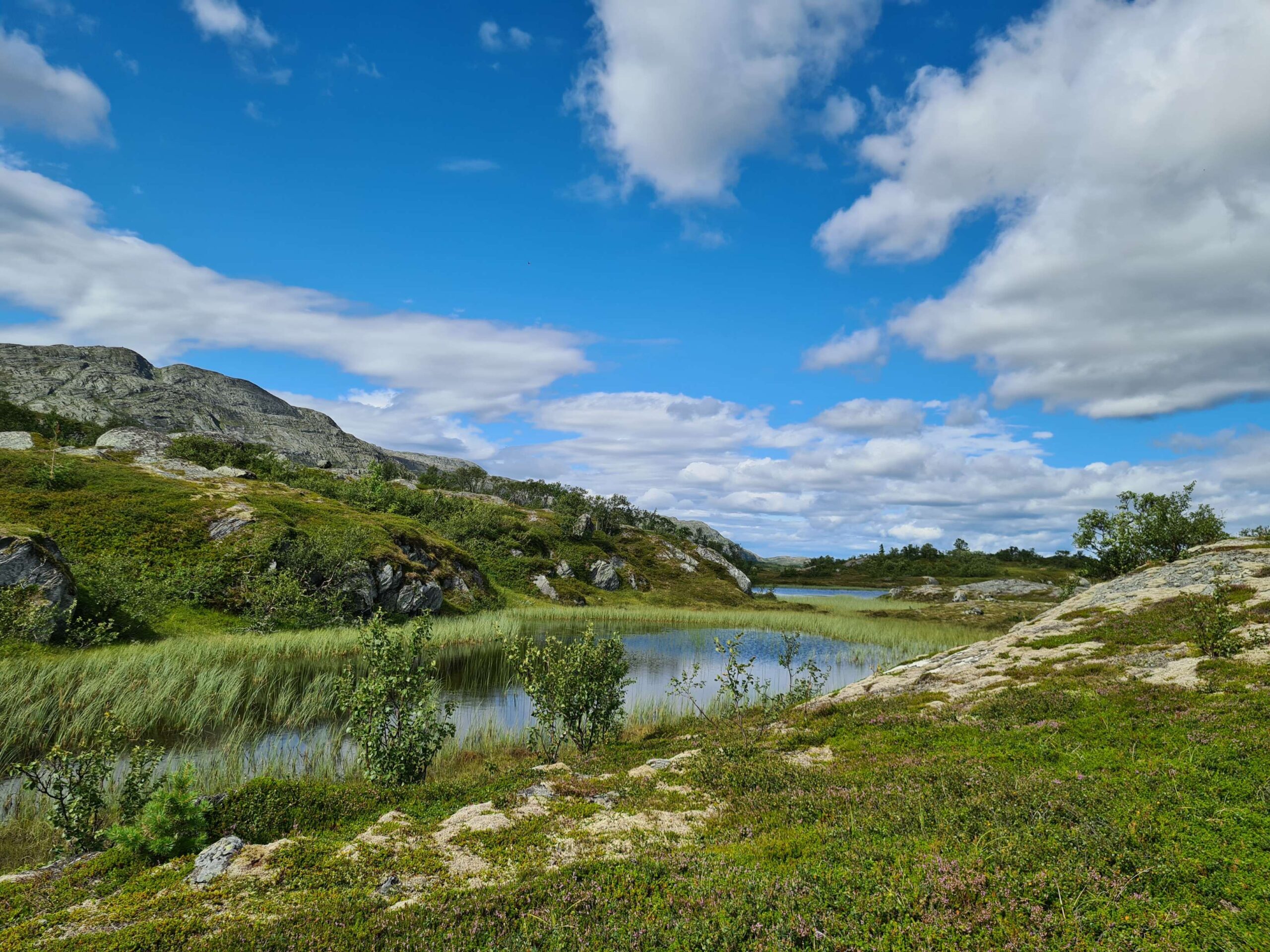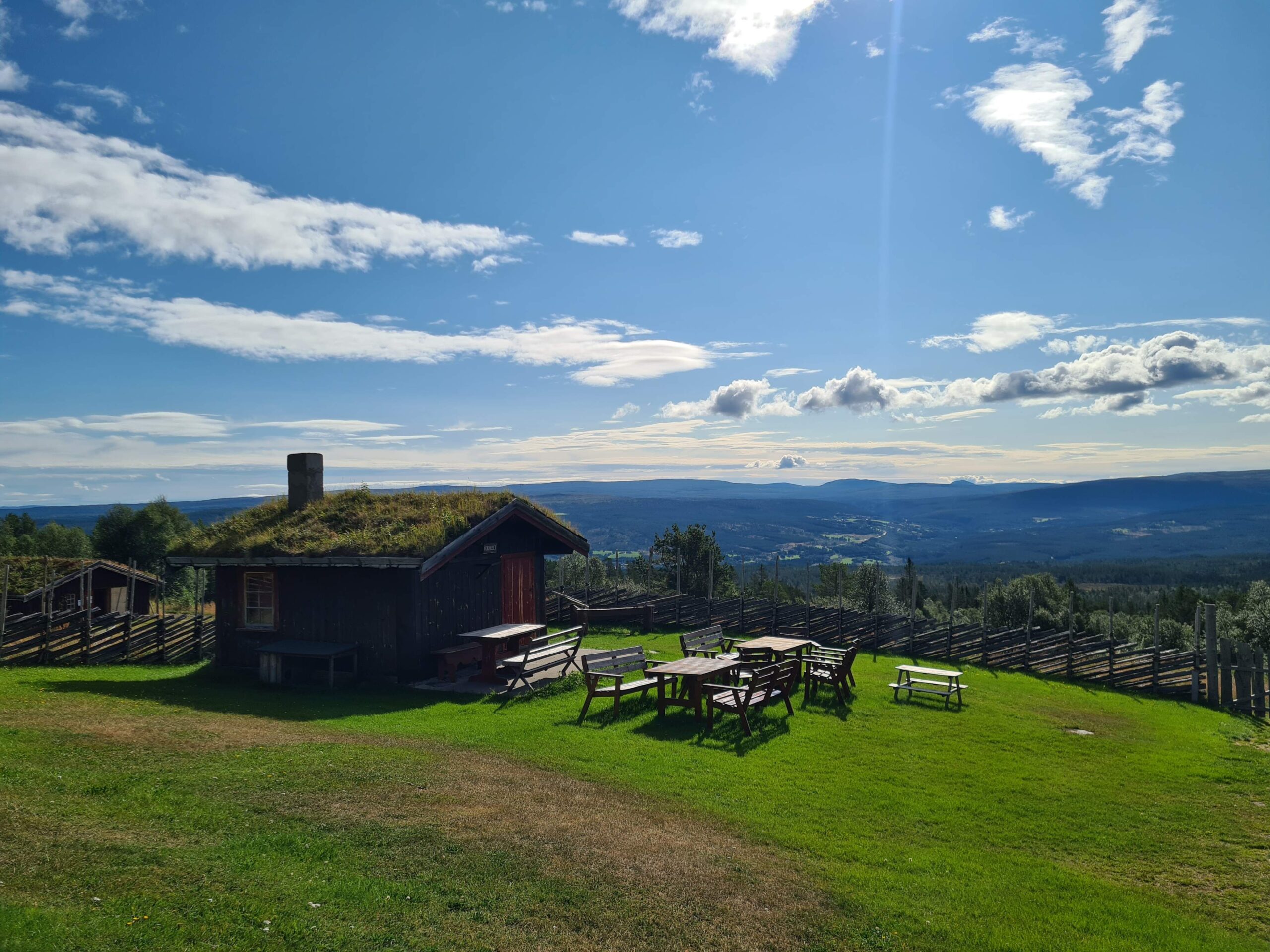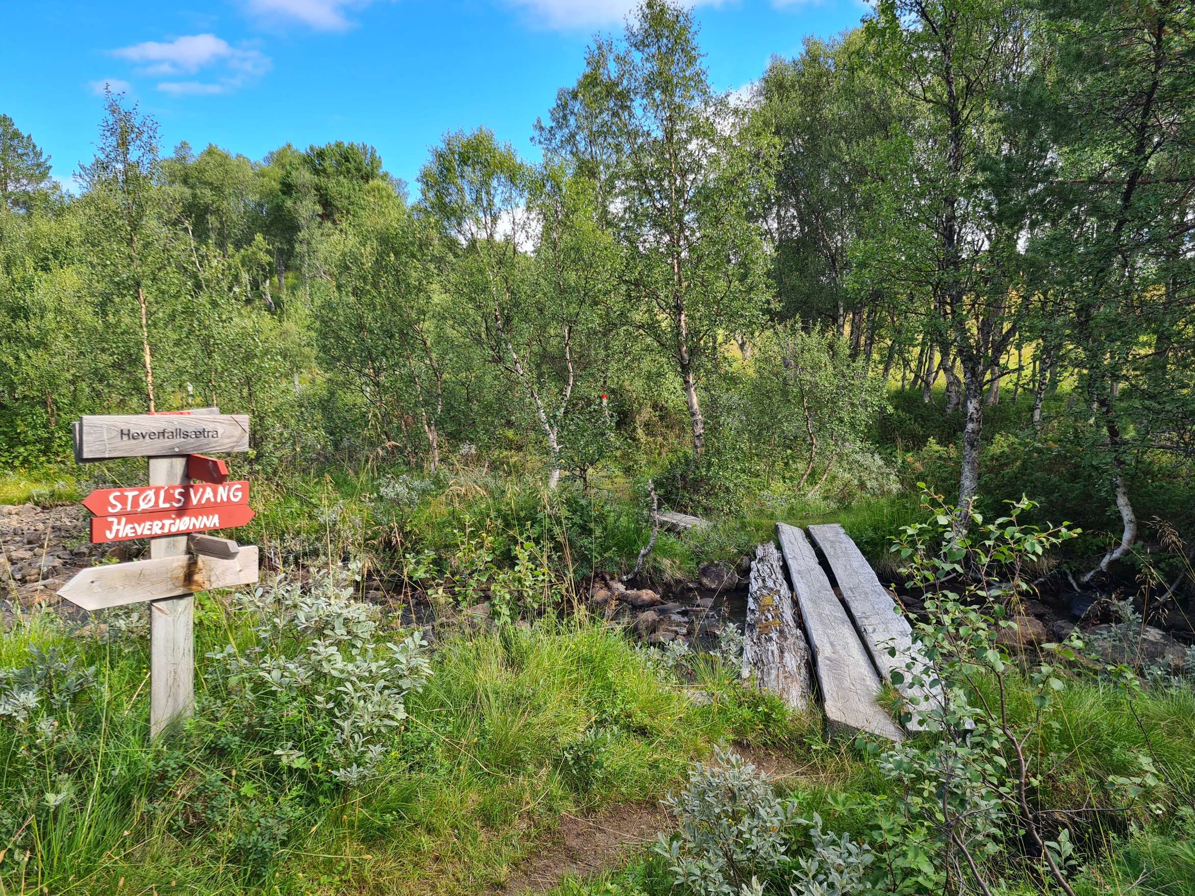 Nach einer guten Stunde erreichte ich die Hütten von Heverfallsætra, wo ein herrlicher Ausblick war. Ich machte hier eine kurze Pause in der Sonne.