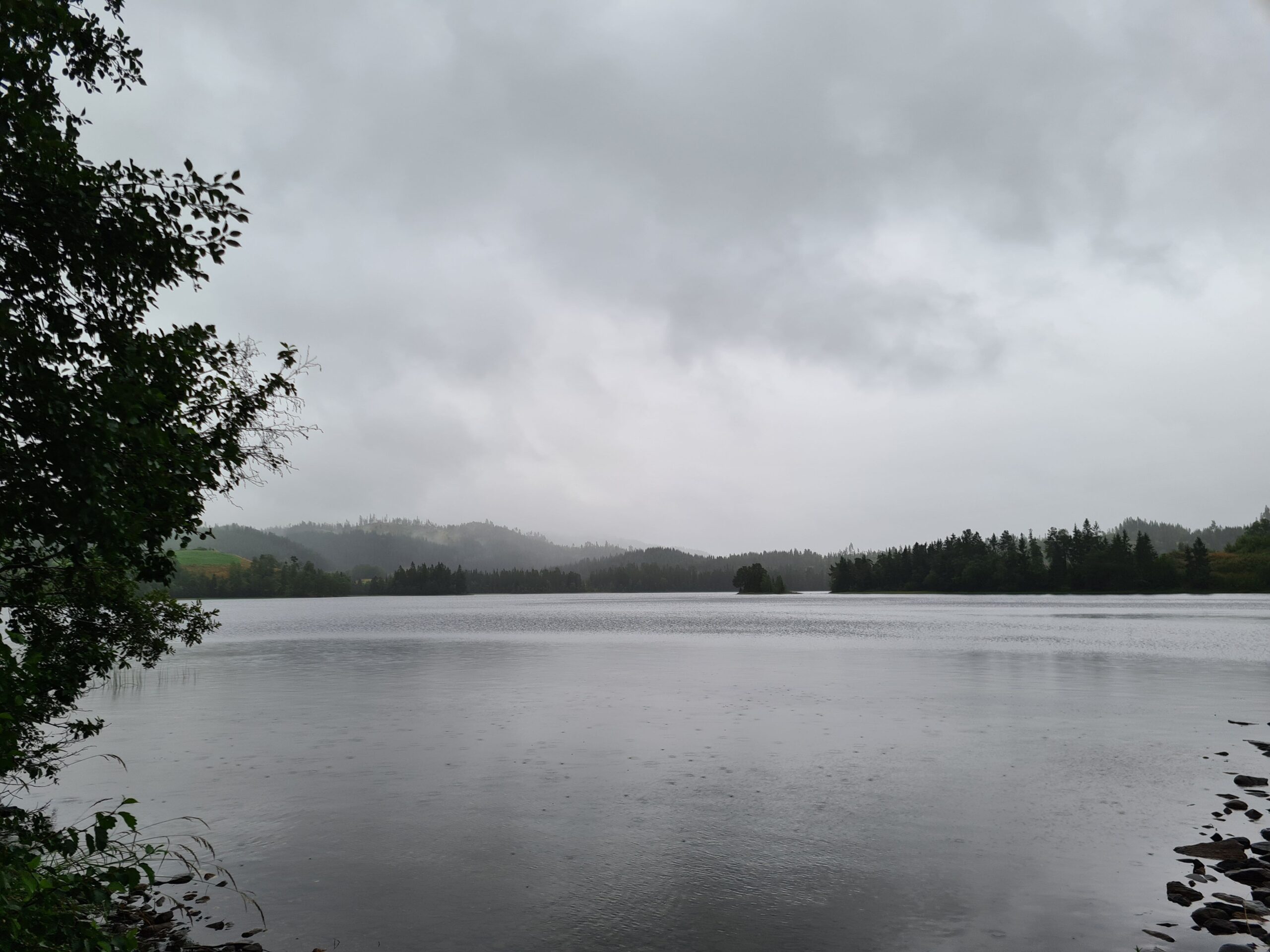 Als ich nach etwa fünf Kilometern einen See erreichte, wurde der Regen stärker.