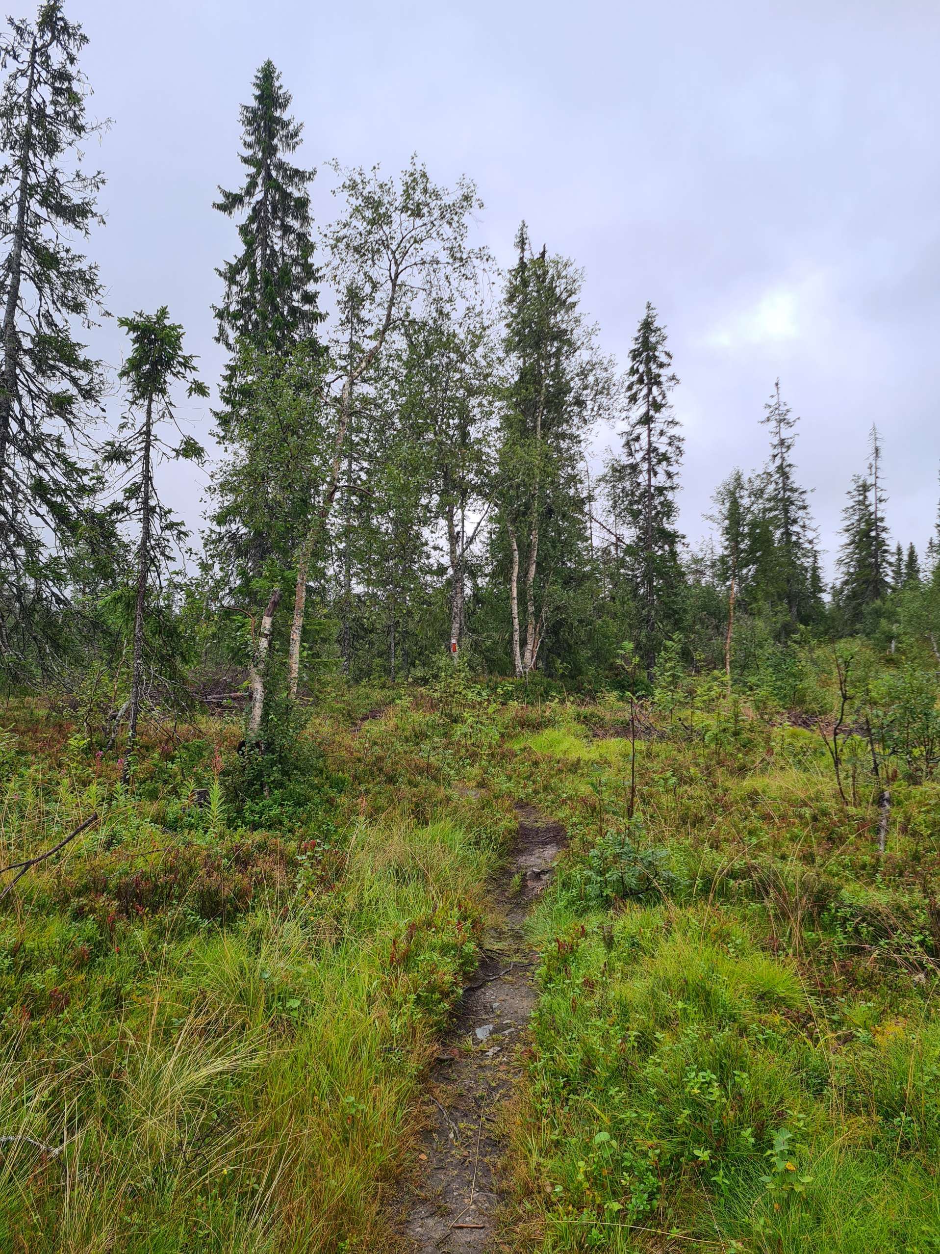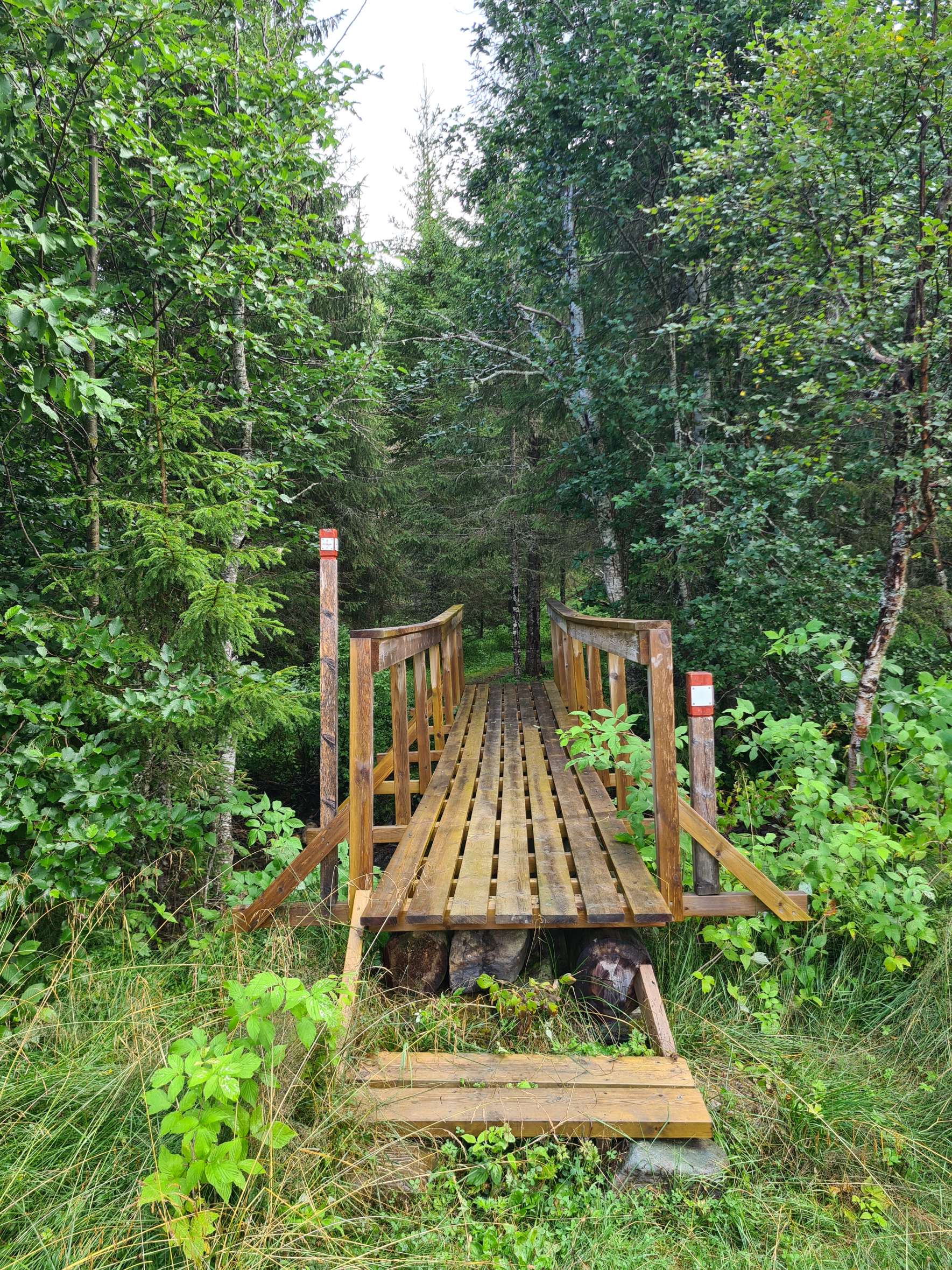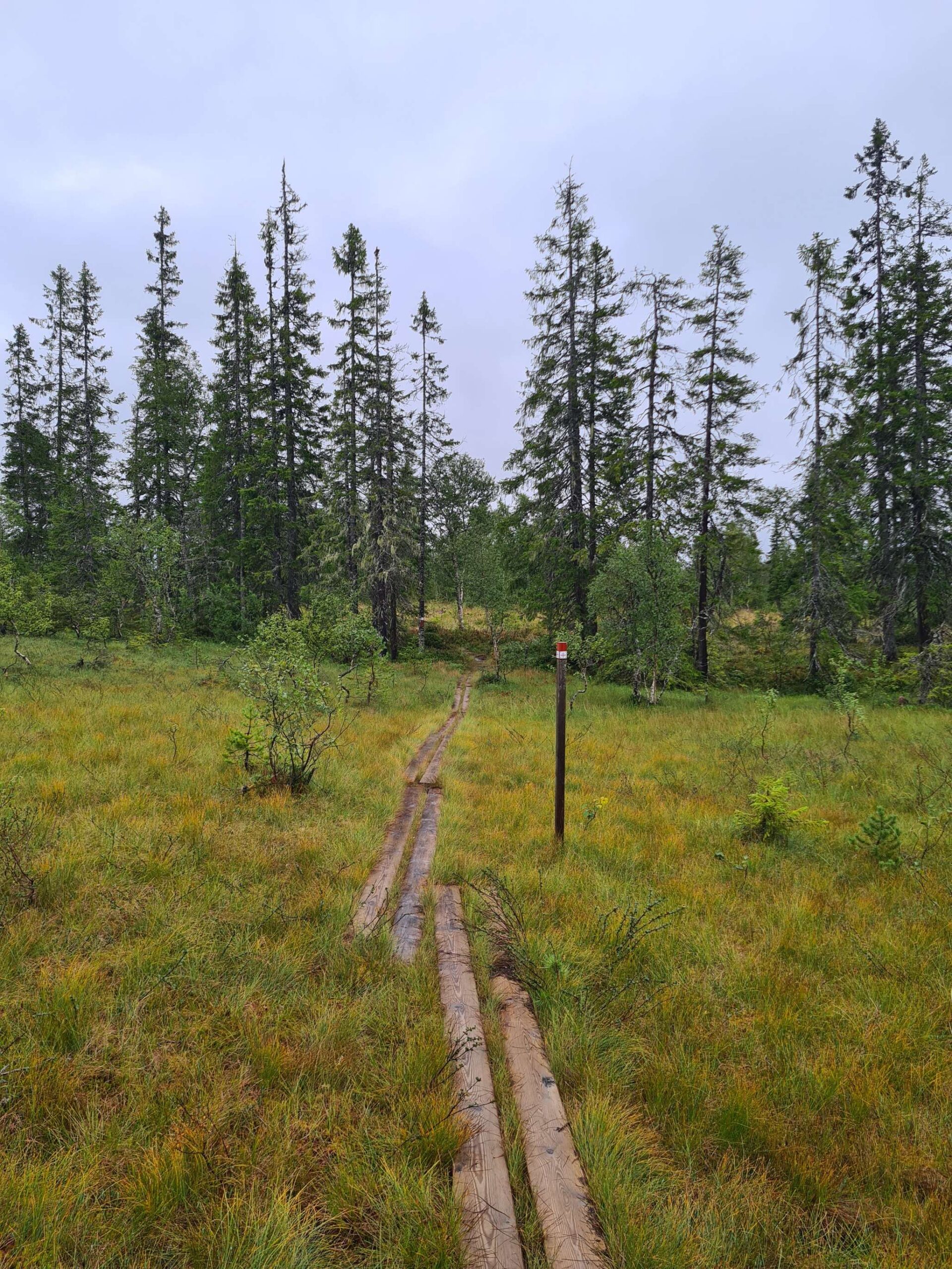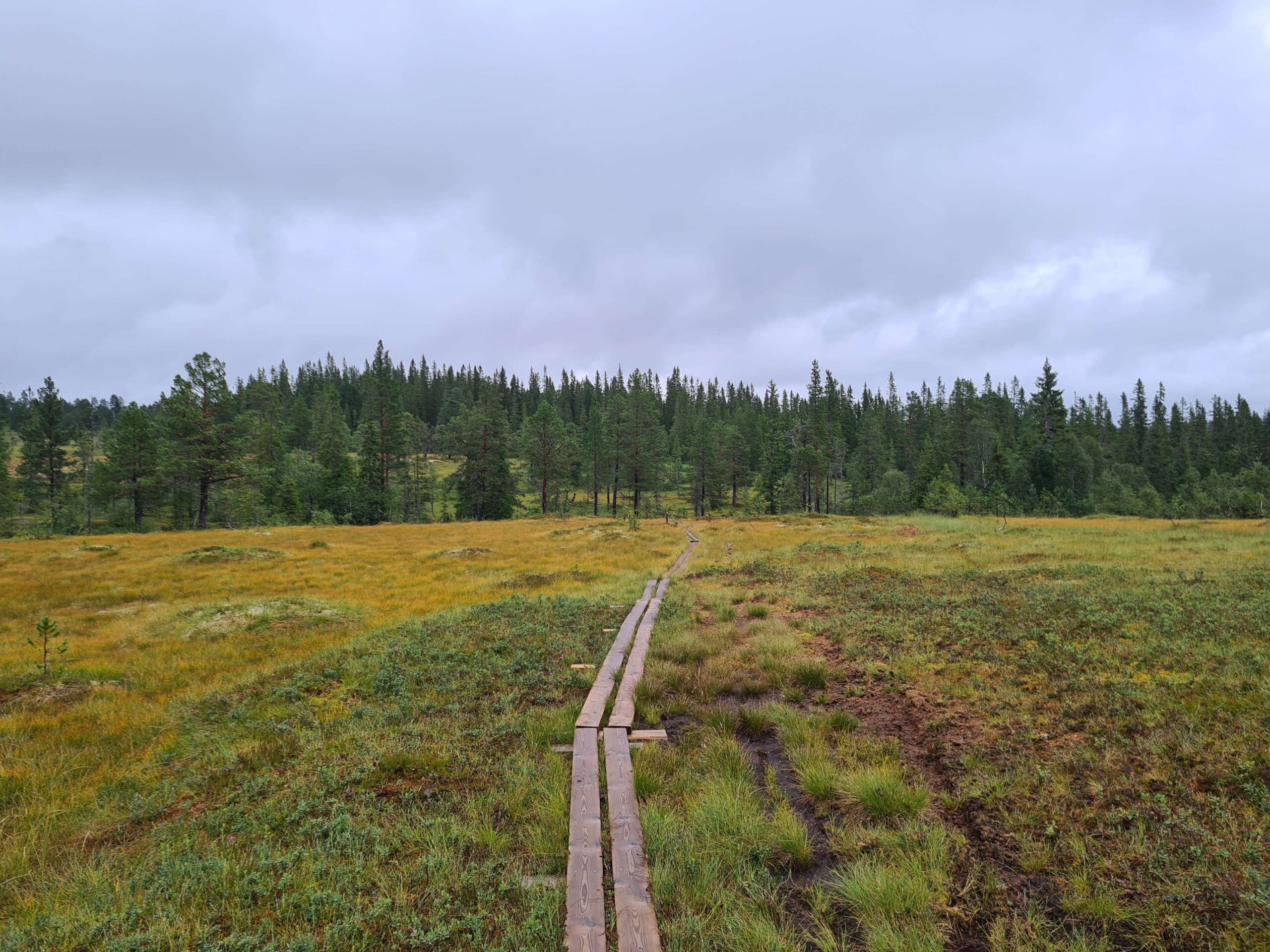 Hier hatte bereits eine ukrainische Pilgerin Schutz gesucht und gemeinsam warteten wir darauf, dass der Regen nachließ. Als das schließlich der Fall war, machte sich die andere Pilgerin wieder auf den Weg, während ich gleich noch eine frühe Mittagspause einlegte. Danach wanderte auch ich wieder los. Es ging nun ins Moor hinein, was sehr schön und bei diesem Wetter auch etwas mystisch war. Auf diesen Abschnitt hatte ich mich schon sehr gefreut.