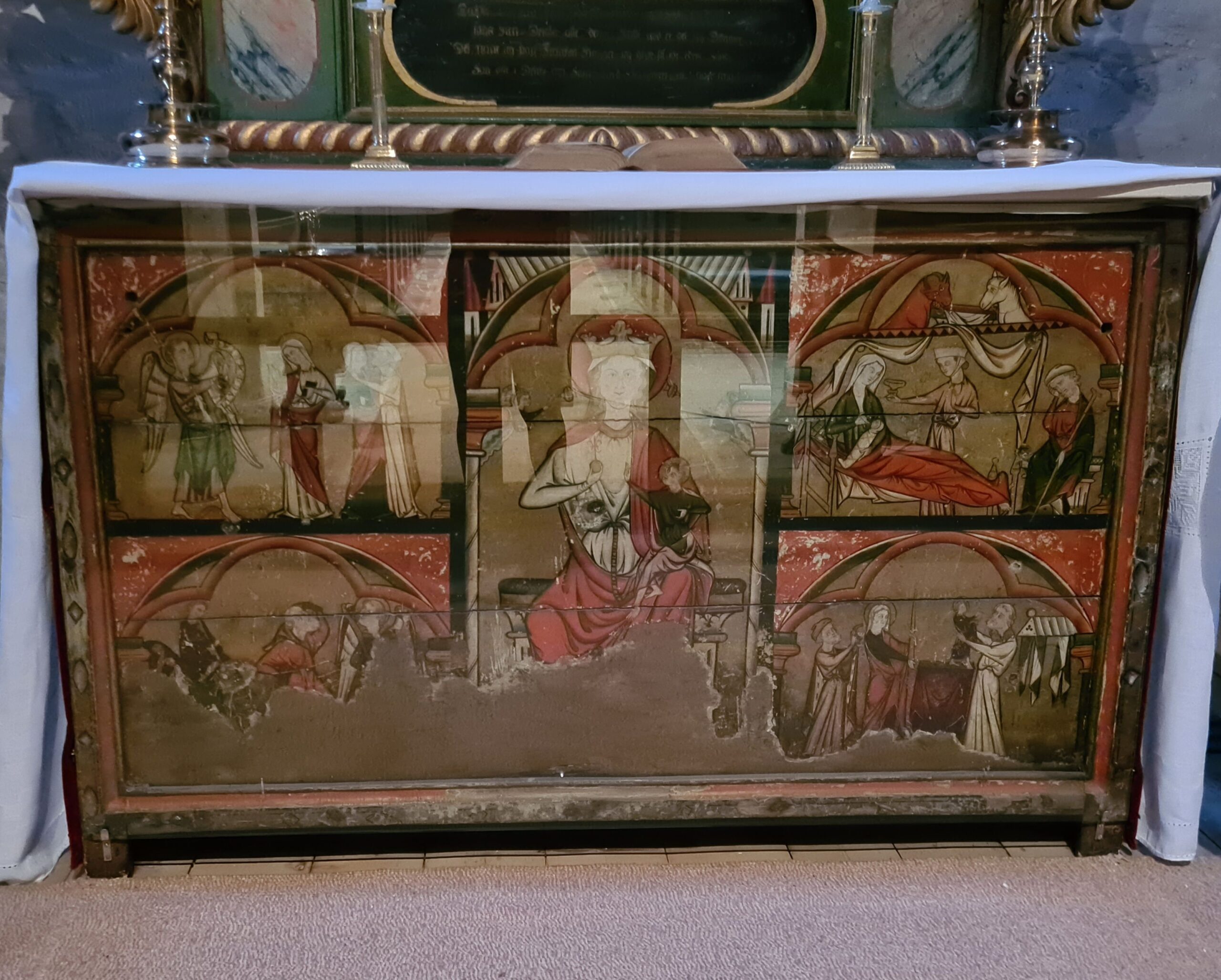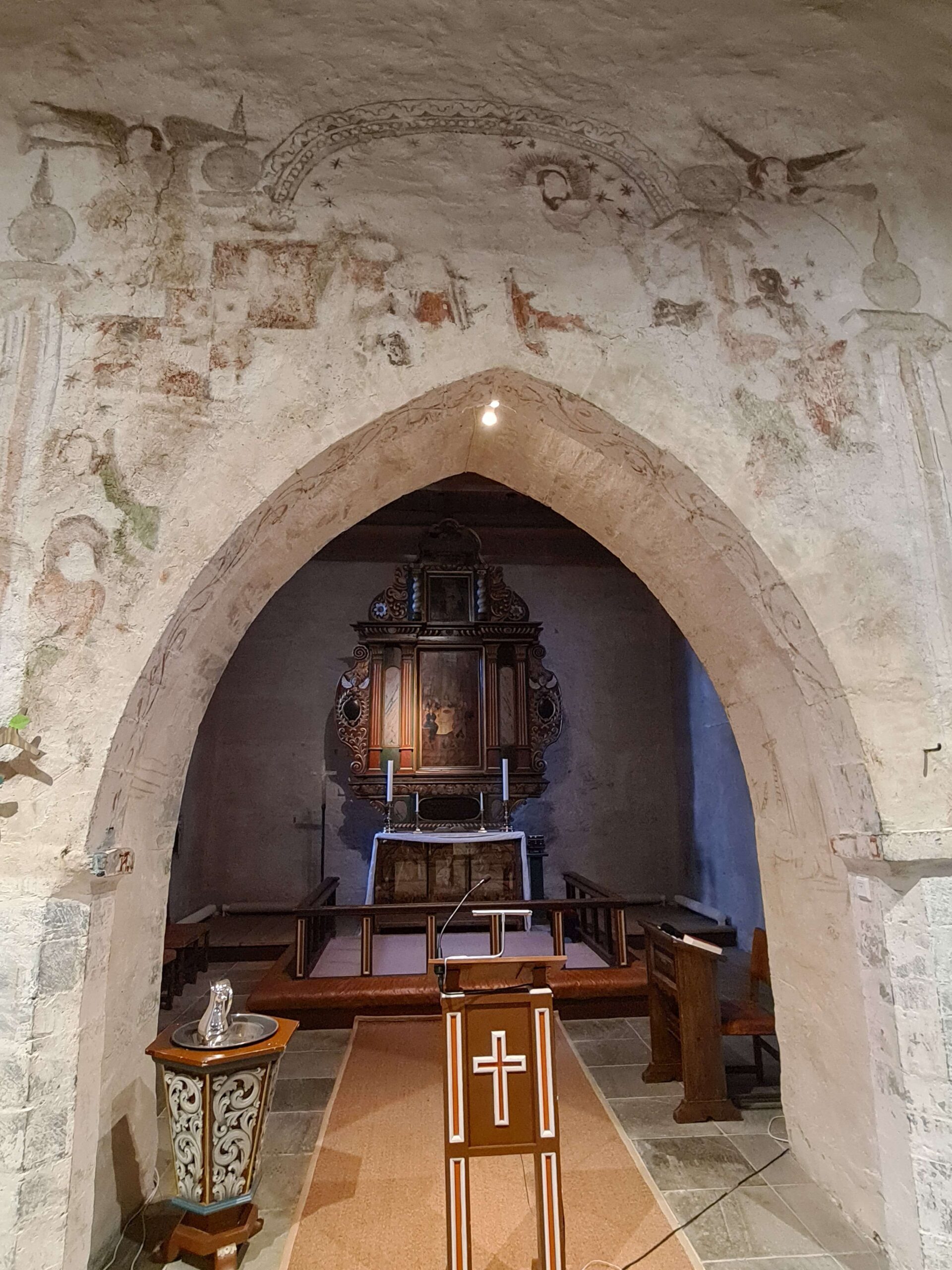 Um etwa 20 Uhr bekamen wir vier dann noch eine Führung durch die Kirche von Skaun. Die Kirche stammt von 1180 und erhielt kürzlich ein neues Dach. Eine Besonderheit ist das Altarbild, das aus dem Mittelalter stammt und noch immer an seinem ursprünglichen Platz in der Kirche ist. Vergleichbare Altarbilder sind sonst in Norwegen nur noch in Museen zu finden.