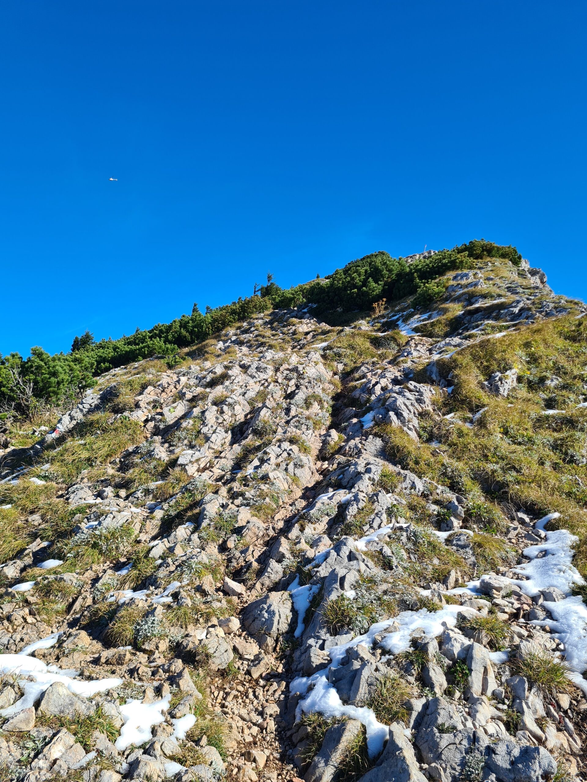 Obwohl es von der Bergstation bis zum Gipfel nicht einmal drei Kilometer sind, war die Gehzeit mit eineinhalb Stunden angegeben und so lange brauchte ich dann auch. Ich hatte nicht gedacht, dass die Wanderung „nur“ zum Gipfel so anstrengend werden würde, aber diese 500 Höhenmeter hatten es durchaus in sich. Schließlich war aber endlich das Ziel in Sicht und es ging nun etwas flacher das letzte Stück zum Gipfelkreuz.