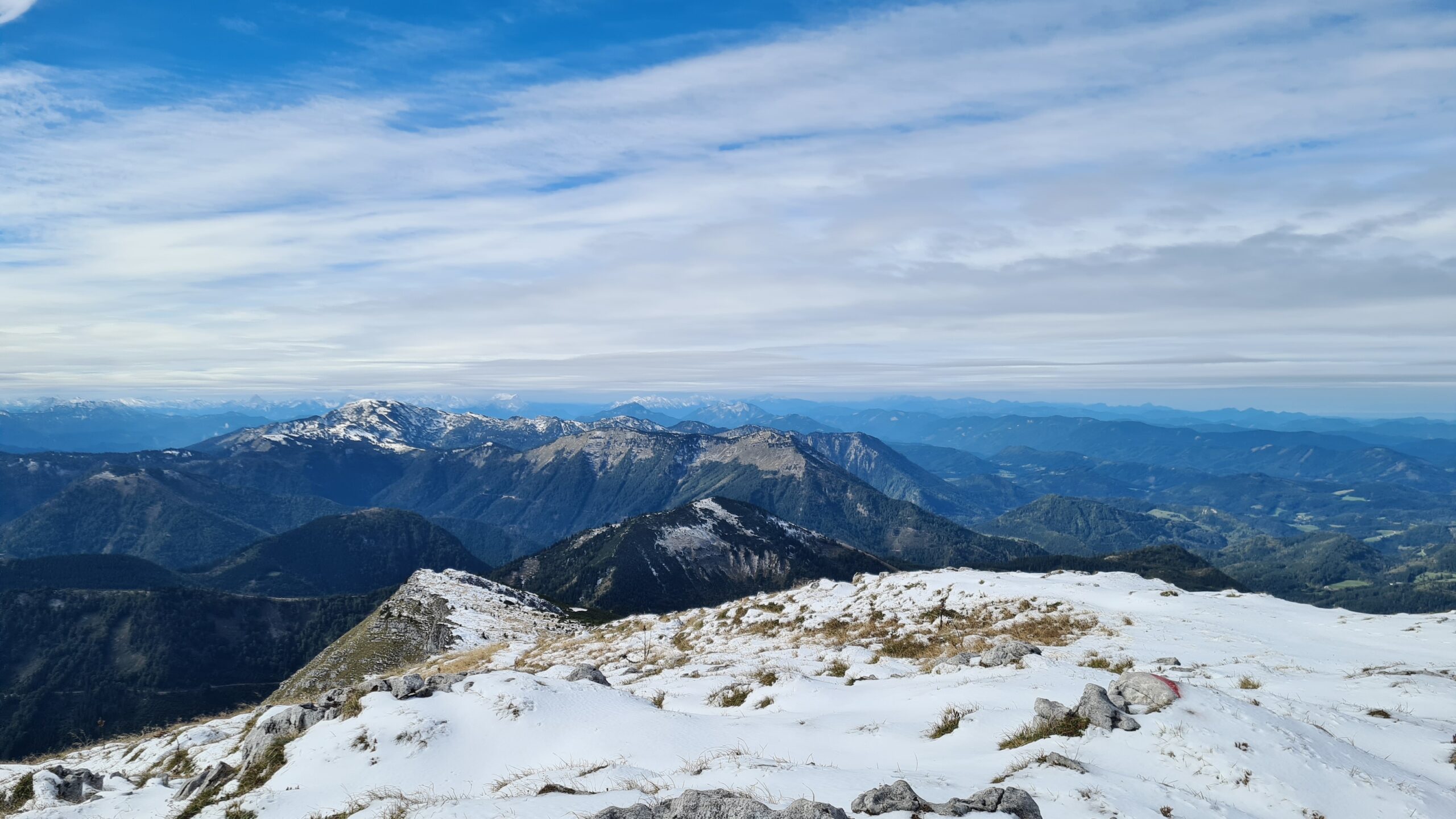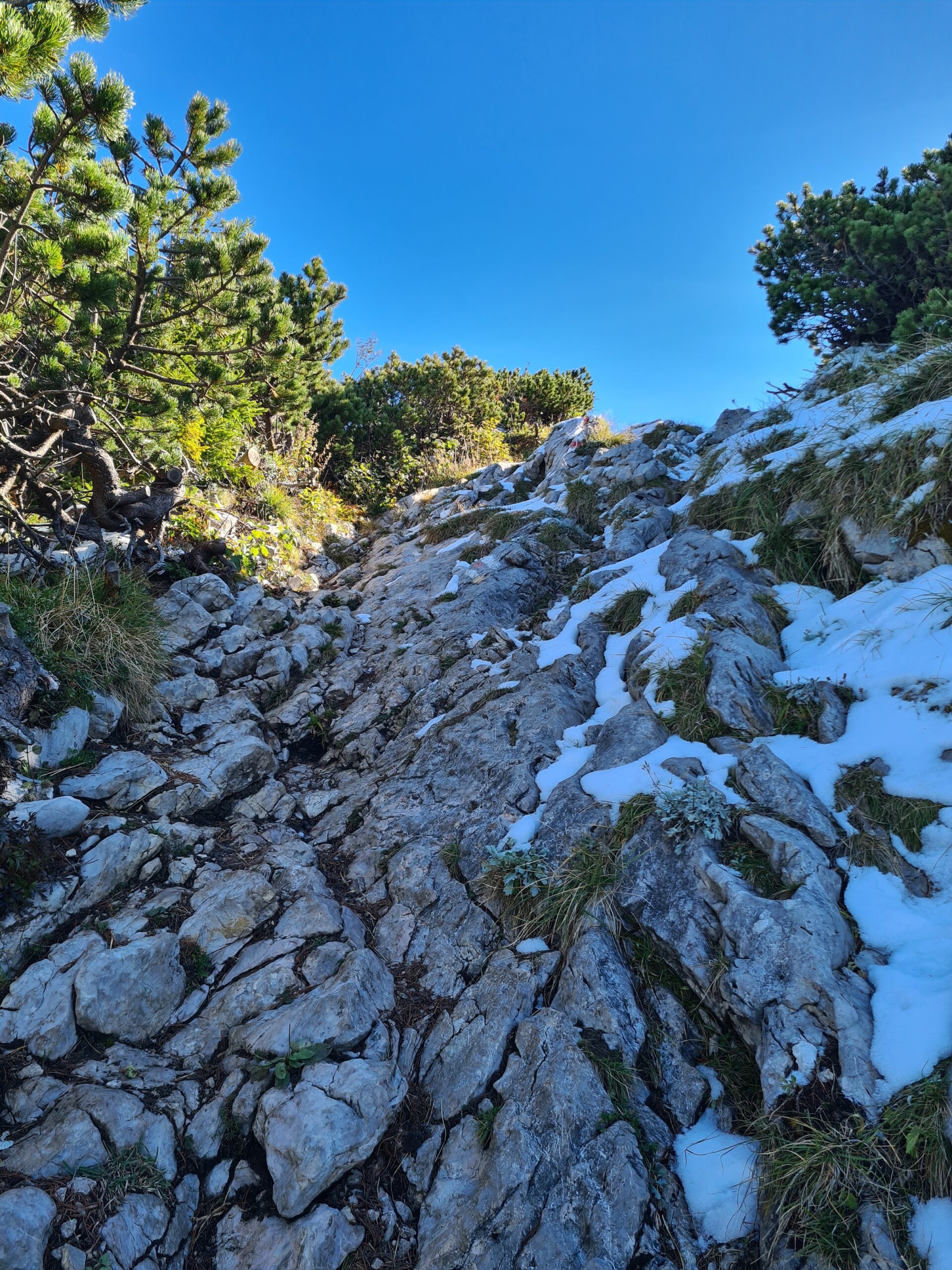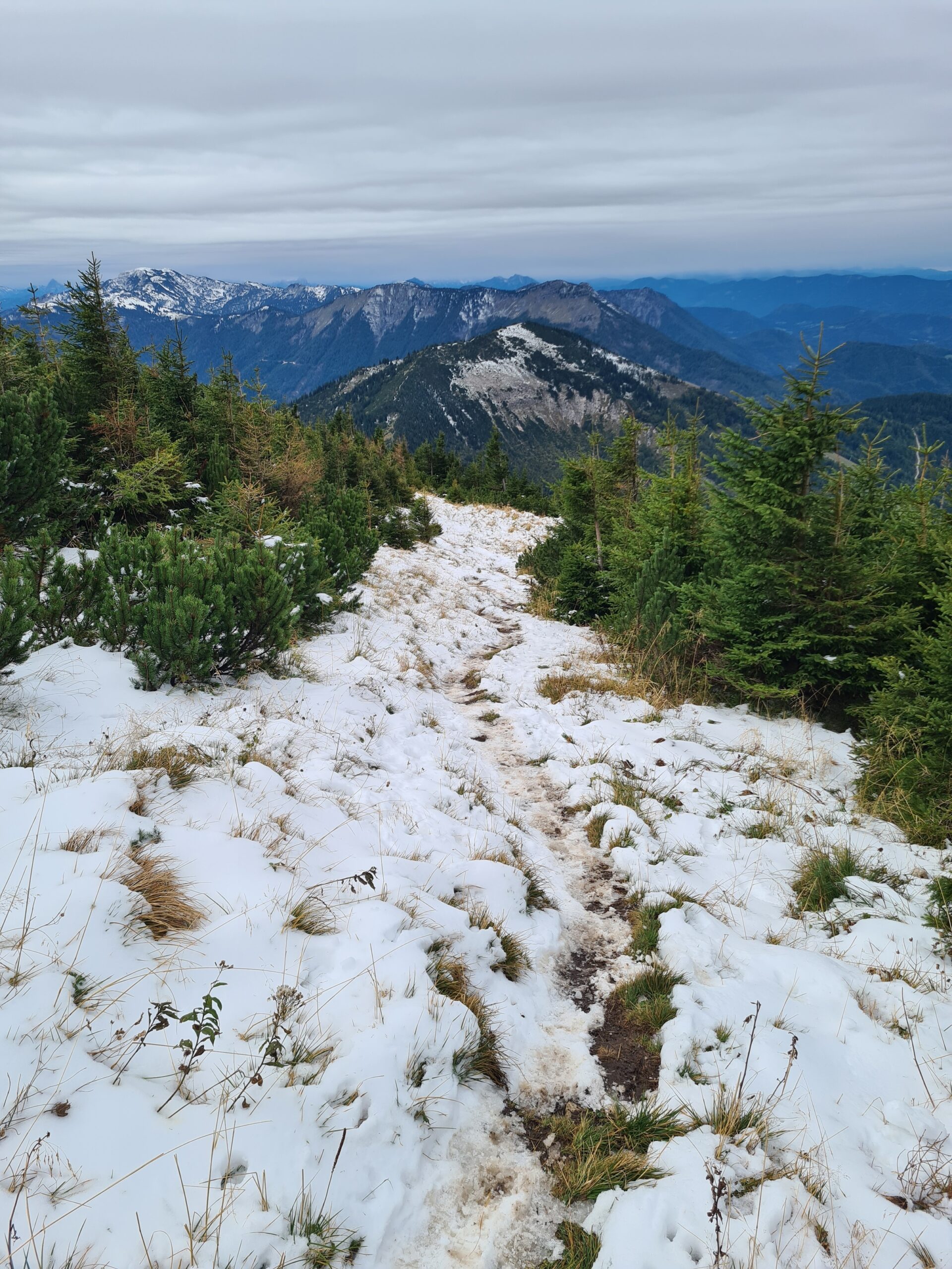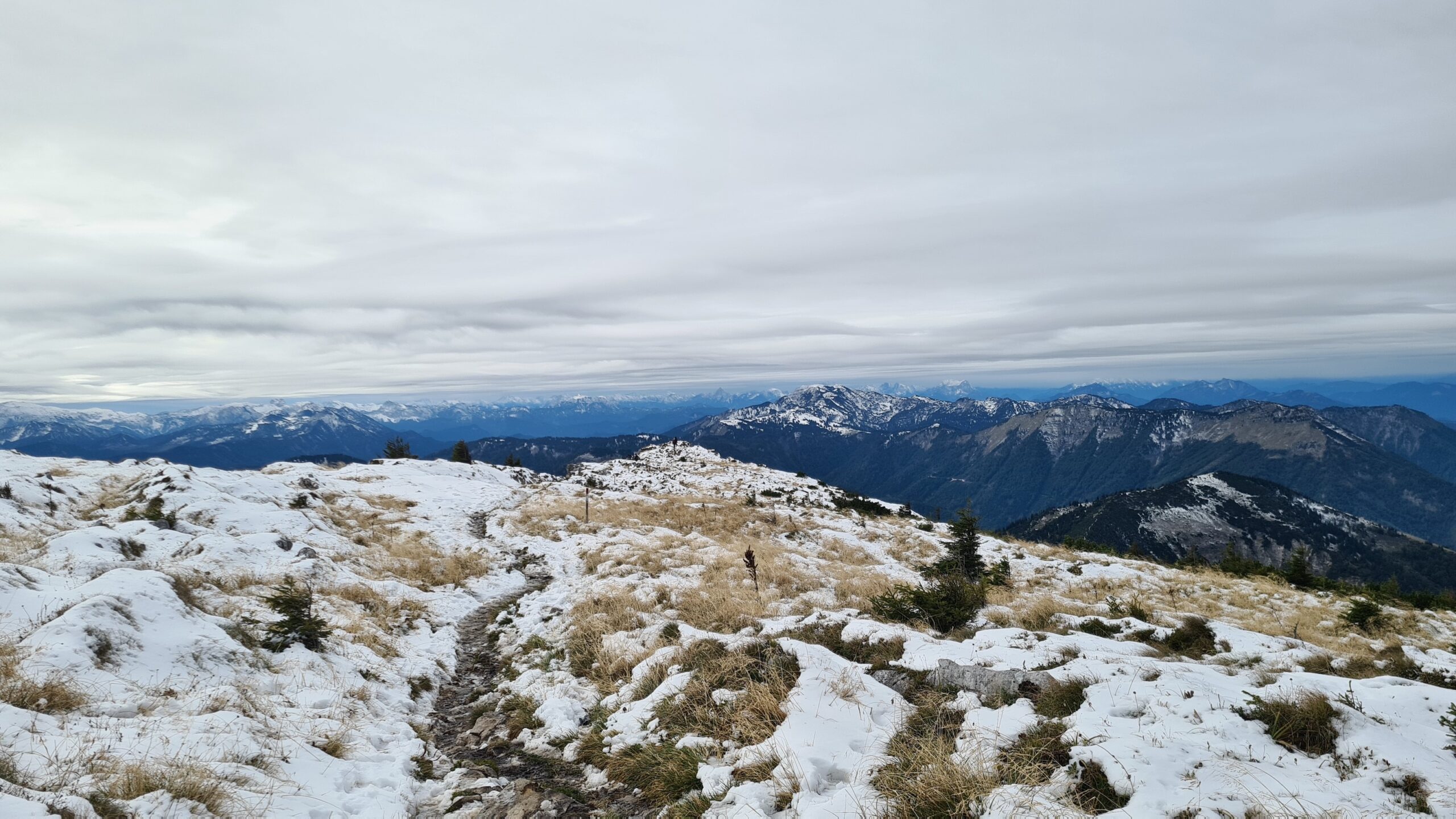 Das Panorama war einfach fantastisch, auch wenn nun leider immer mehr Wolken aufzogen und zunehmend die Berge im Westen verhüllten. Da meine Finger inzwischen die reinsten Eiszapfen waren, machte ich mich daher an den Abstieg. Ich schnallte die Grödel an meine Schuhe und wählte für den Abstieg eine Variante über den Latschenweg. Da hier viel Schnee und matschige Stellen waren, ging das mit den Grödeln richtig gut; nur auf felsigen Abschnitten war es damit etwas mühsam.