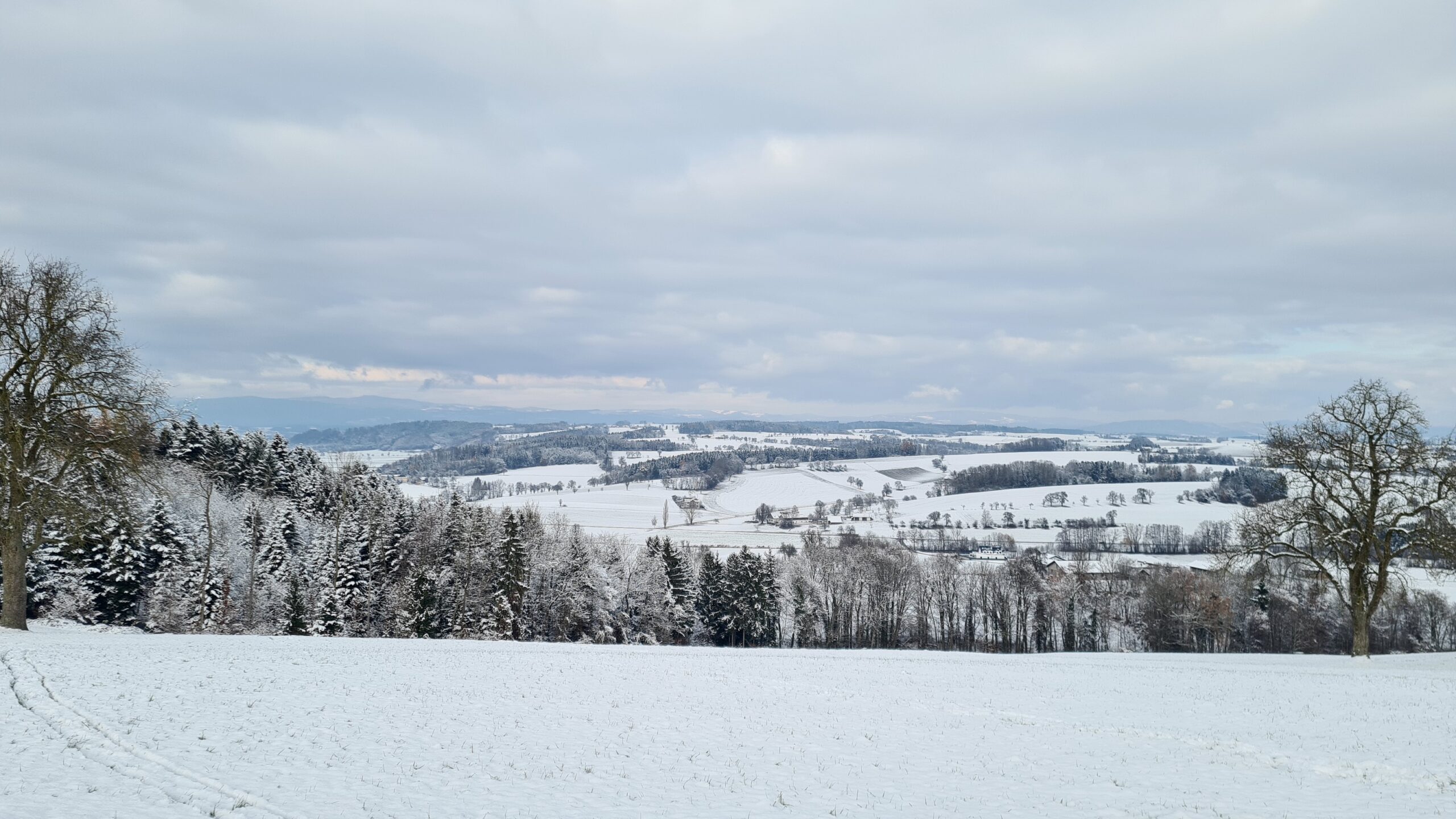 Ab Steinfeldberg ging es nun auf einer Straße entlang, die schöne Blicke in alle Richtungen ermöglichte. Von den Bergen im Süden war allerdings bei den tiefhängenden Wolken nichts zu sehen. Die Sonne blinzelte zwar ab und zu durch die Wolken, schaffte aber nie so ganz den Durchbruch.