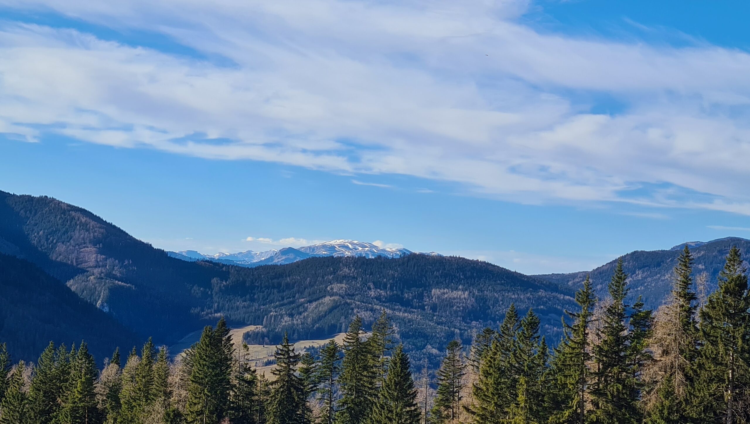 Im Sommer wäre sicher der Weg durch den Wald schöner – oder wenn man keine Lust auf Asphalt hat. Wenn man es gemütlich angehen möchte, ist der Weg auf der Straße aber auch eine gute Möglichkeit, da es durch die weite Schleife in sehr gemäßigter Steigung bergauf ging. In Orthof hatte ich zudem einen schönen Blick auf die Rax und kurz darauf auf den Schneeberg.