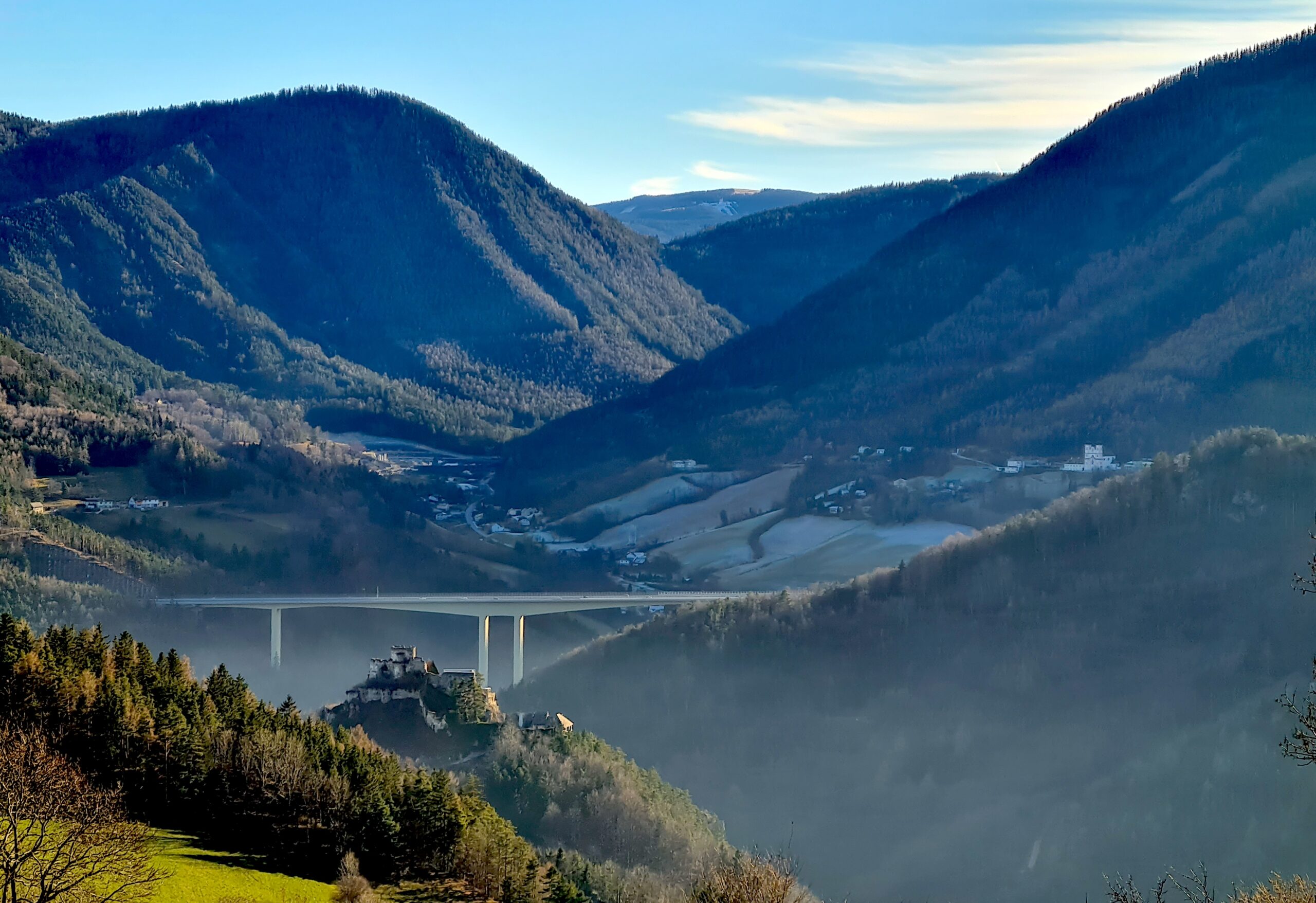 Kurz nach dem Gasthaus gab es auch einen schönen Blick zur Burgruine Klamm sowie zur Wallfahrtskirche Maria Schutz. Nur der Talübergang der Semmeringer Schnellstraße dazwischen störte das idyllische Bild.