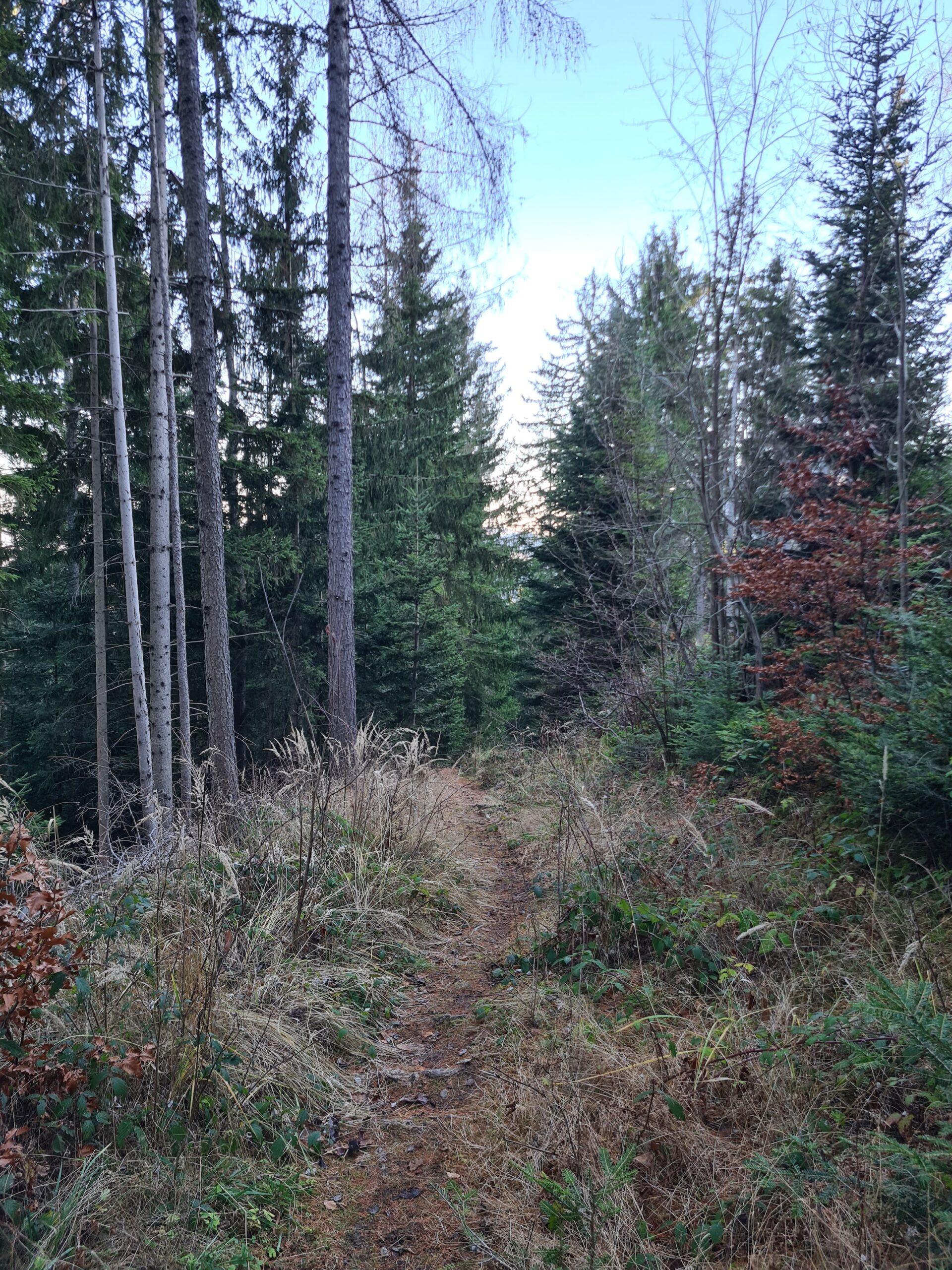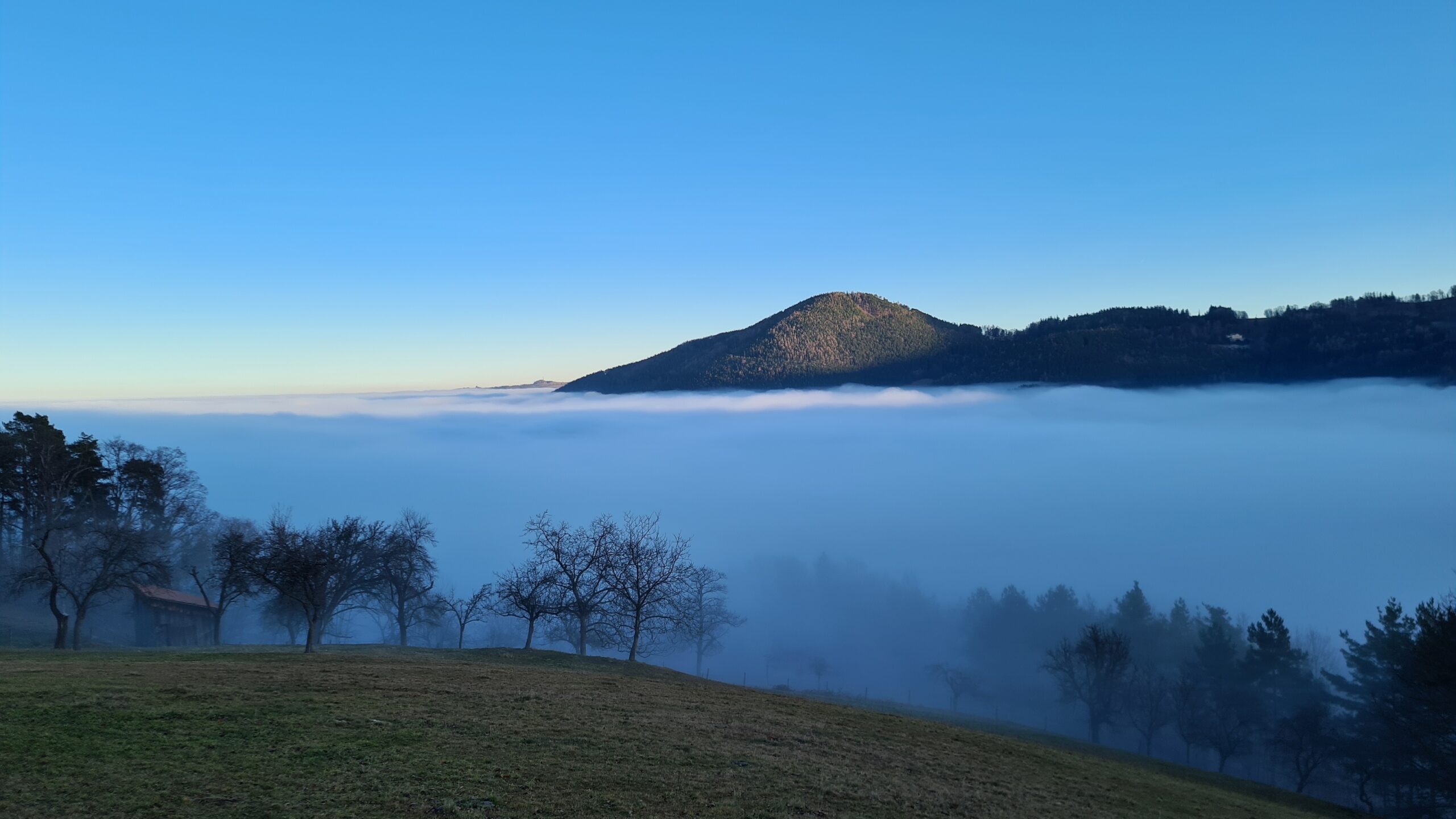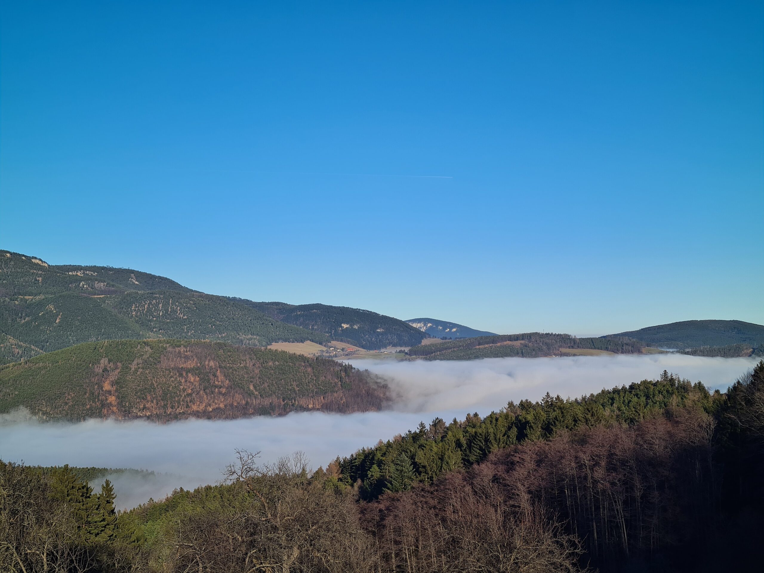 Als ich wieder in den Wald eintauchte, nahm ich eine falsche Abzweigung, die am Kobermannsberg in einer Sackgasse endete. Dieser ungeplante kleine Abstecher lohnte sich aber insofern, da ich nun einen Blick auf das Nebelmeer im Tal hatte.