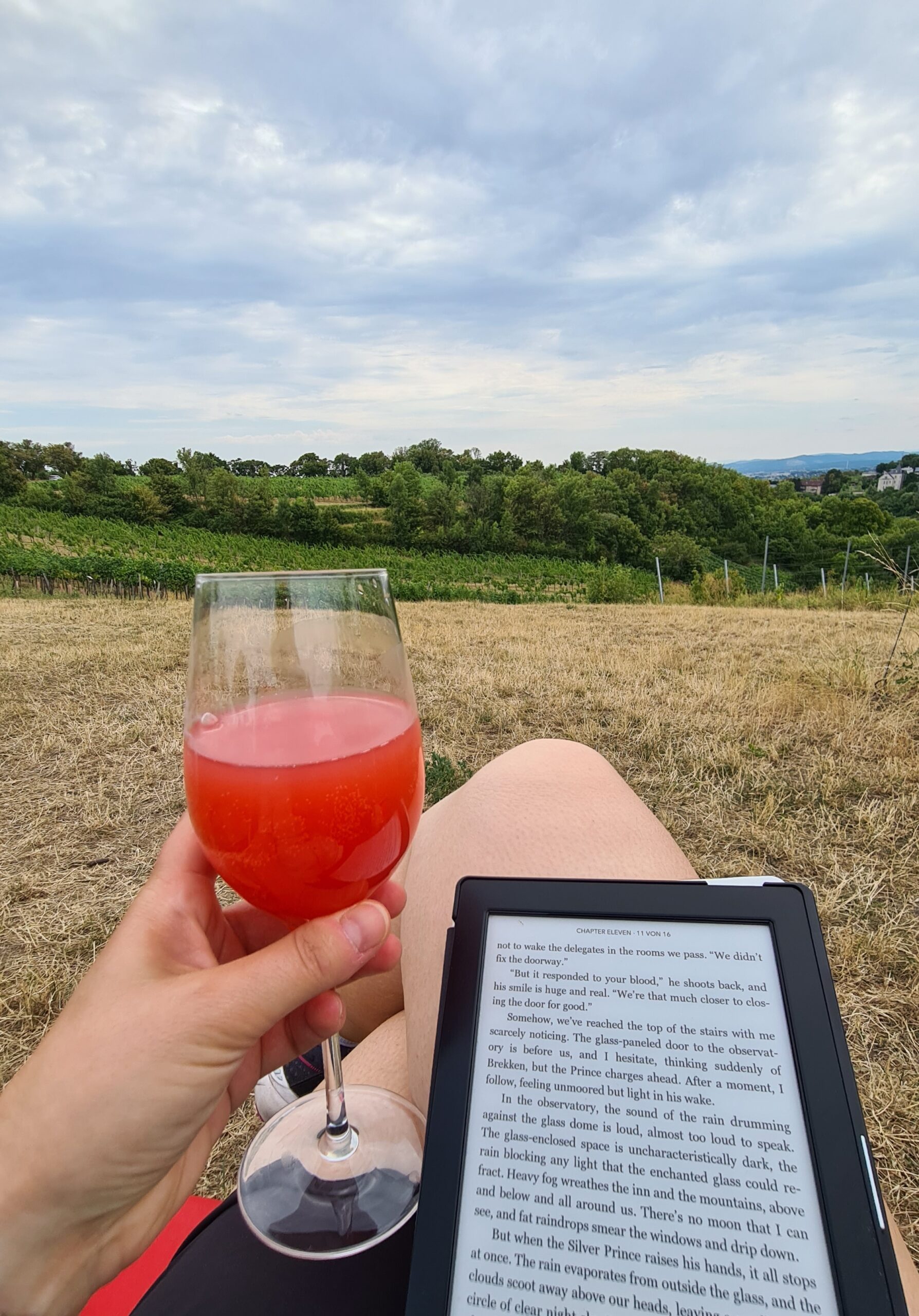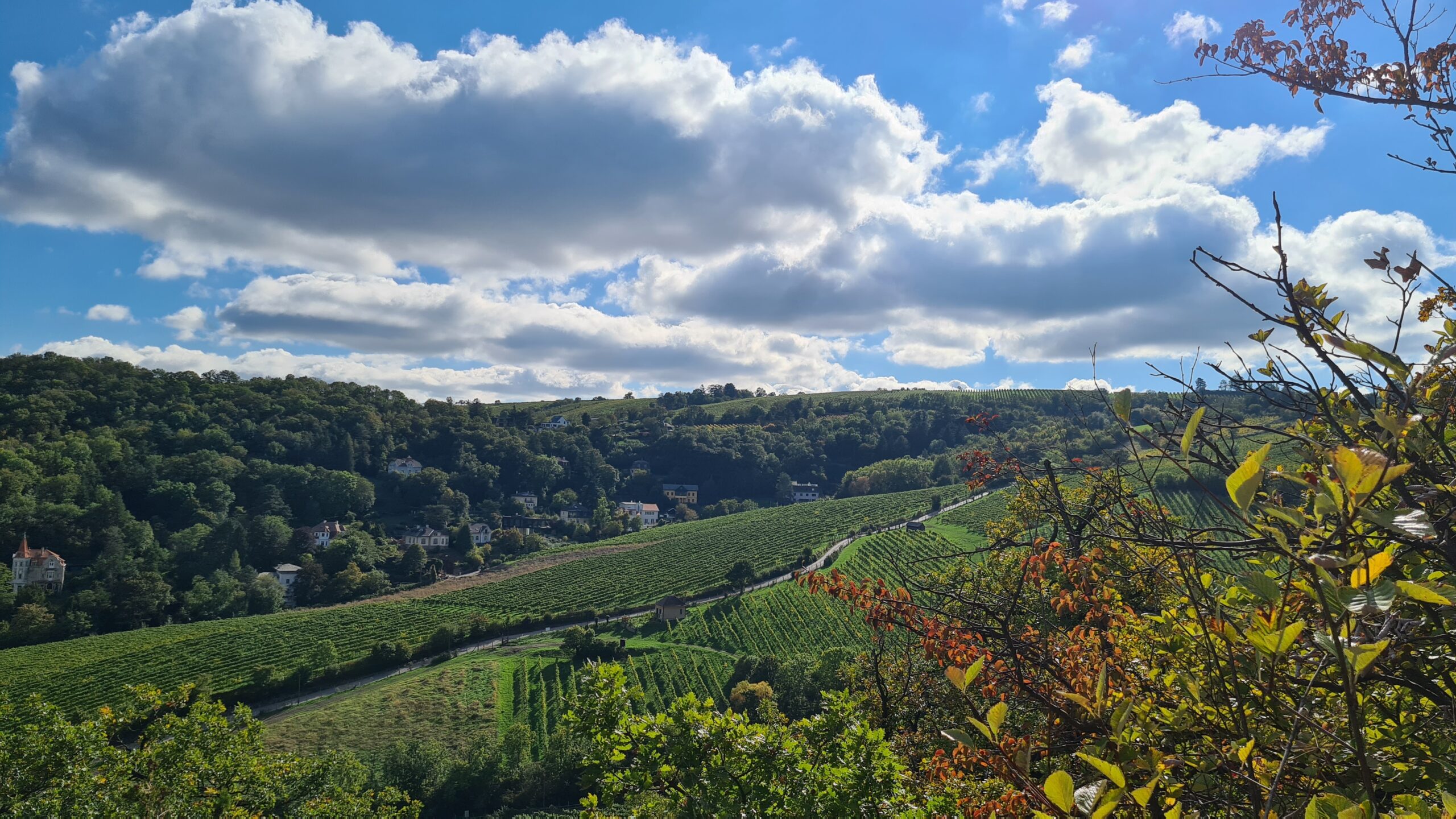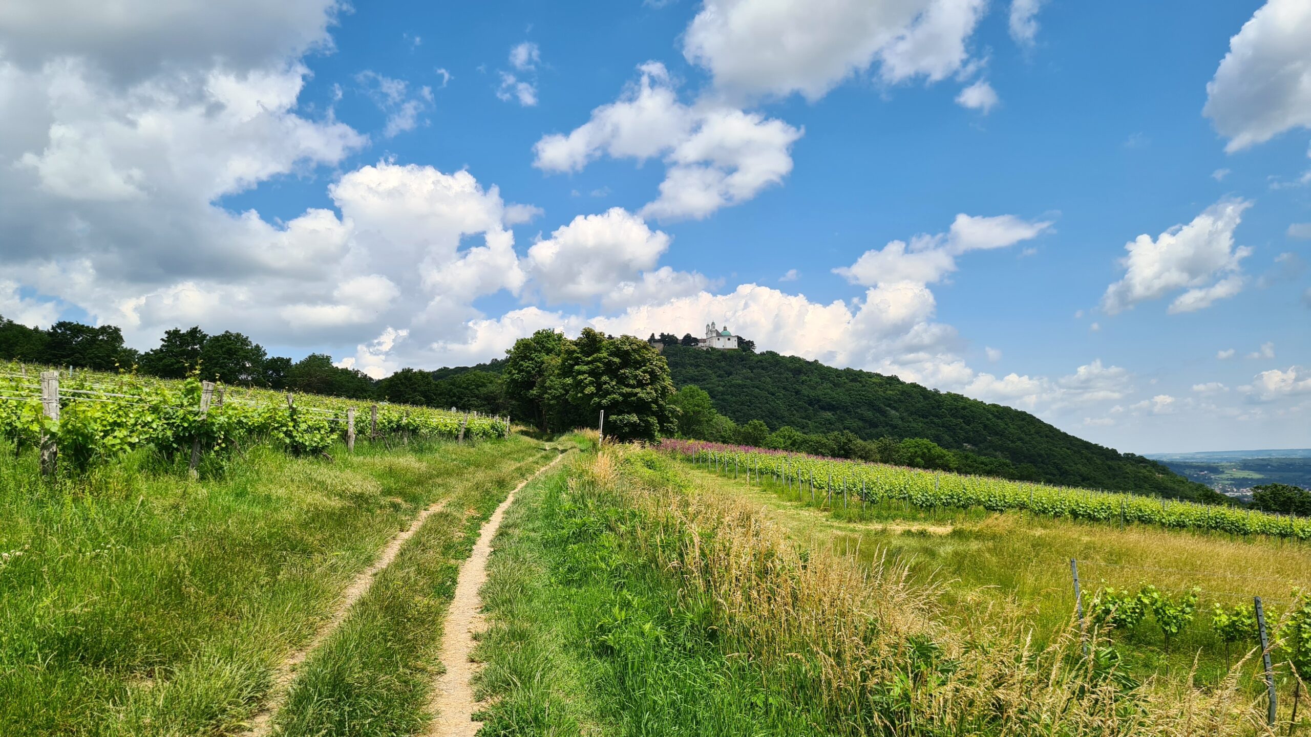 Vom Kahlenberg geht es nun bergab, zunächst recht gemütlich durch Weinberge und an Heurigen vorbei.