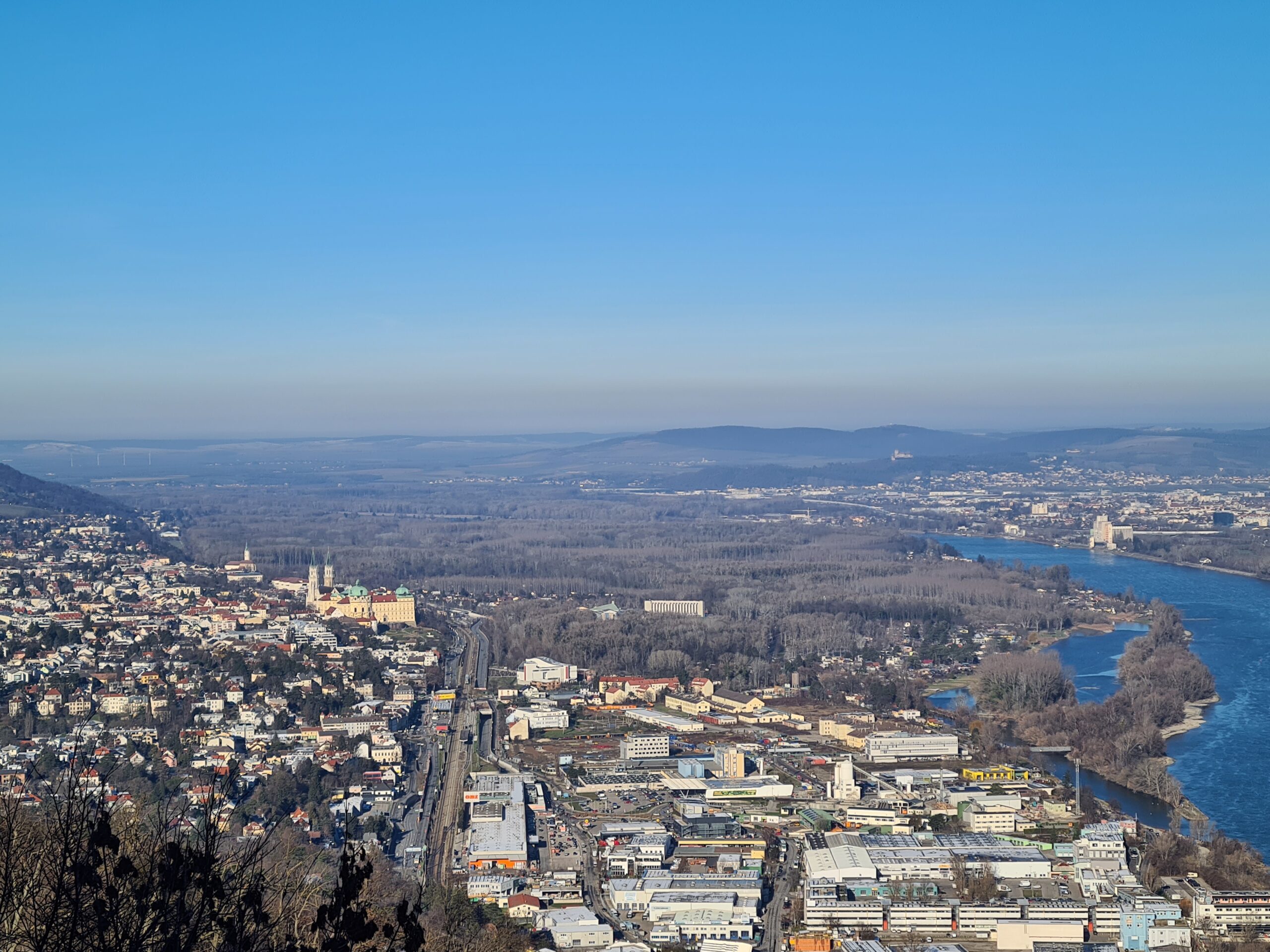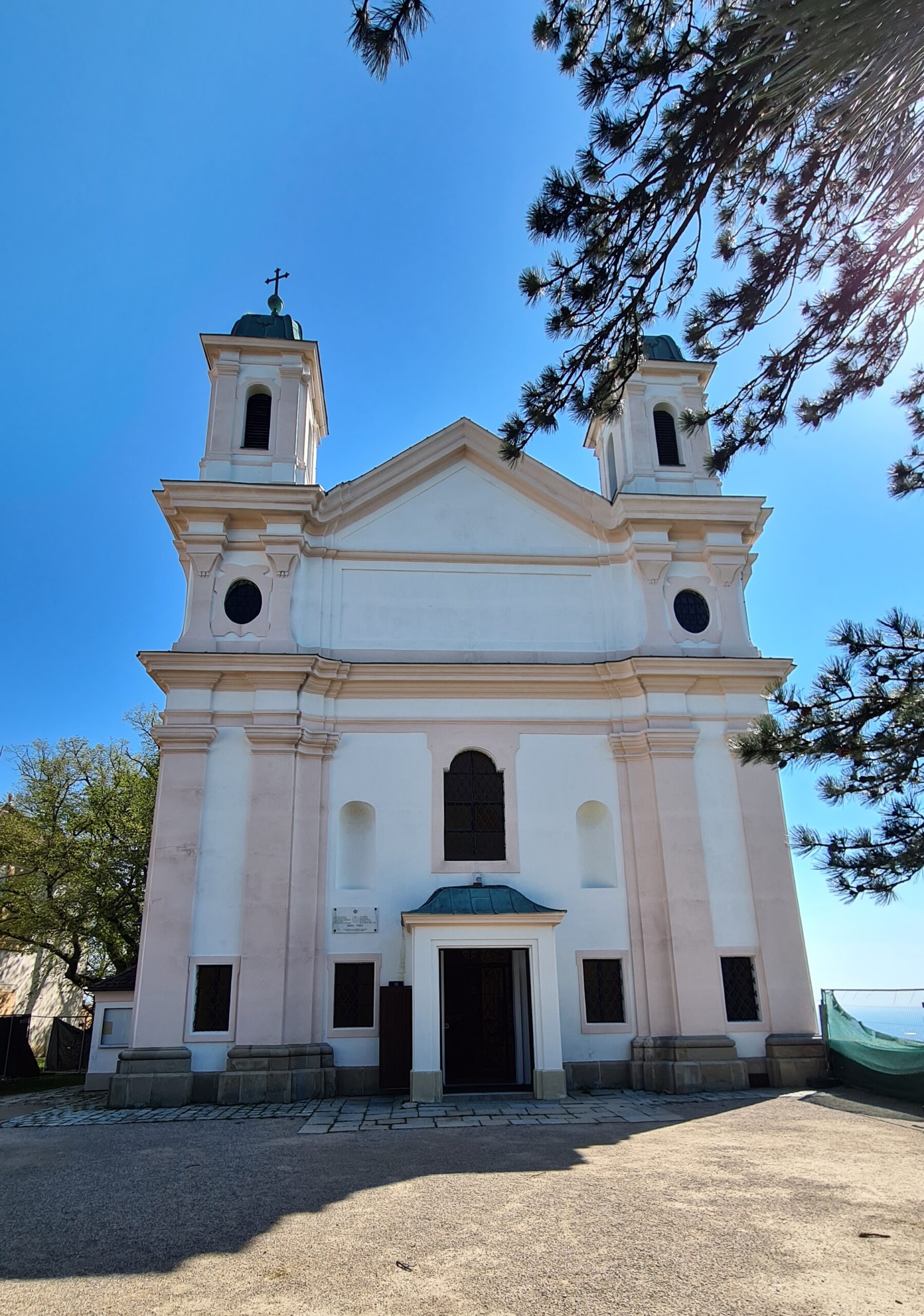 Nach weiteren etwa 10 Minuten Anstieg erreicht man die Kirche am Leopoldsberg, wo man neben weiteren Blicken auf Wien nun auch ein schönes Panorama auf Klosterneuburg hat.