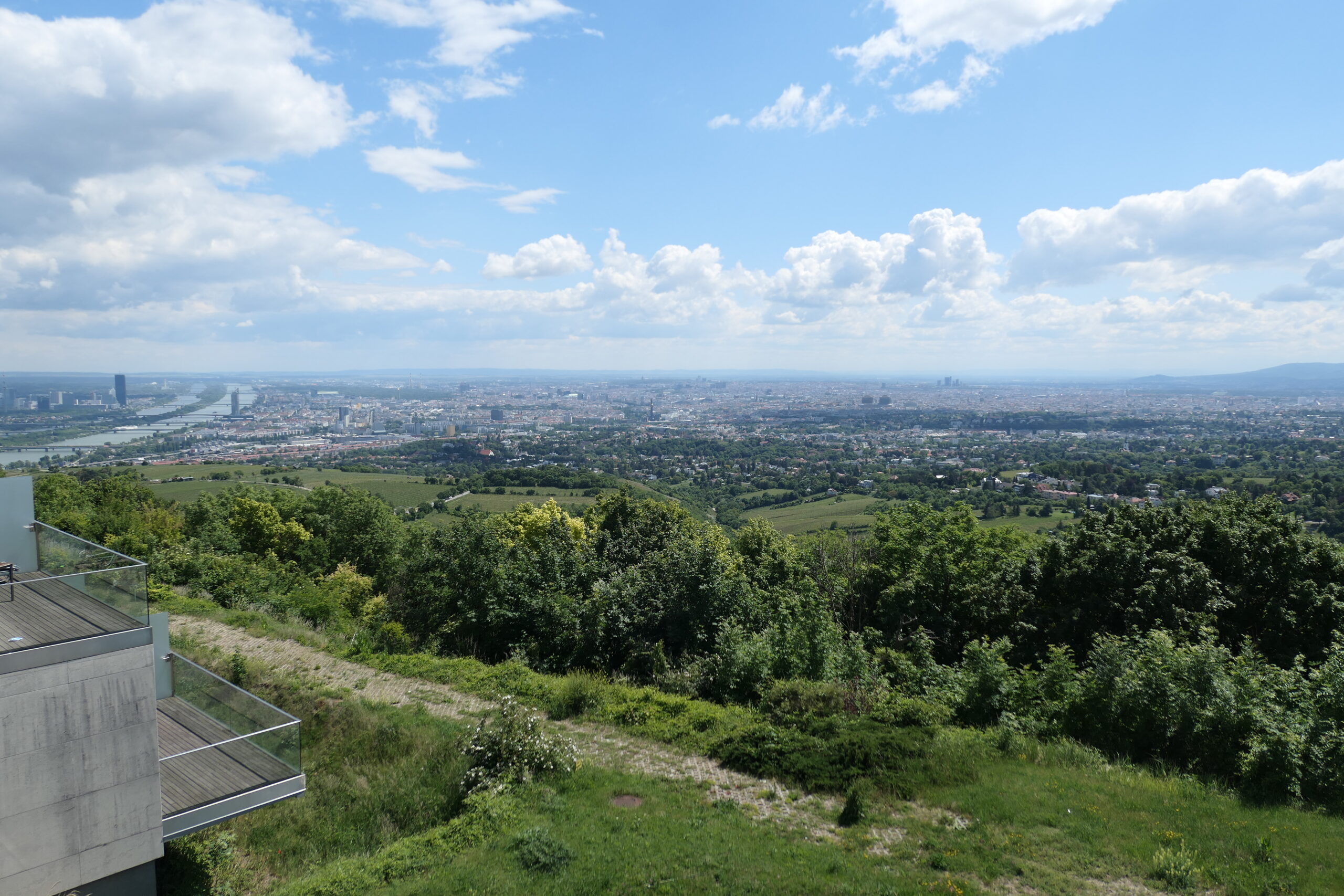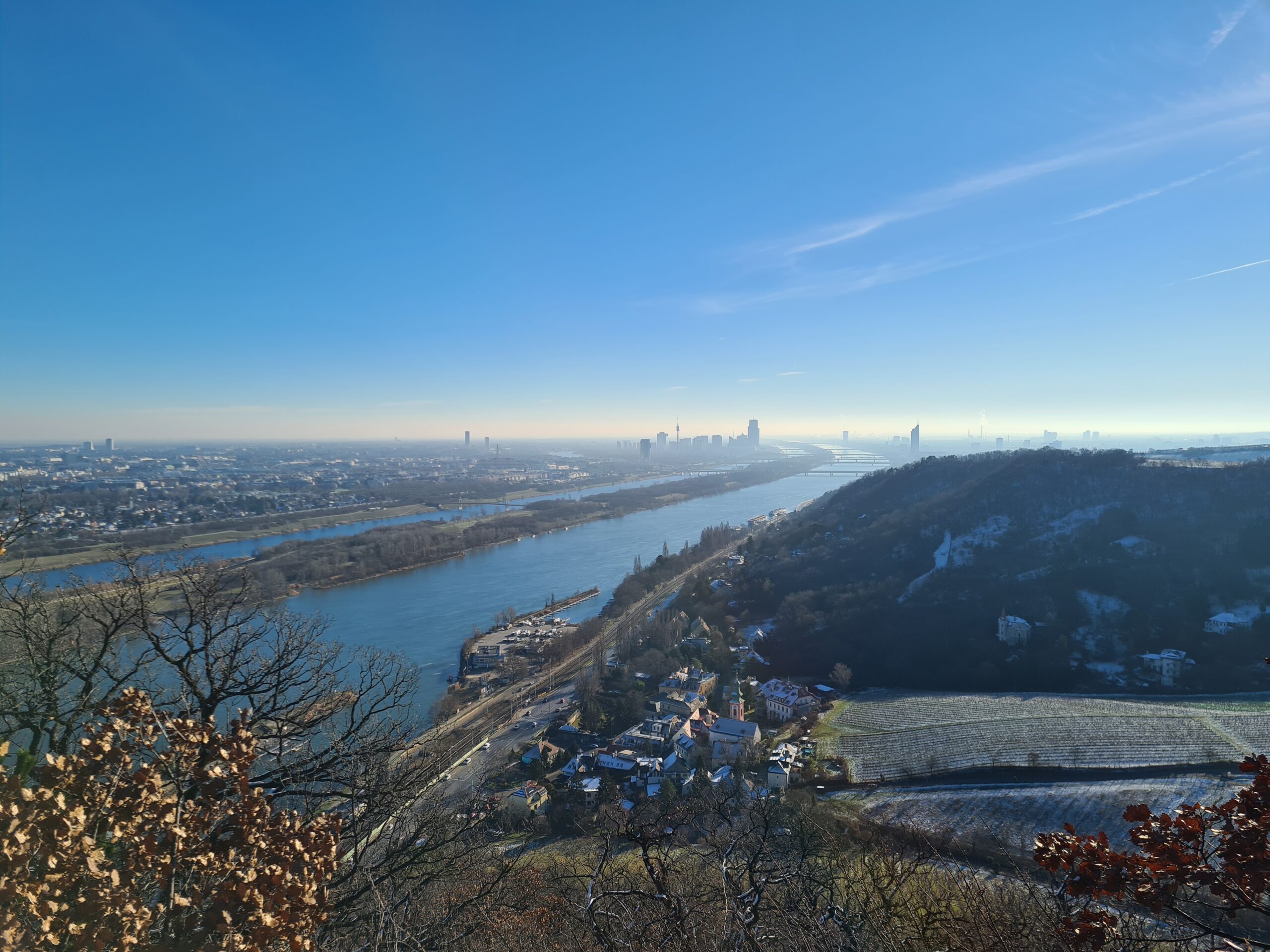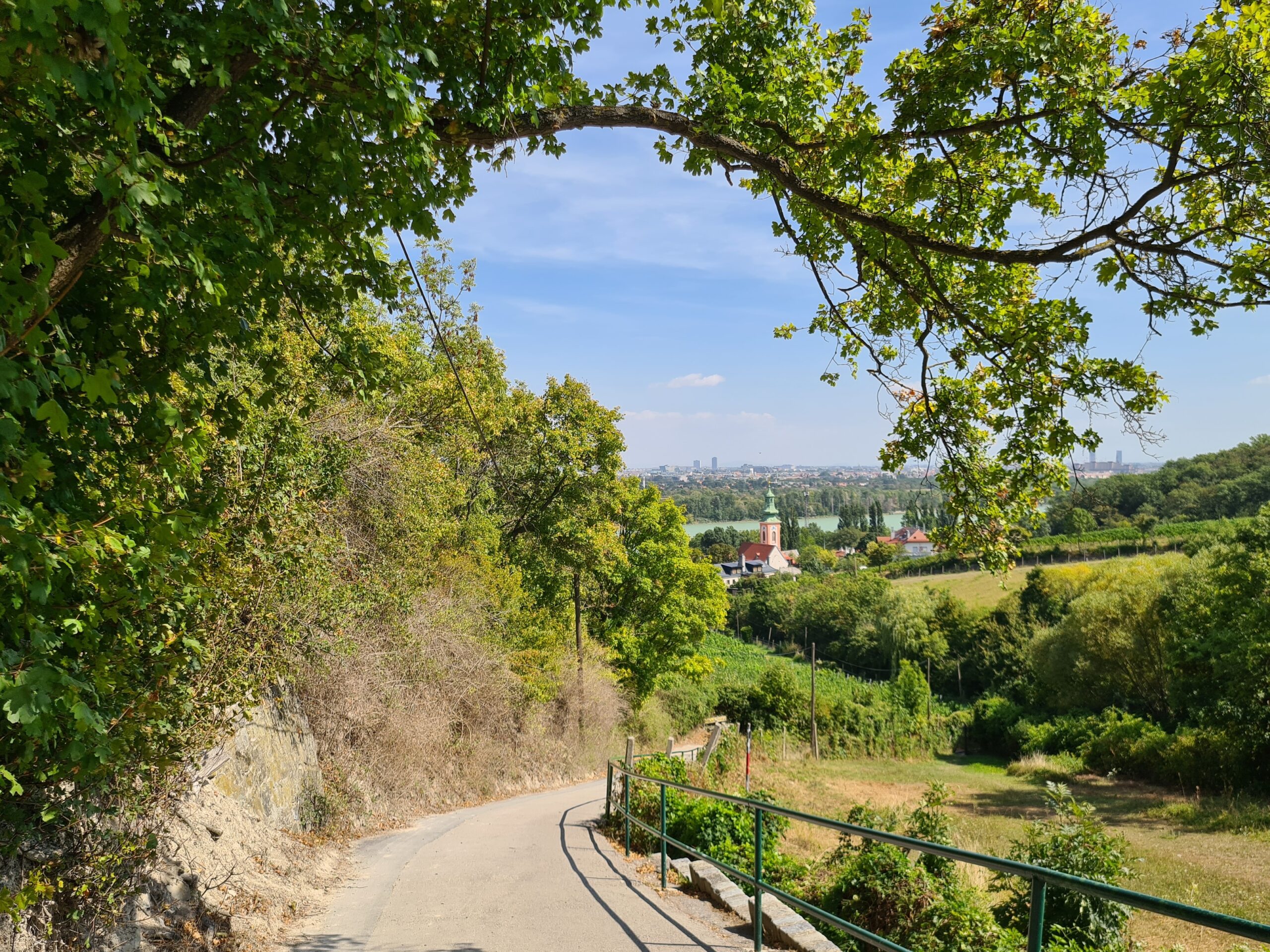 Nach etwa zwei Drittel des Weges gibt es eine Aussichtsplattform mit schönen Ausblicken auf die Kirche von Kahlenbergerdorf, die umliegenden Weinberge und auf Wien.