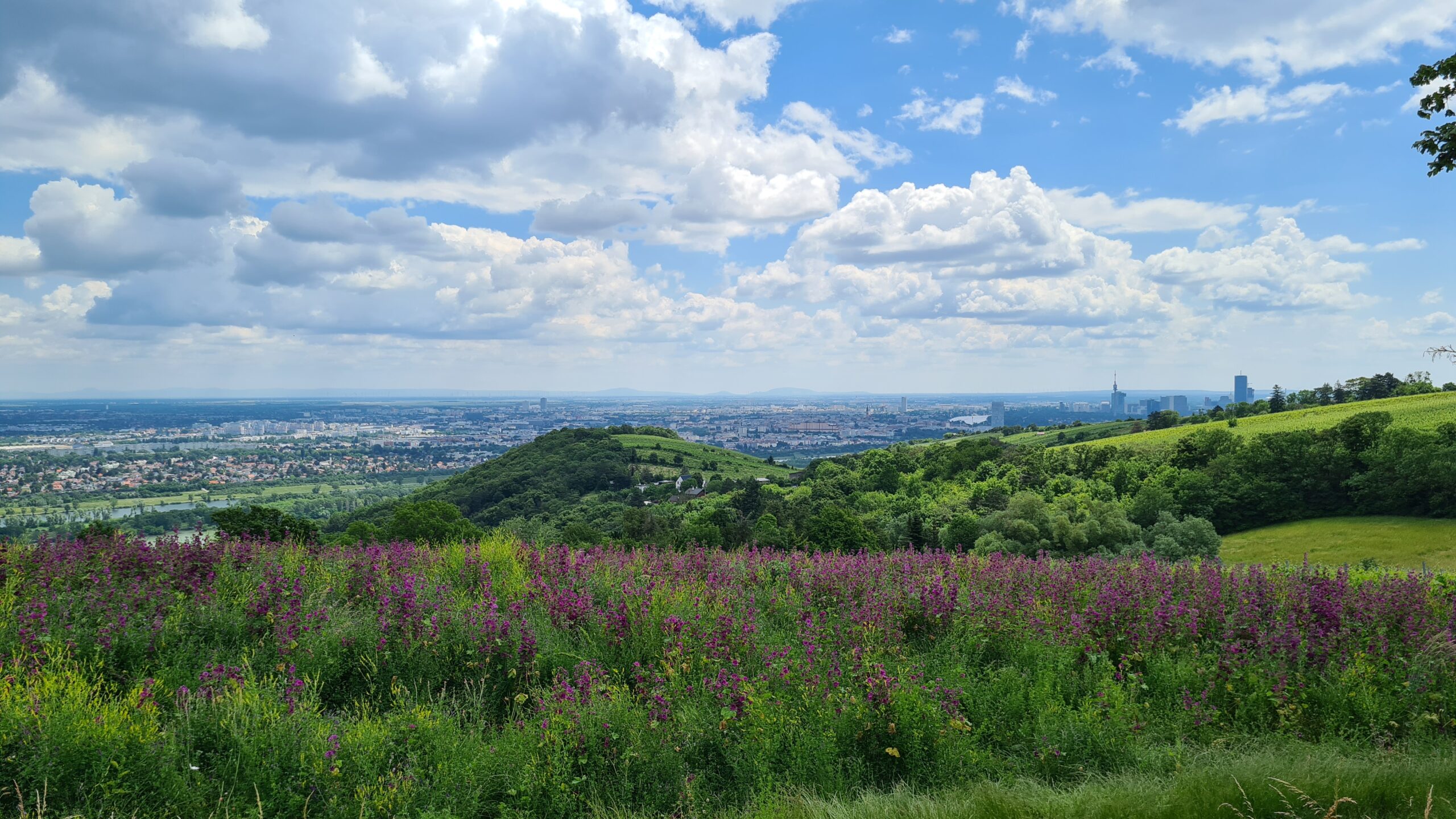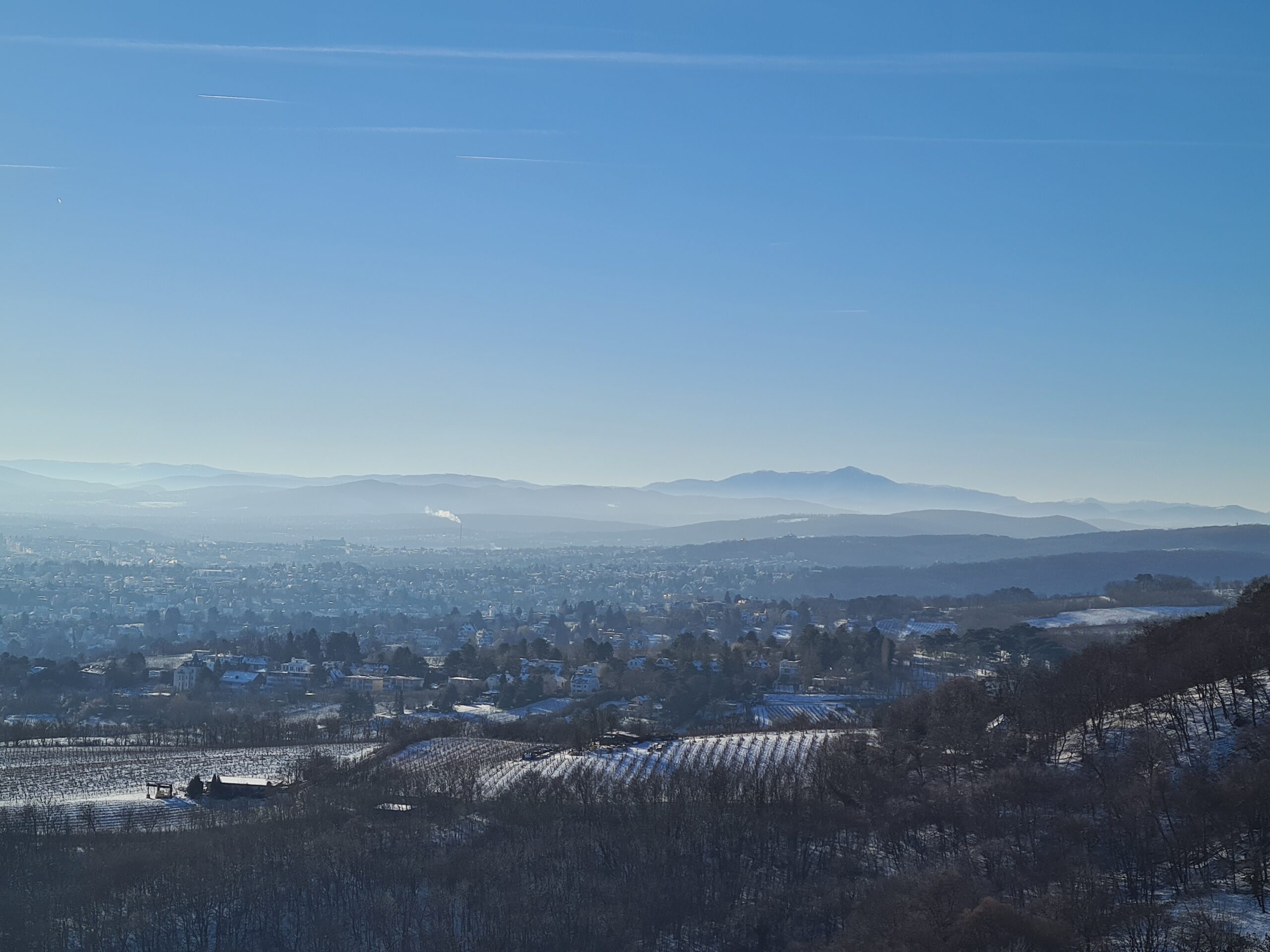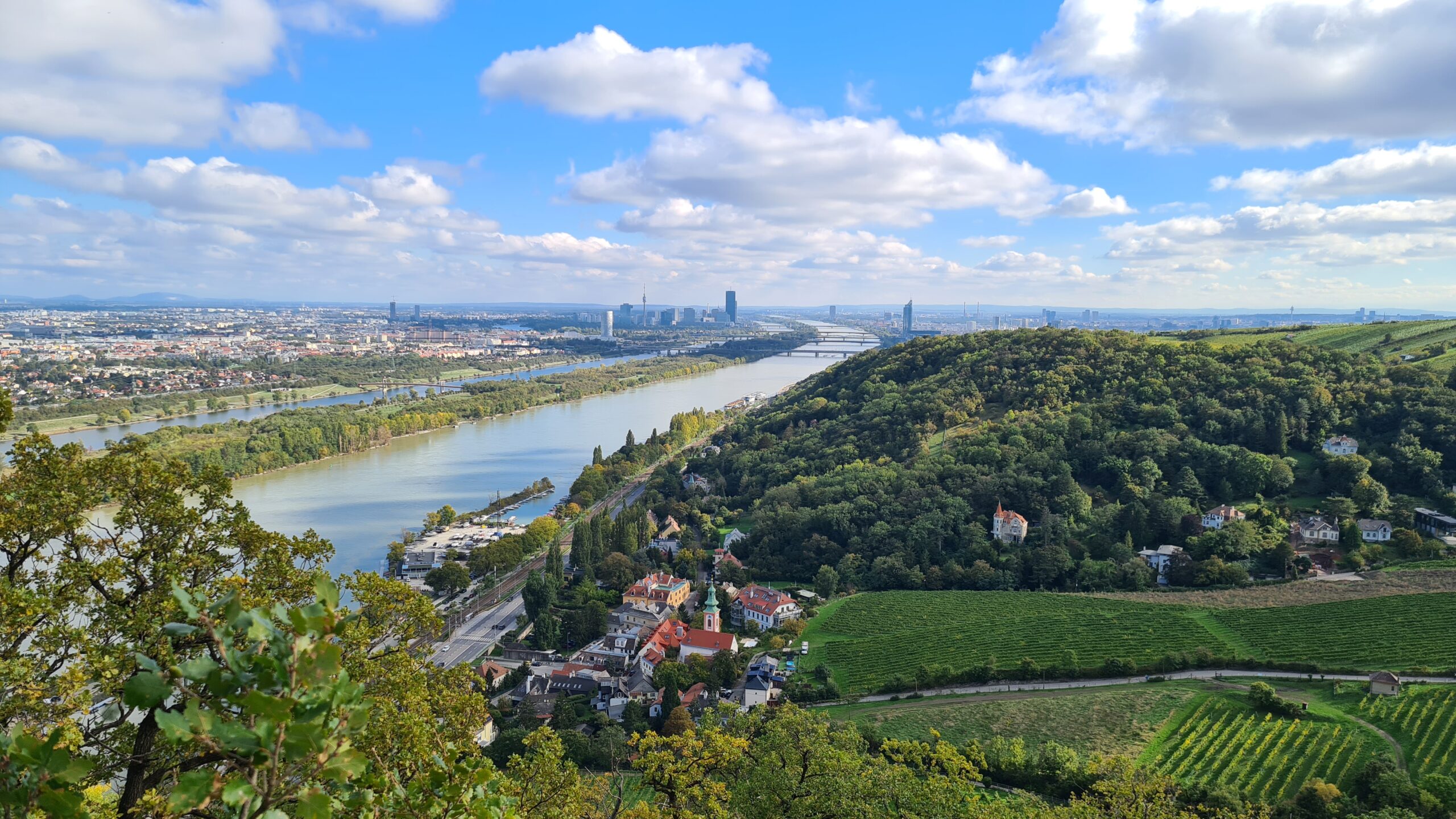 Nach etwa zwei Drittel des Weges gibt es eine Aussichtsplattform mit schönen Ausblicken auf die Kirche von Kahlenbergerdorf, die umliegenden Weinberge und auf Wien.