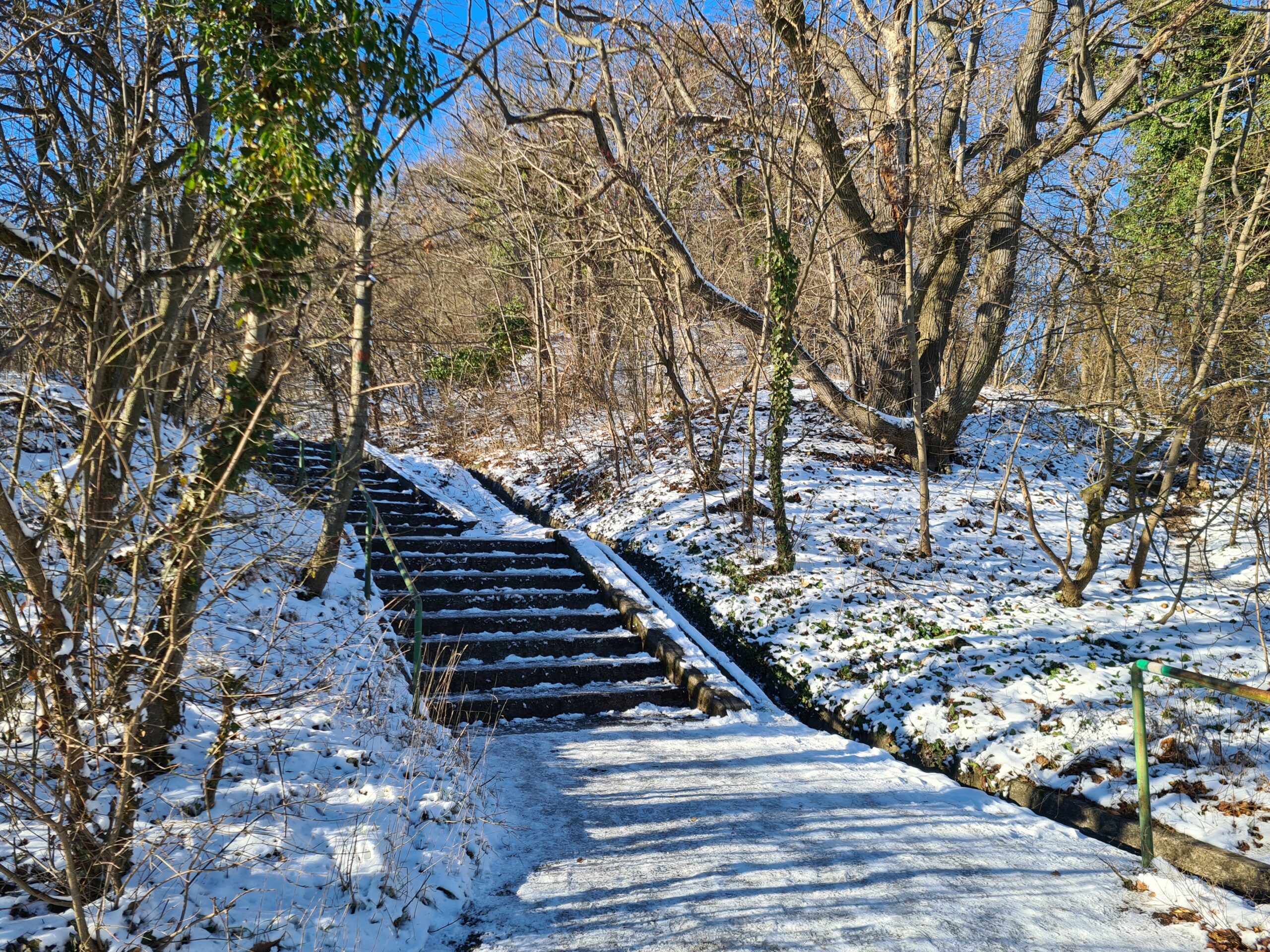 Nachdem man zwei Kilometer an der Donau entlanggegangen oder aber in Kahlenbergerdorf aus dem Bus gestiegen ist, geht es auf dem Nasenweg steil bergauf. Der Name des Weges kommt von dem „Nase“ genannten Steilhang des Leopoldsberges. Der Weg führt teils über Stufen in mehreren Kehren hinauf und ist wohl der steilste Anstieg, den man in Wien finden kann. Dieser Teil der Stadtwanderung ist also ganz schön anstrengend, aber auch einer der Gründe, weshalb ich diesen Weg so mag: Der Nasenweg ist hervorragend geeignet, um ohne lange Anfahrtsweg an der Kondition zu arbeiten.