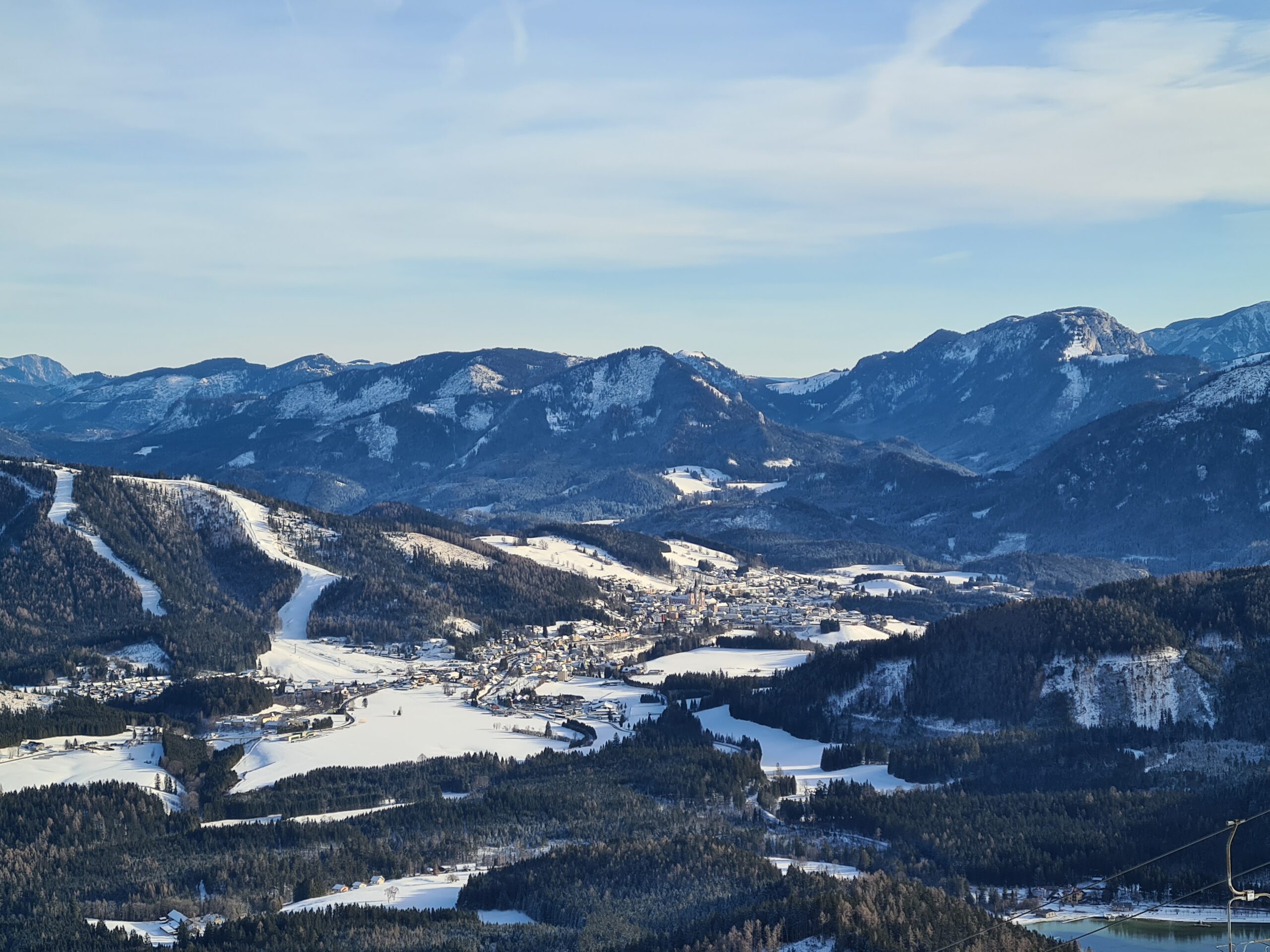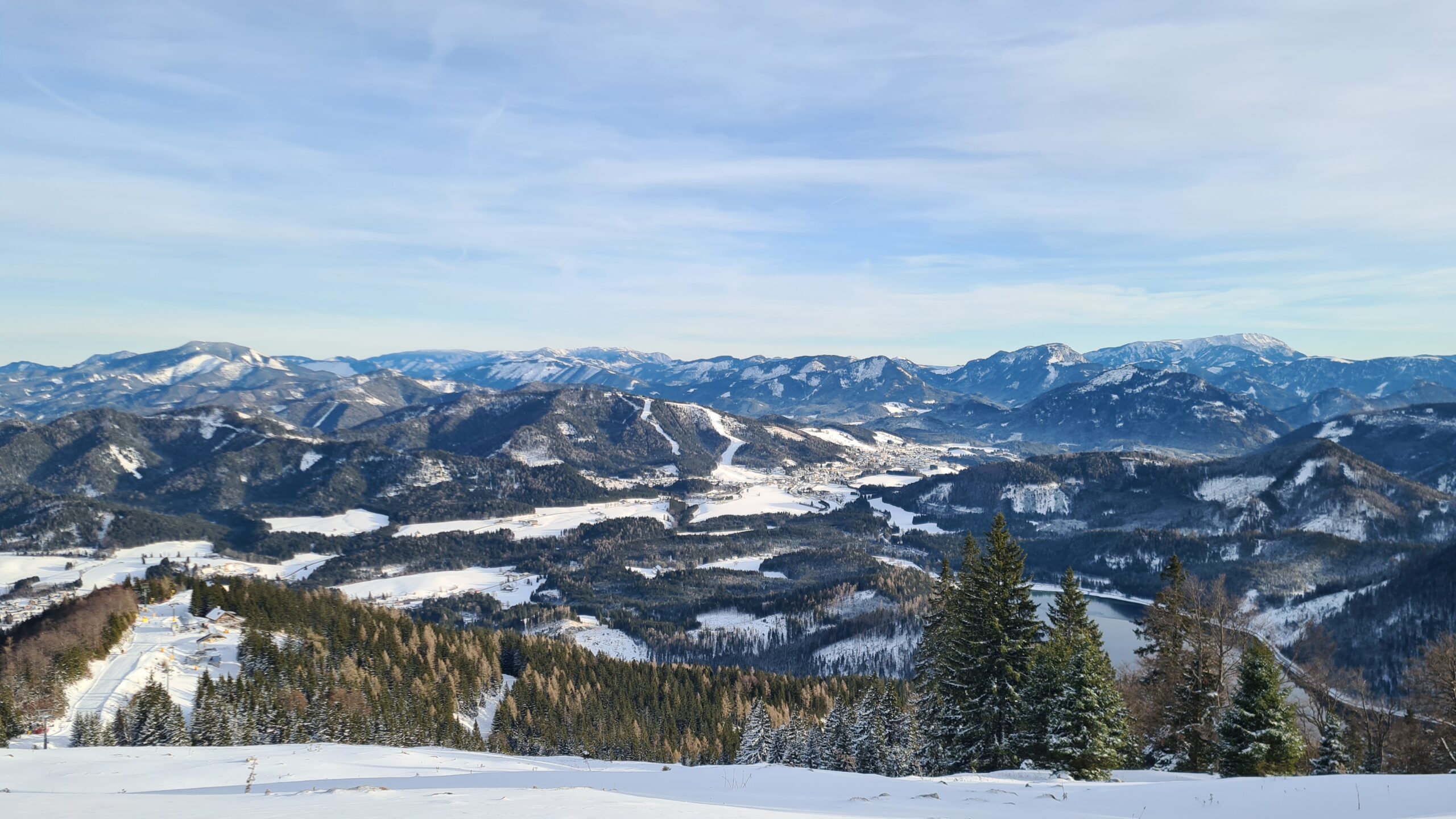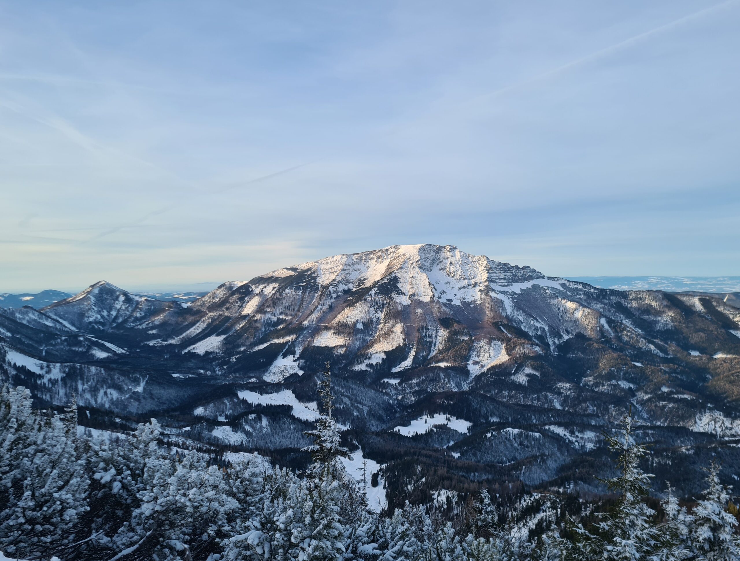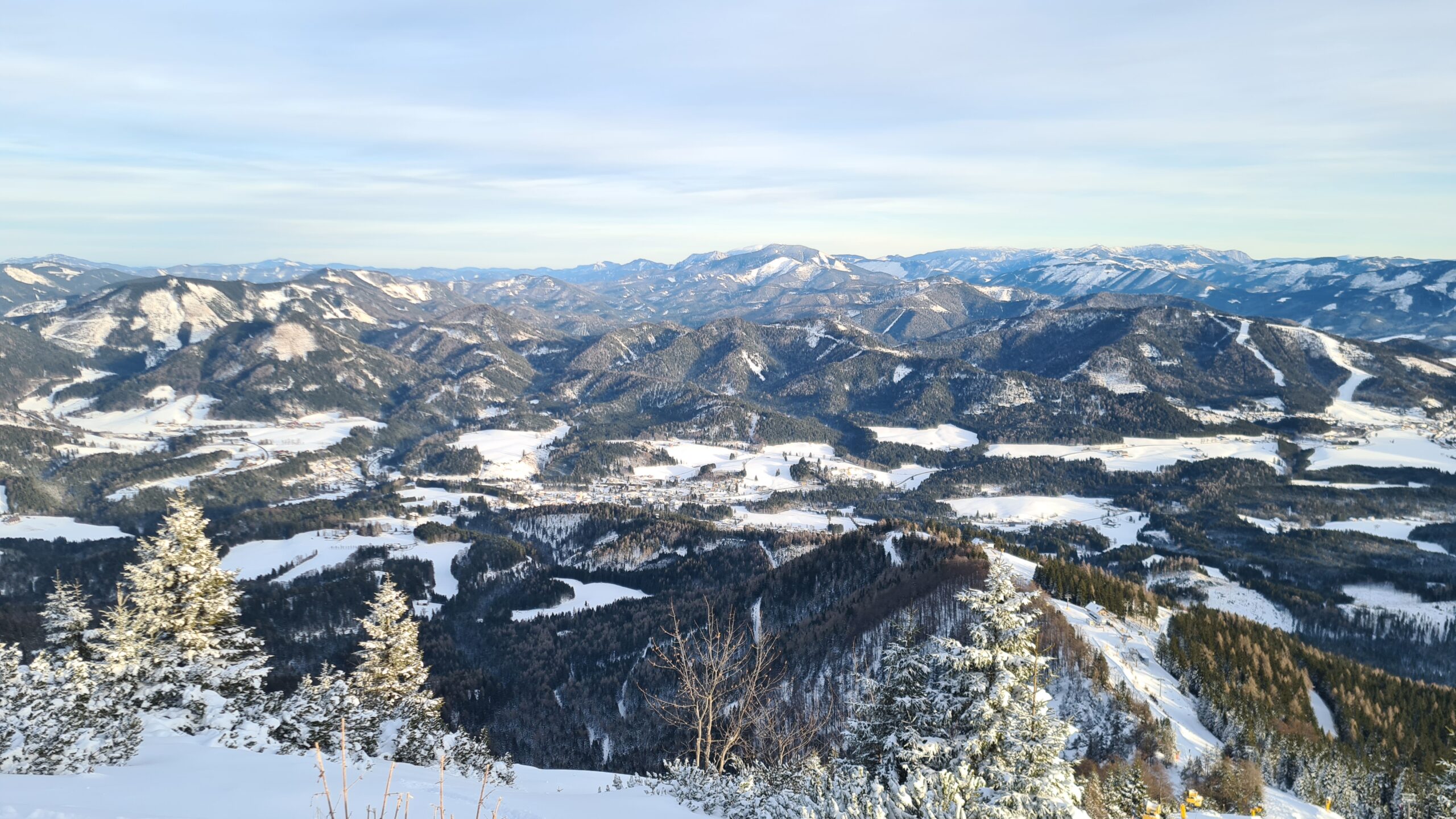 Am Neujahrstag wollten wir dann endlich das schöne Wetter nutzen und mit der Seilbahn auf die Gemeindealpe fahren. Als wir bei der Mittelstation sahen, wie Skitourengeher auf der Piste hinaufstapften, überlegten wir spontan den restlichen Weg zum Gipfel zu wandern. Ich erkundigte mich bei dem Mann, der den Sessellift betreute, ob es möglich wäre auch ohne Tourenski hinaufzuwandern. Dieser bejahte und verwies auf einen alternativen und längeren Weg über die Straße, empfahl uns aber den direkten und kürzeren Aufstieg über die Piste. Also machten wir uns auf den Weg und erfreuten uns am Schnee und dem beeindruckenden Panorama.