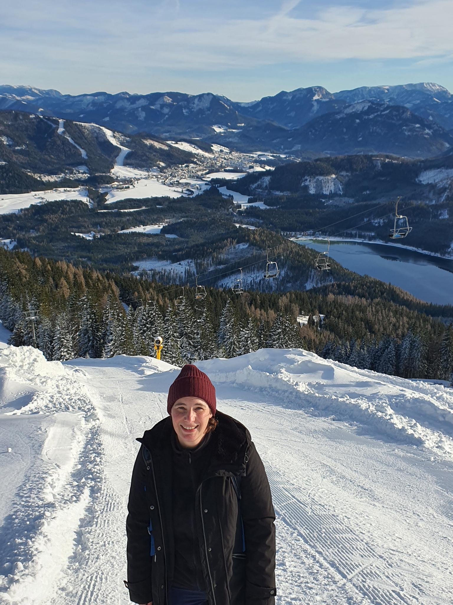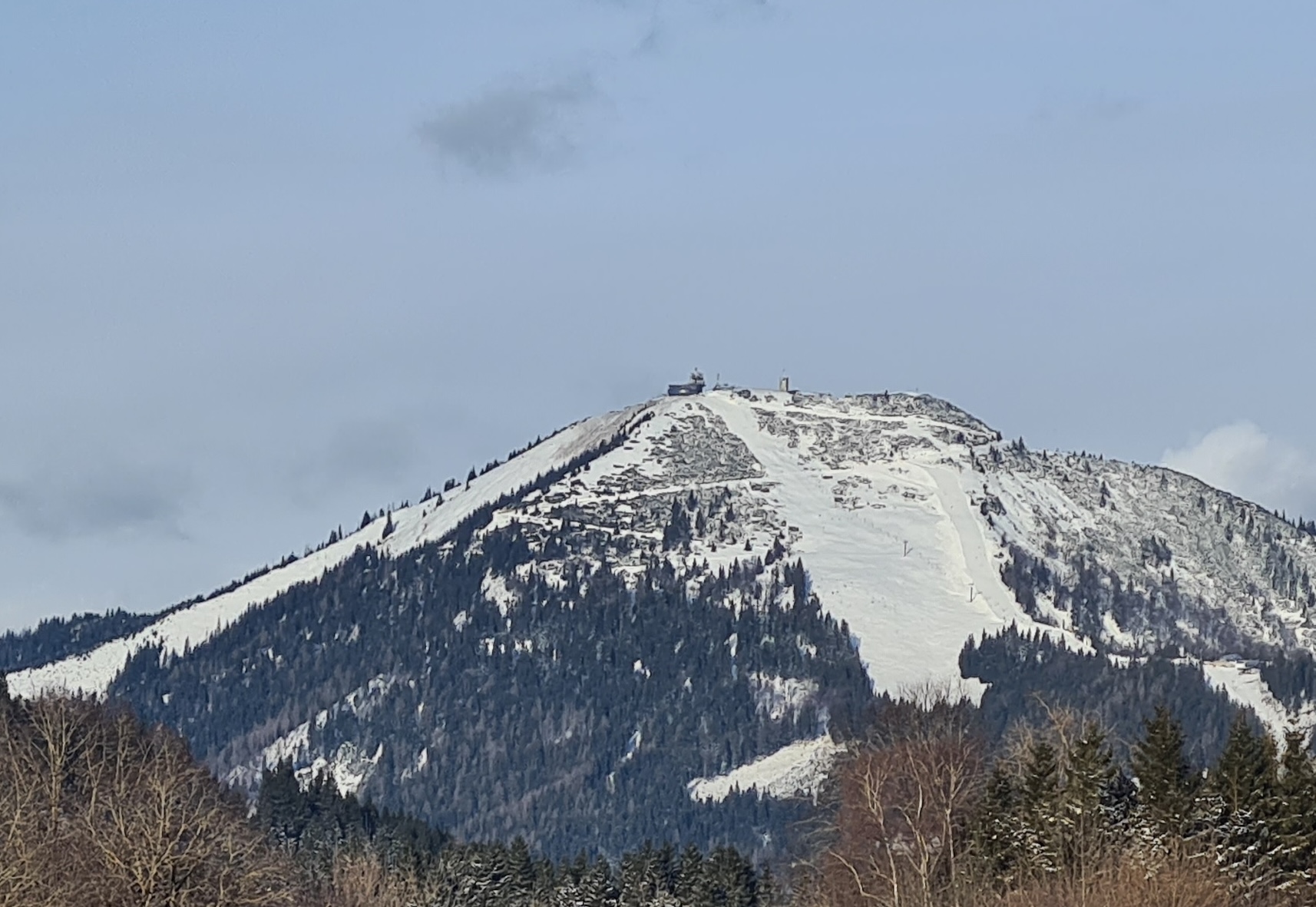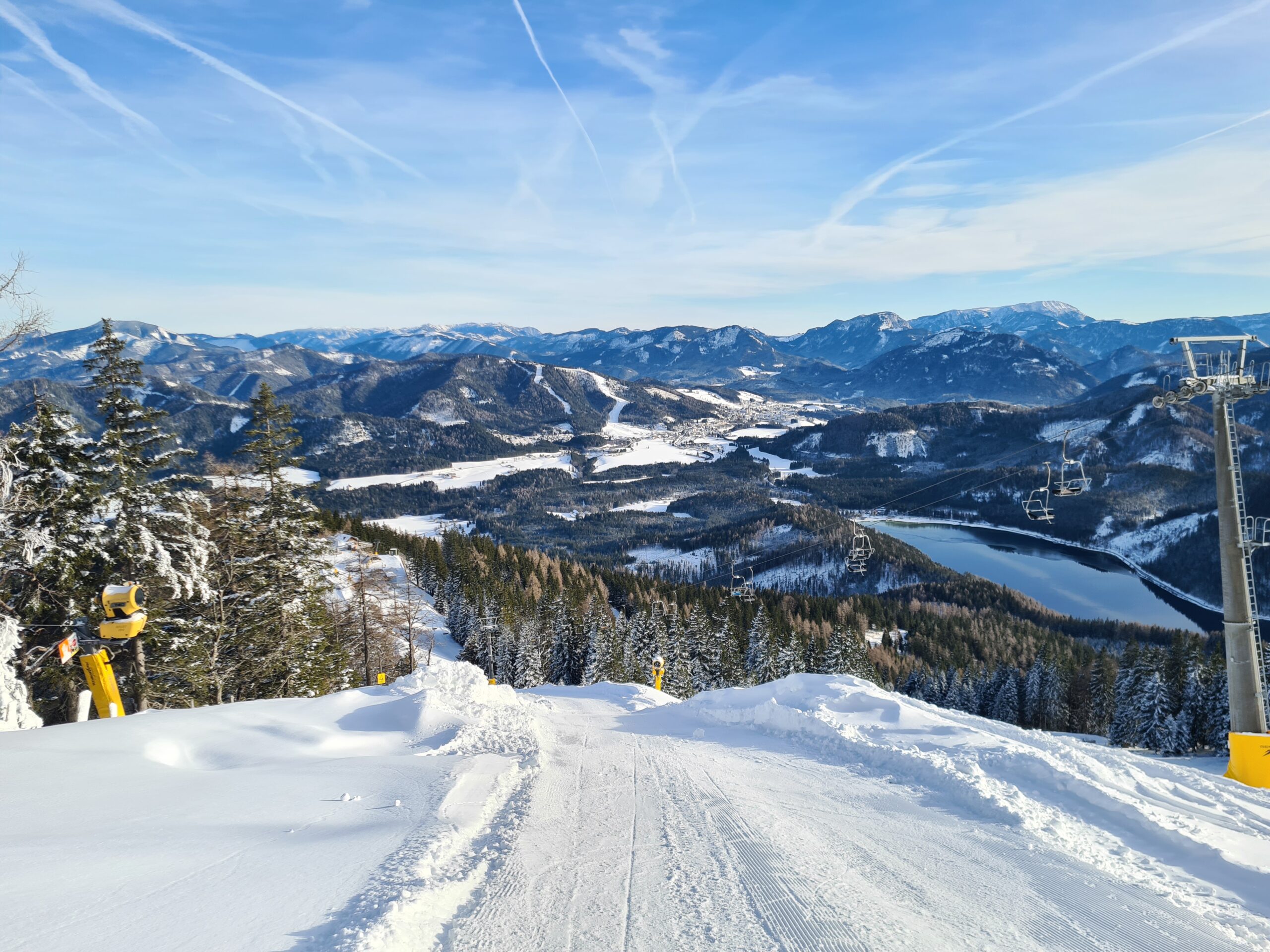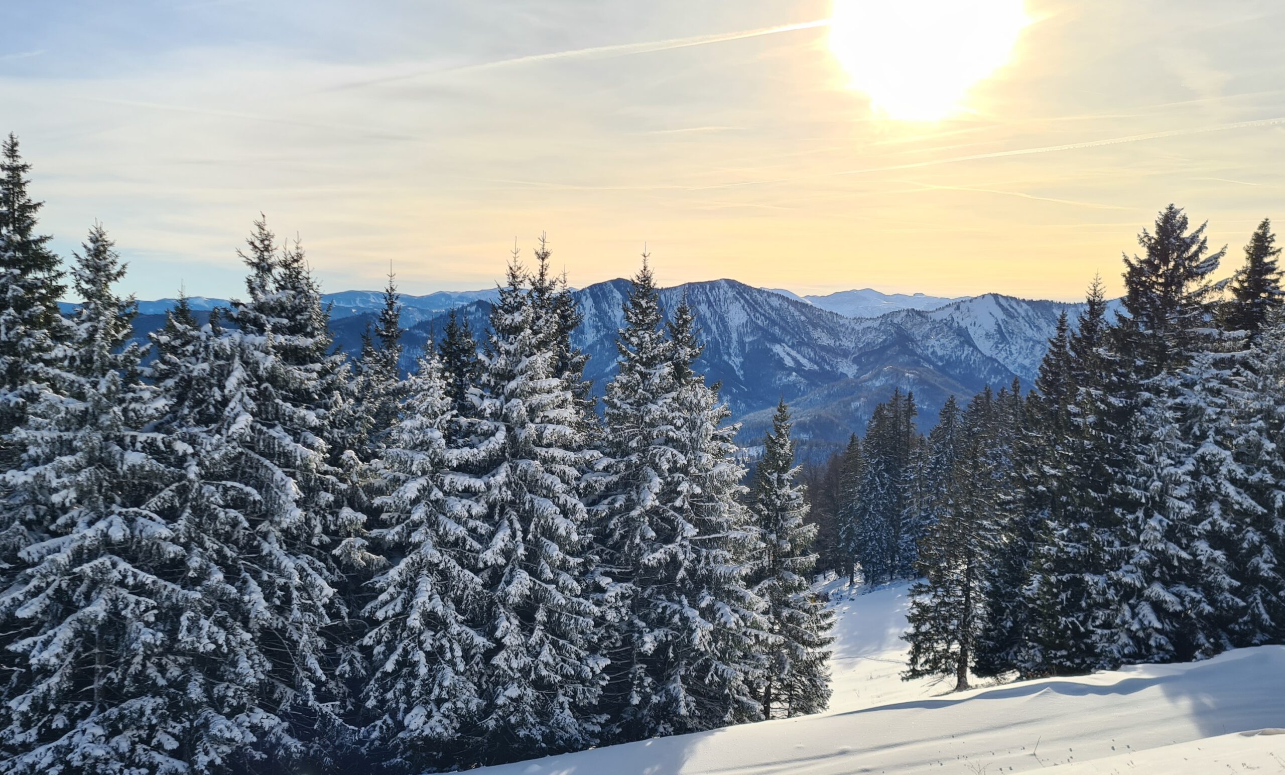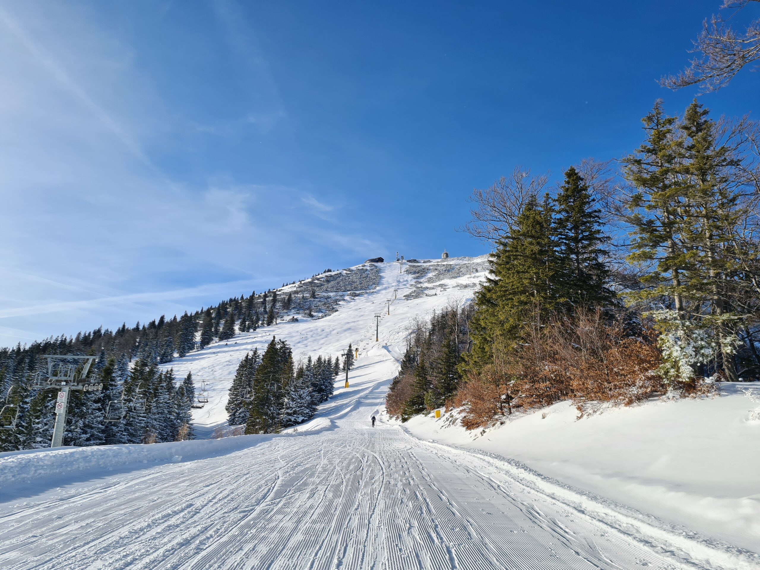 Am Neujahrstag wollten wir dann endlich das schöne Wetter nutzen und mit der Seilbahn auf die Gemeindealpe fahren. Als wir bei der Mittelstation sahen, wie Skitourengeher auf der Piste hinaufstapften, überlegten wir spontan den restlichen Weg zum Gipfel zu wandern. Ich erkundigte mich bei dem Mann, der den Sessellift betreute, ob es möglich wäre auch ohne Tourenski hinaufzuwandern. Dieser bejahte und verwies auf einen alternativen und längeren Weg über die Straße, empfahl uns aber den direkten und kürzeren Aufstieg über die Piste. Also machten wir uns auf den Weg und erfreuten uns am Schnee und dem beeindruckenden Panorama.