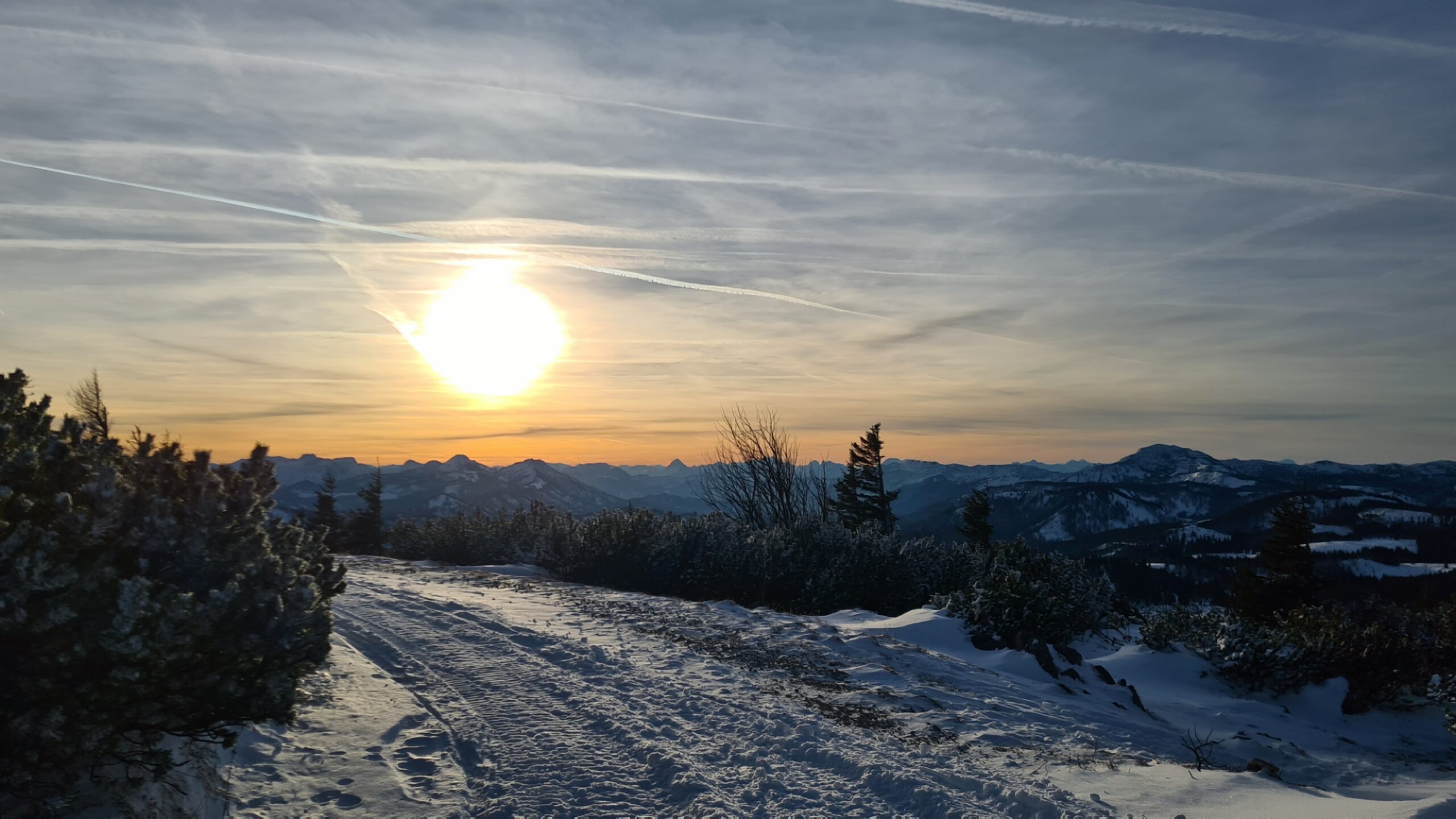 Leider saß uns die Zeit ein wenig im Nacken – ansonsten hätten wir diesen Abschnitt noch mehr genießen können. Wir folgten einem Wanderweg, der auf die Westseite der Gemeindealpe führte. Hier blies uns zwar ein eisiger Wind entgegen, aber wir hatten auch schon eine schöne Sonnenstimmung.