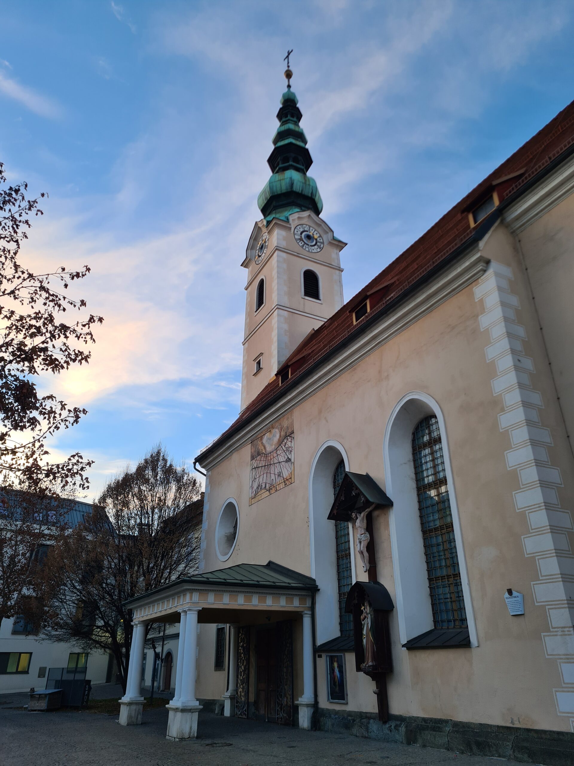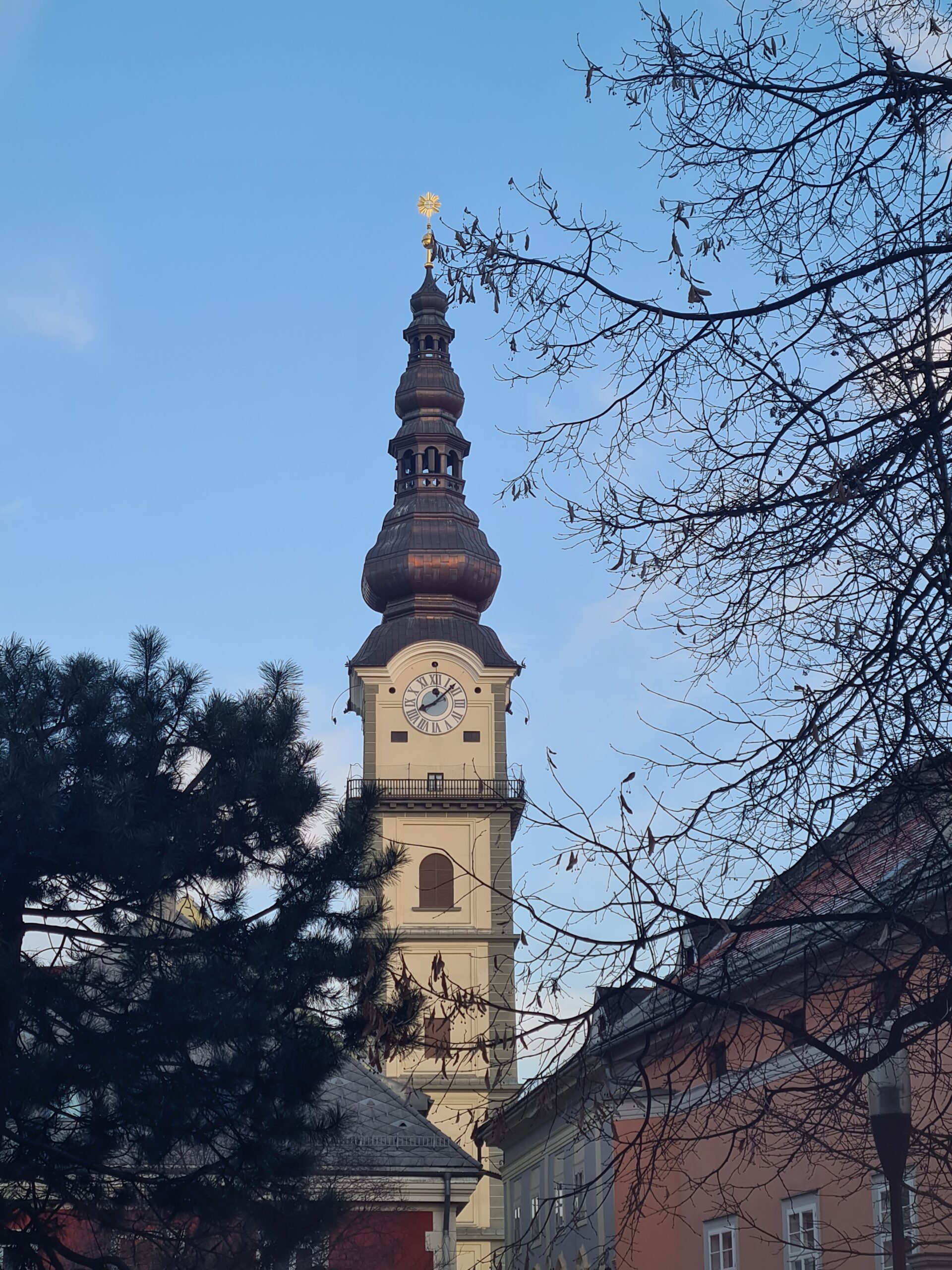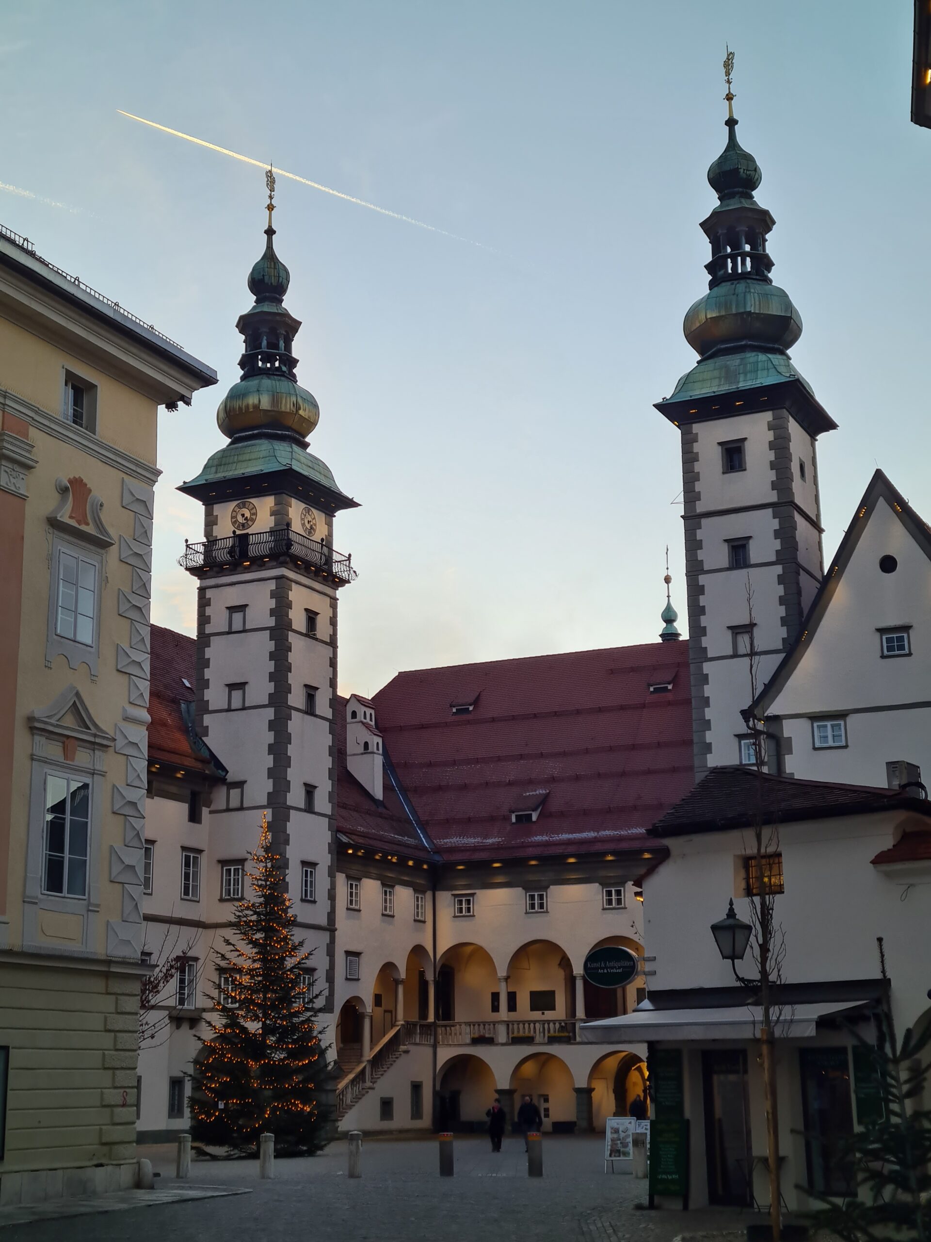 An der Kirche vorbei gingen wir in die Stadt hinunter. Vor uns sahen wir den Turm der Stadtpfarrkirche, der auch bestiegen werden kann – aber im Winter leider nur an den Adventwochenenden. Wir kamen am Jugendstiltheater und der Heiliggeistkirche vorbei, ehe wir schließlich zum Landhaus kamen.