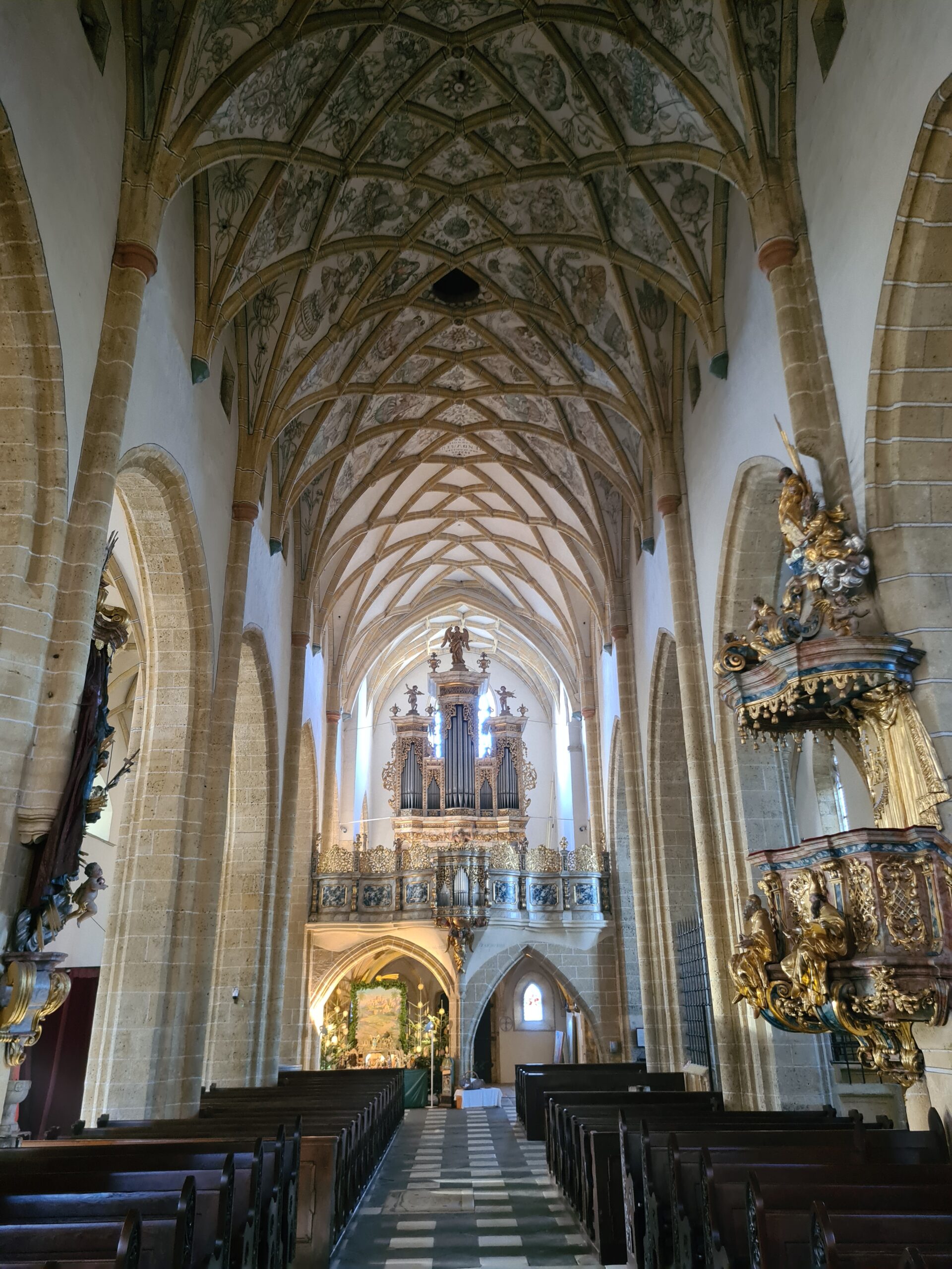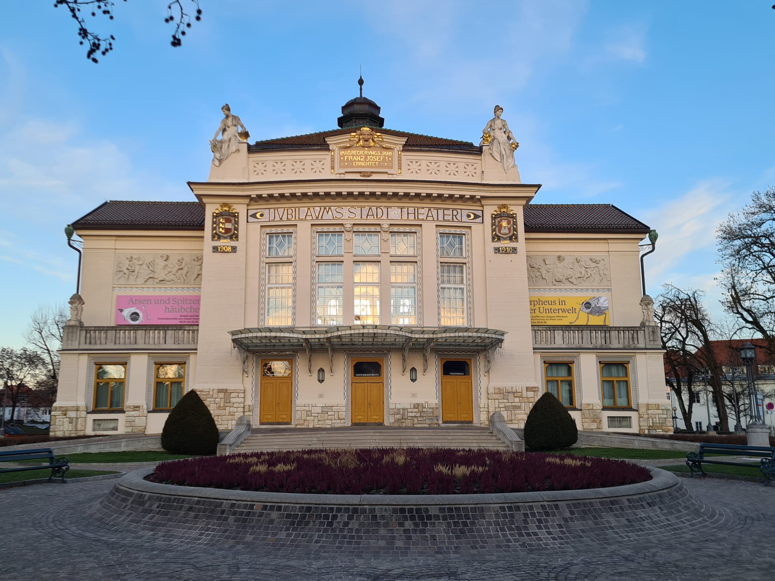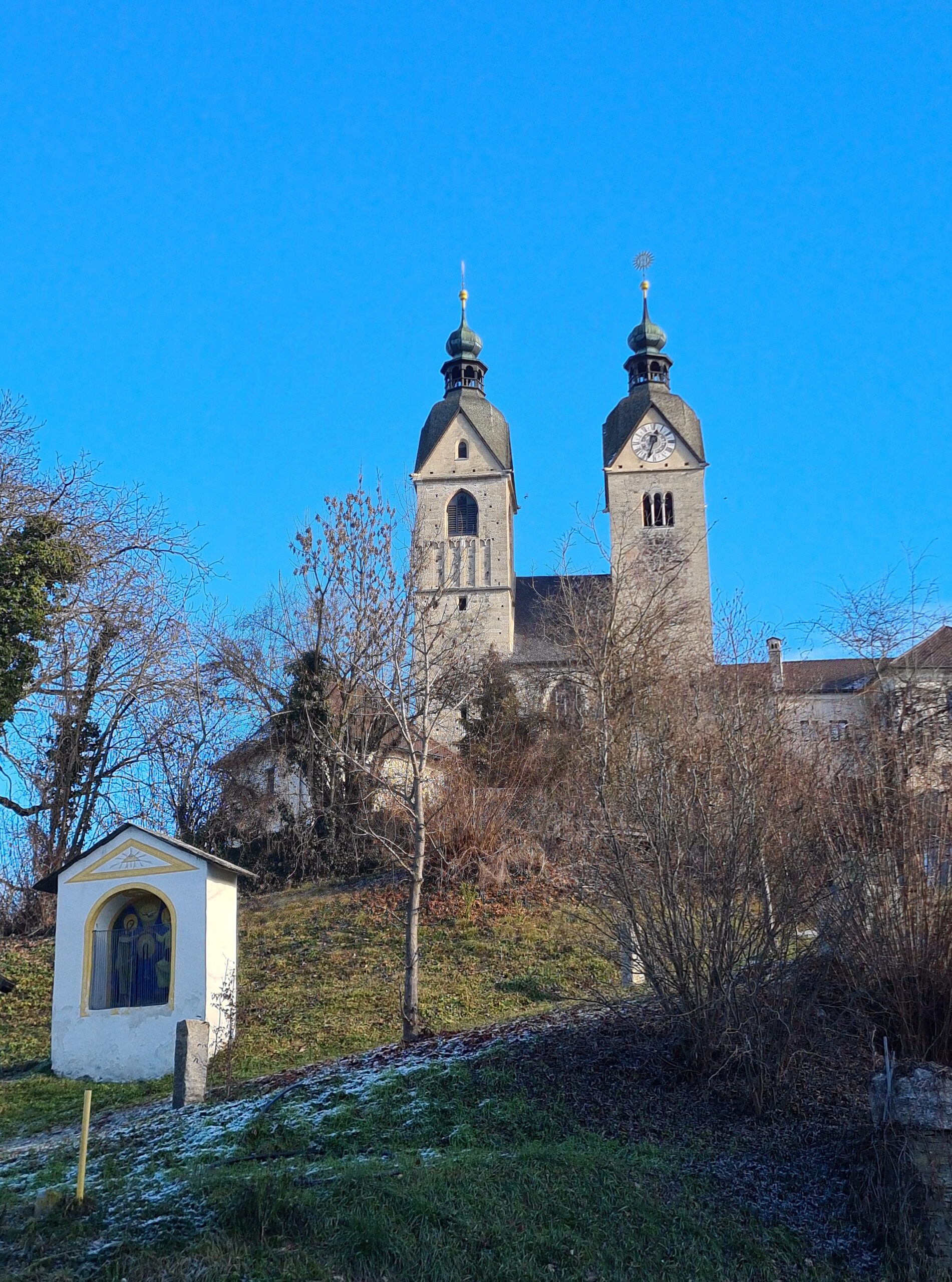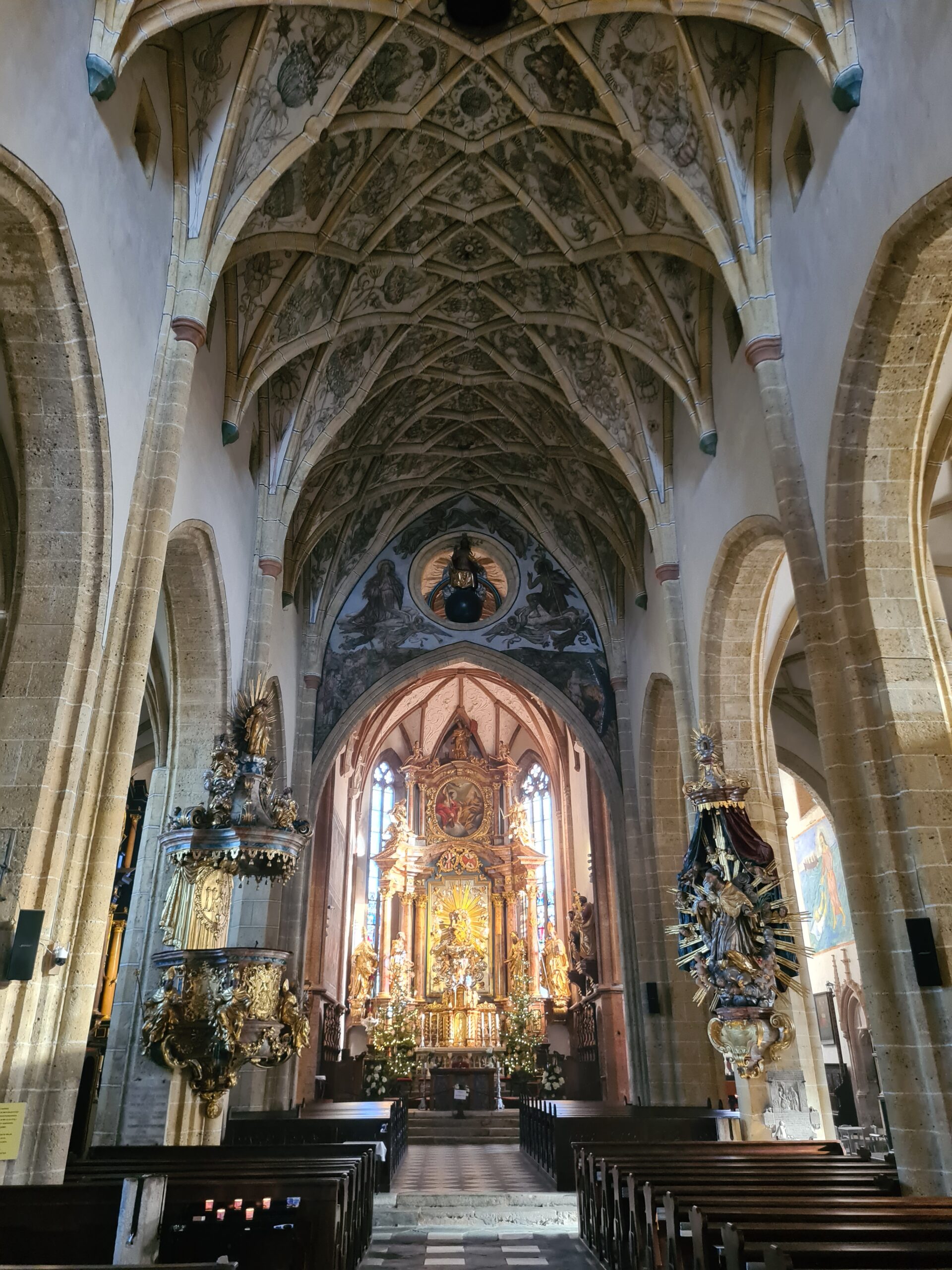 An der Kirche vorbei gingen wir in die Stadt hinunter. Vor uns sahen wir den Turm der Stadtpfarrkirche, der auch bestiegen werden kann – aber im Winter leider nur an den Adventwochenenden. Wir kamen am Jugendstiltheater und der Heiliggeistkirche vorbei, ehe wir schließlich zum Landhaus kamen.