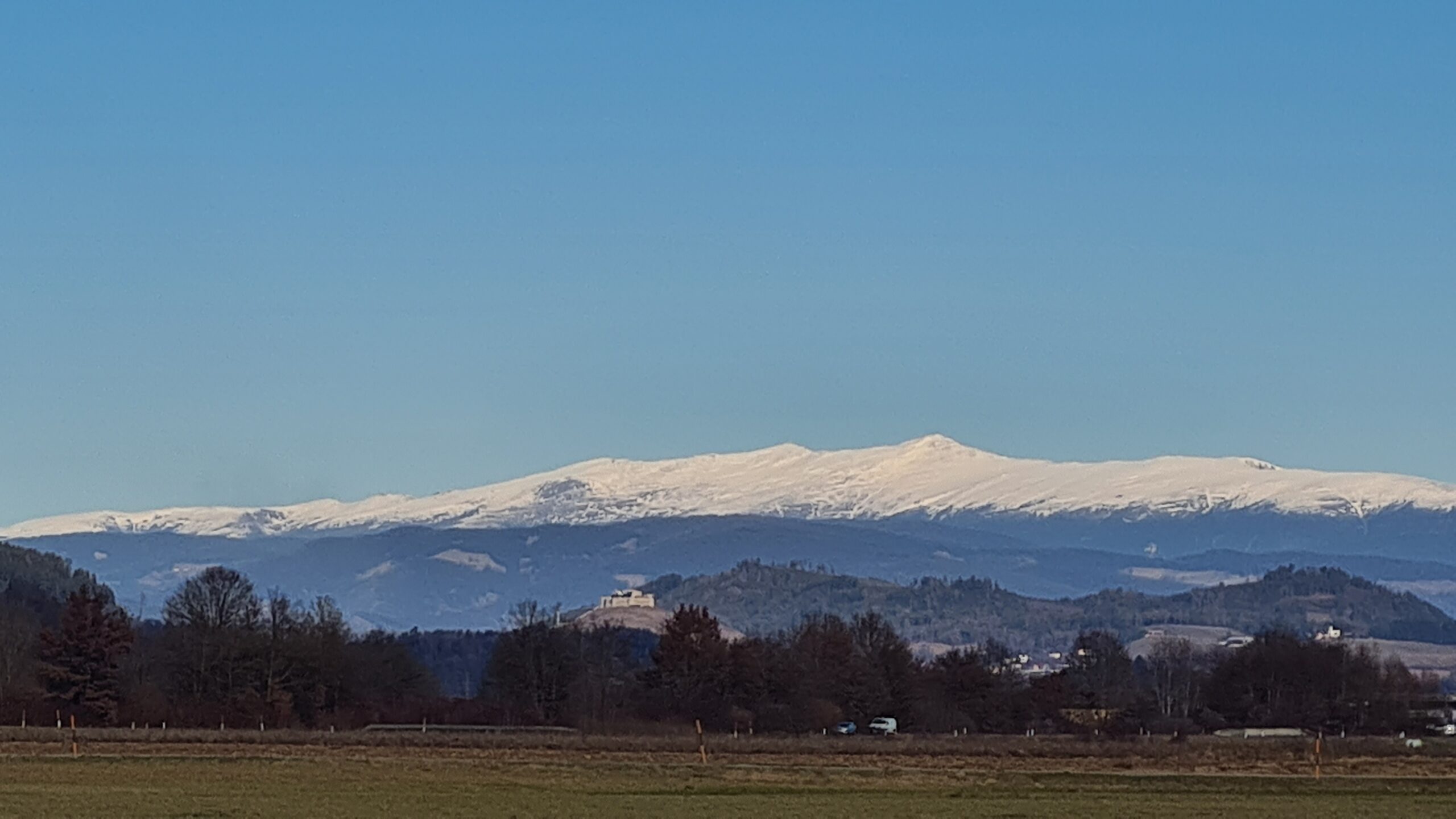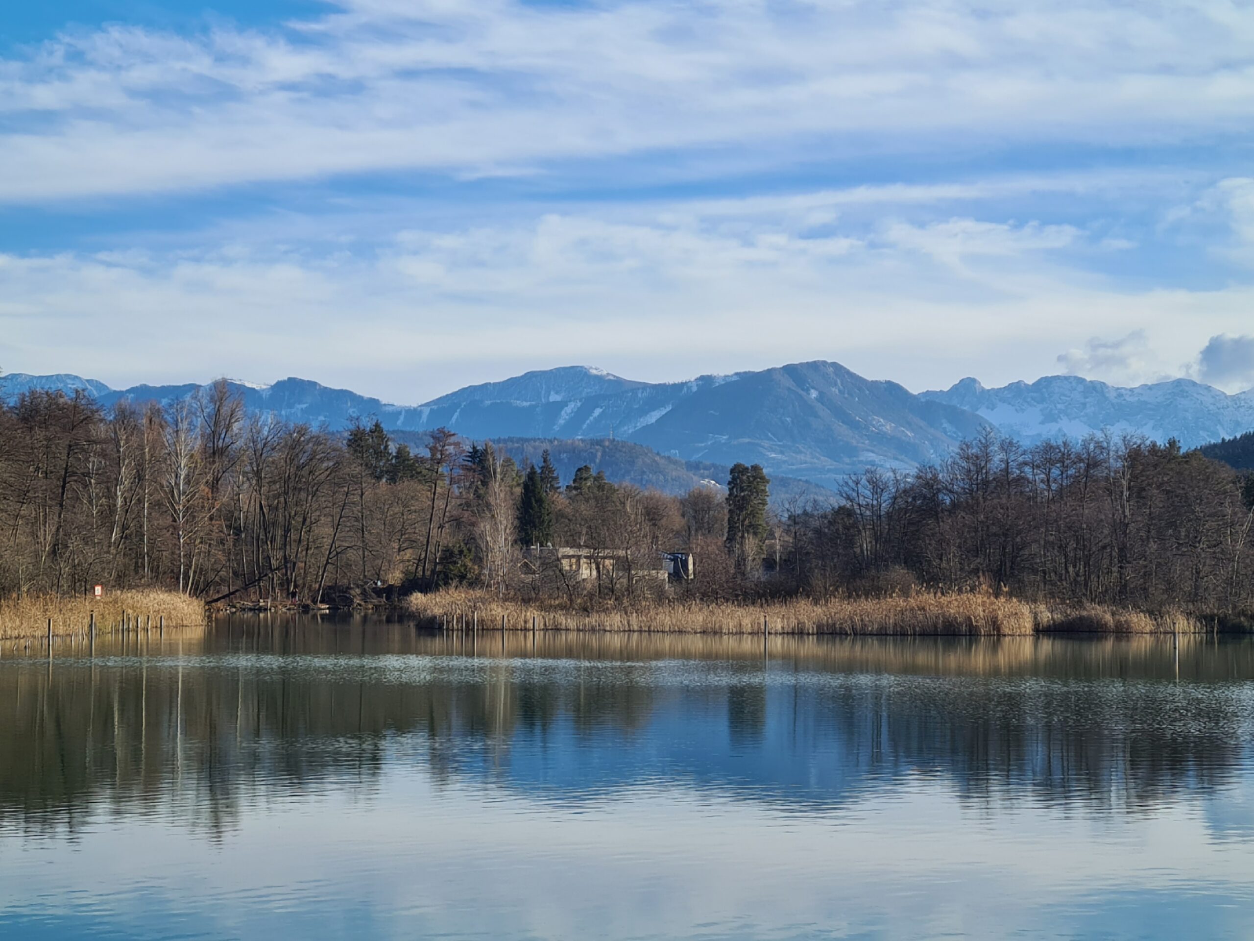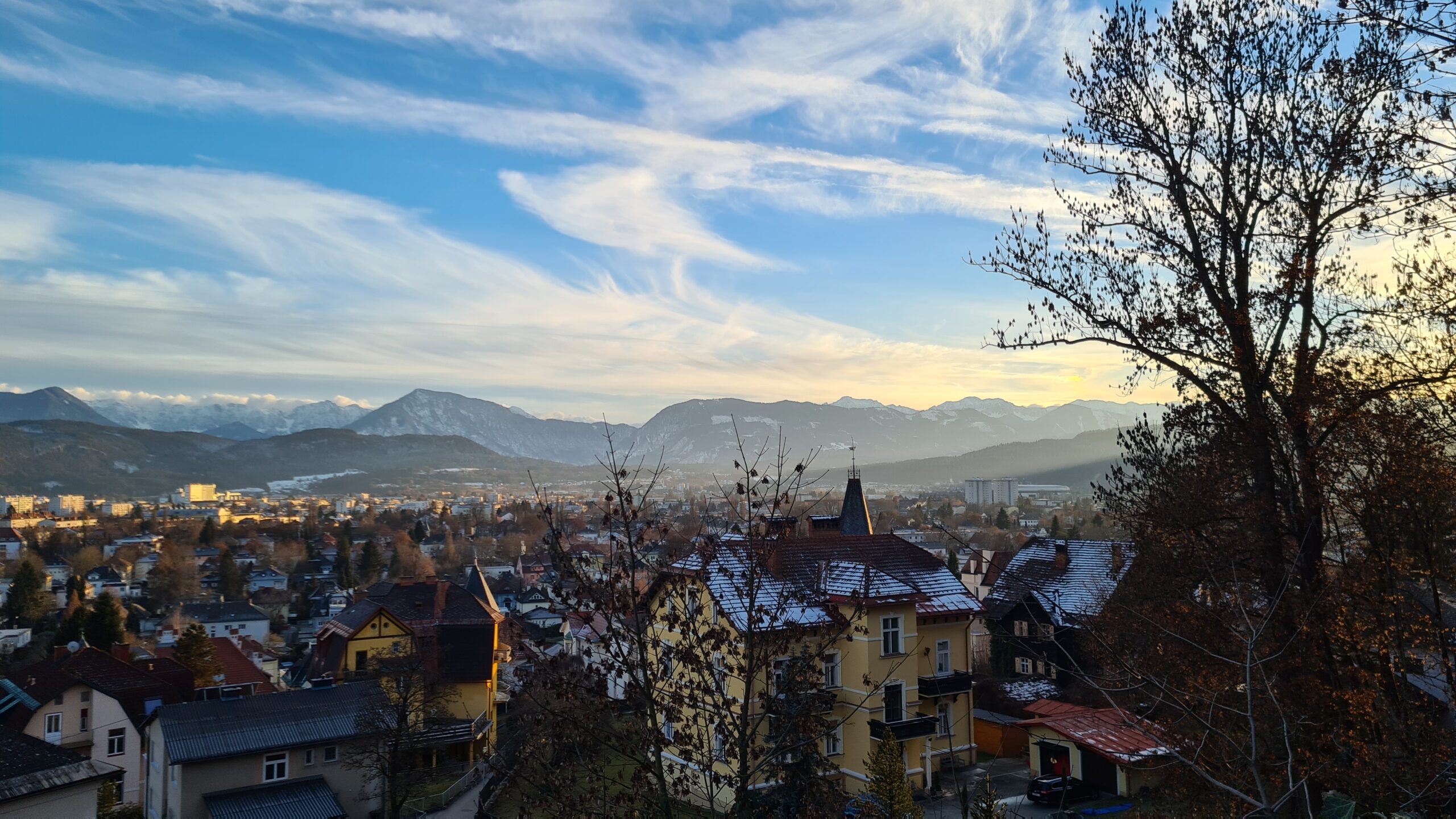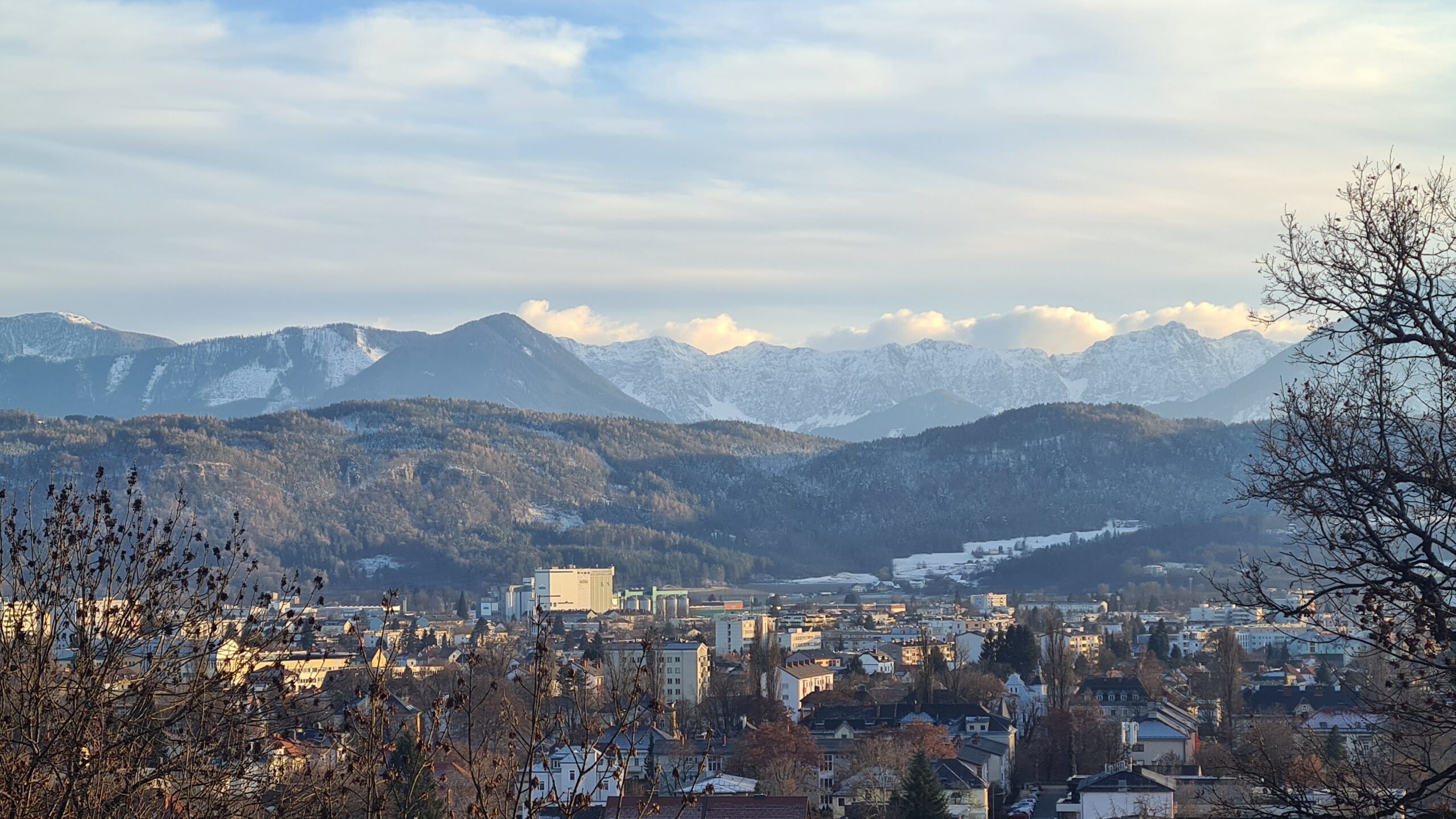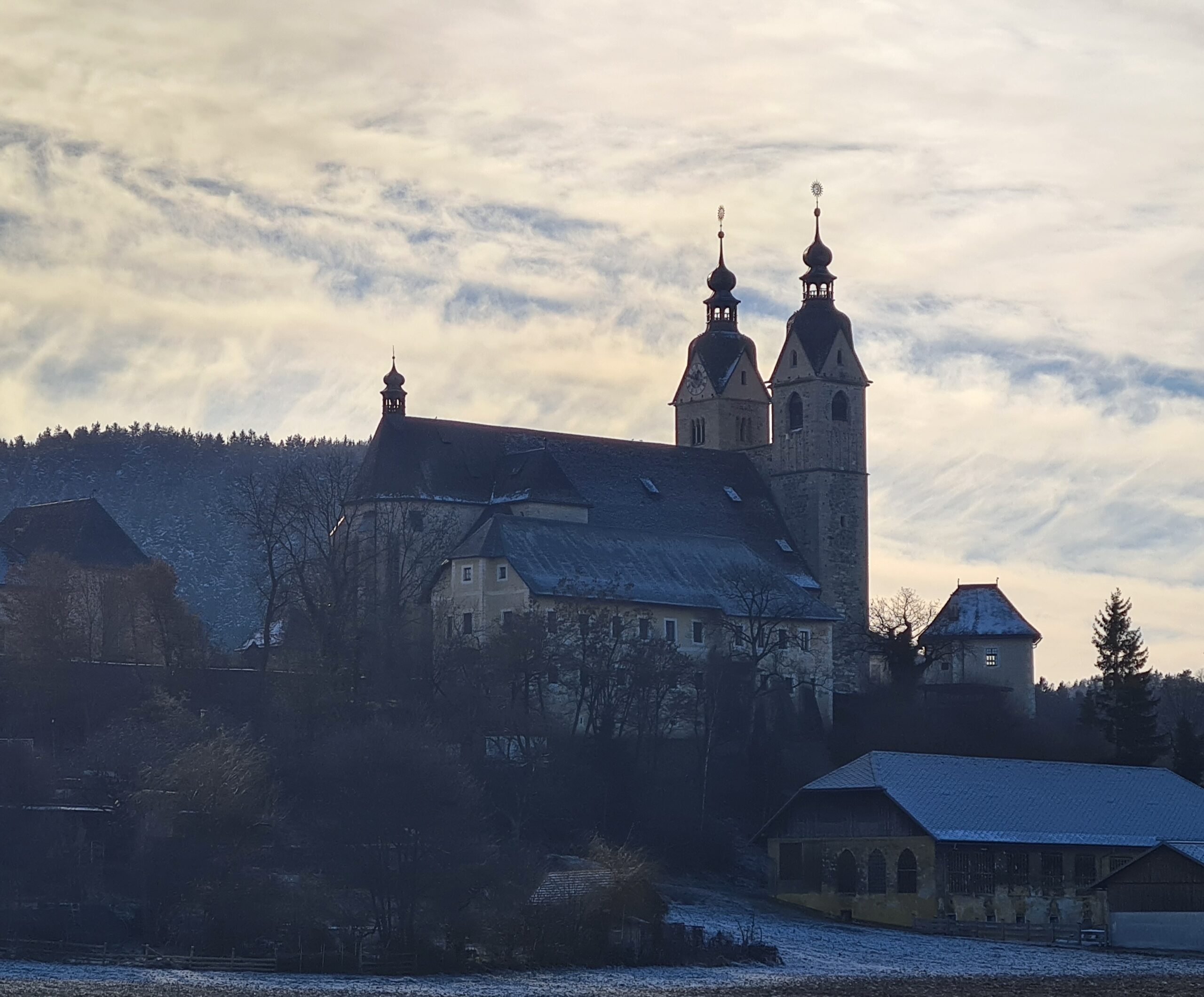 Wir gingen nun am Kärtner Freilichtmuseum (das im Winter leider geschlossen hat) vorbei Richtung Bahnhof und hatten dabei auch noch einmal schöne Blicke zurück zur Kirche. In der Ferne konnten wir außerdem die schneebedeckte Saualpe sehen.