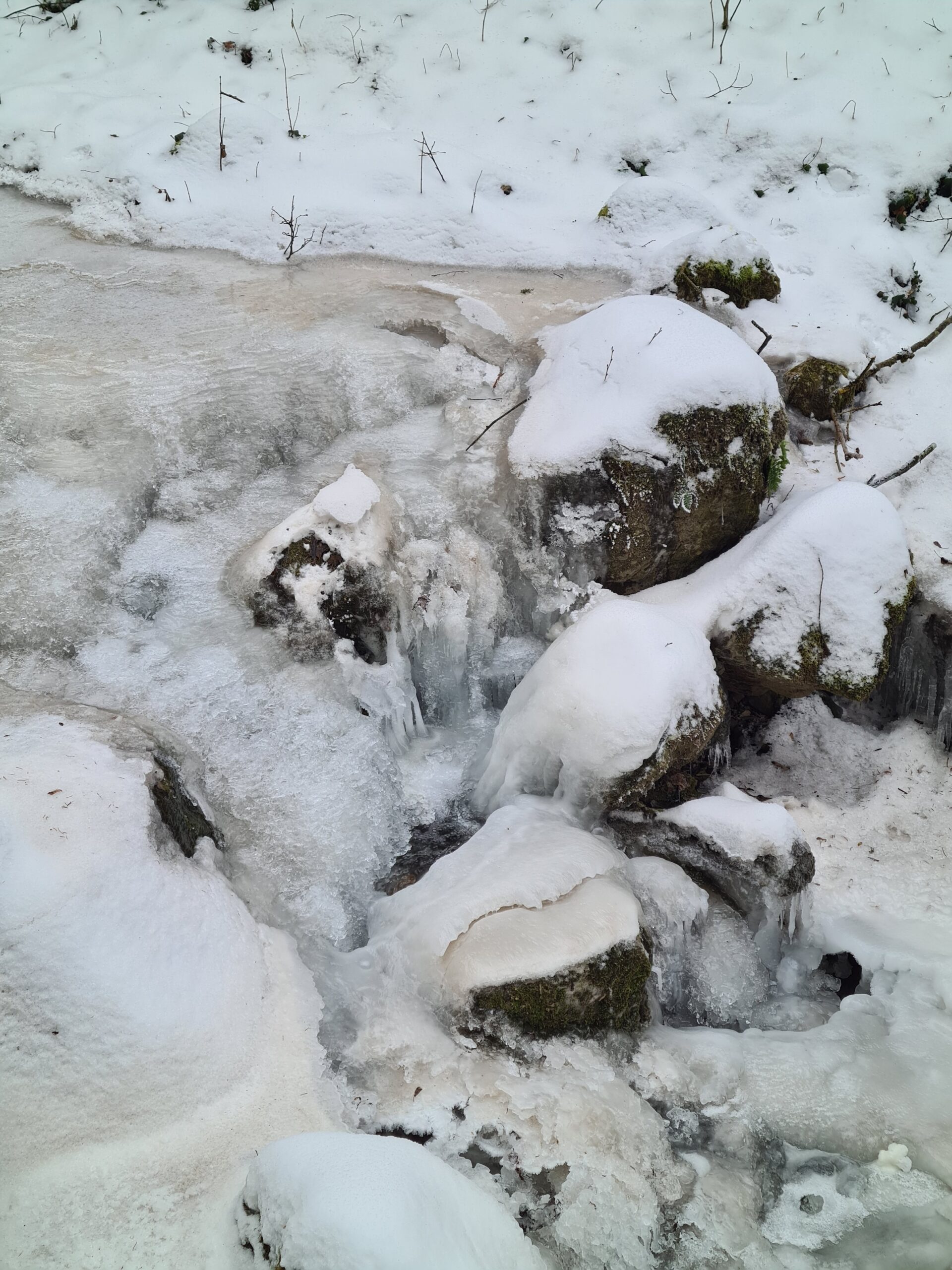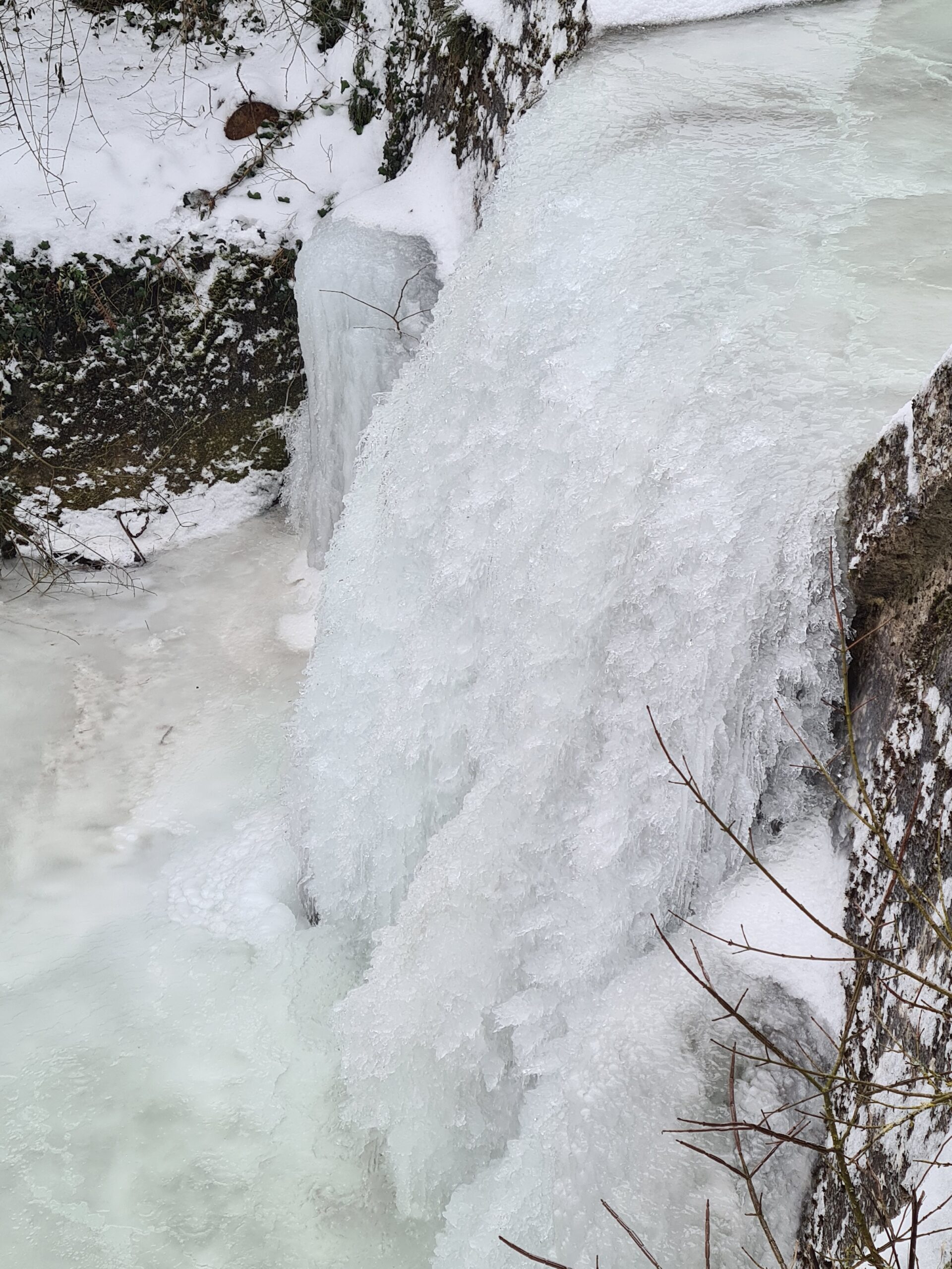 Trotzdem bog ich bald darauf nach links ab und folgte dem teilweise sehr glatten Wanderweg zur Burgruine. Auch wenn ich den gefrorenen Johannesbach nun hinter mir gelassen hatte, gab es weiterhin schöne Eisformationen zu bestaunen.