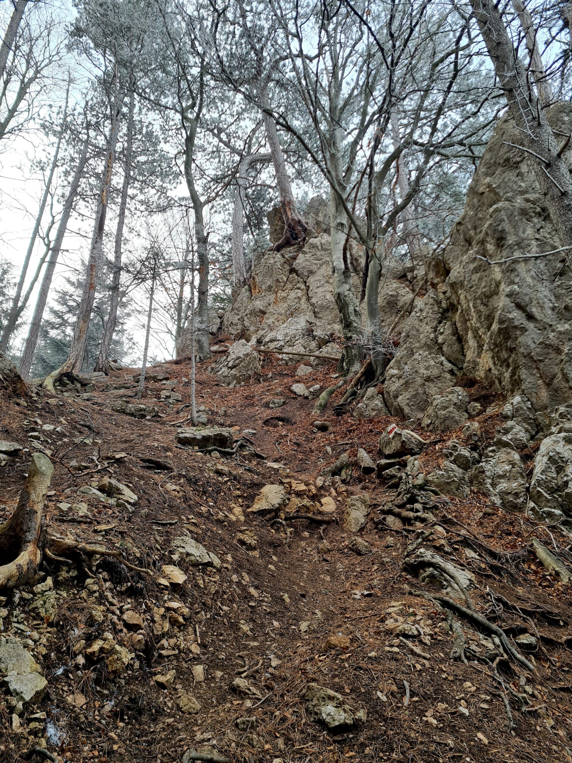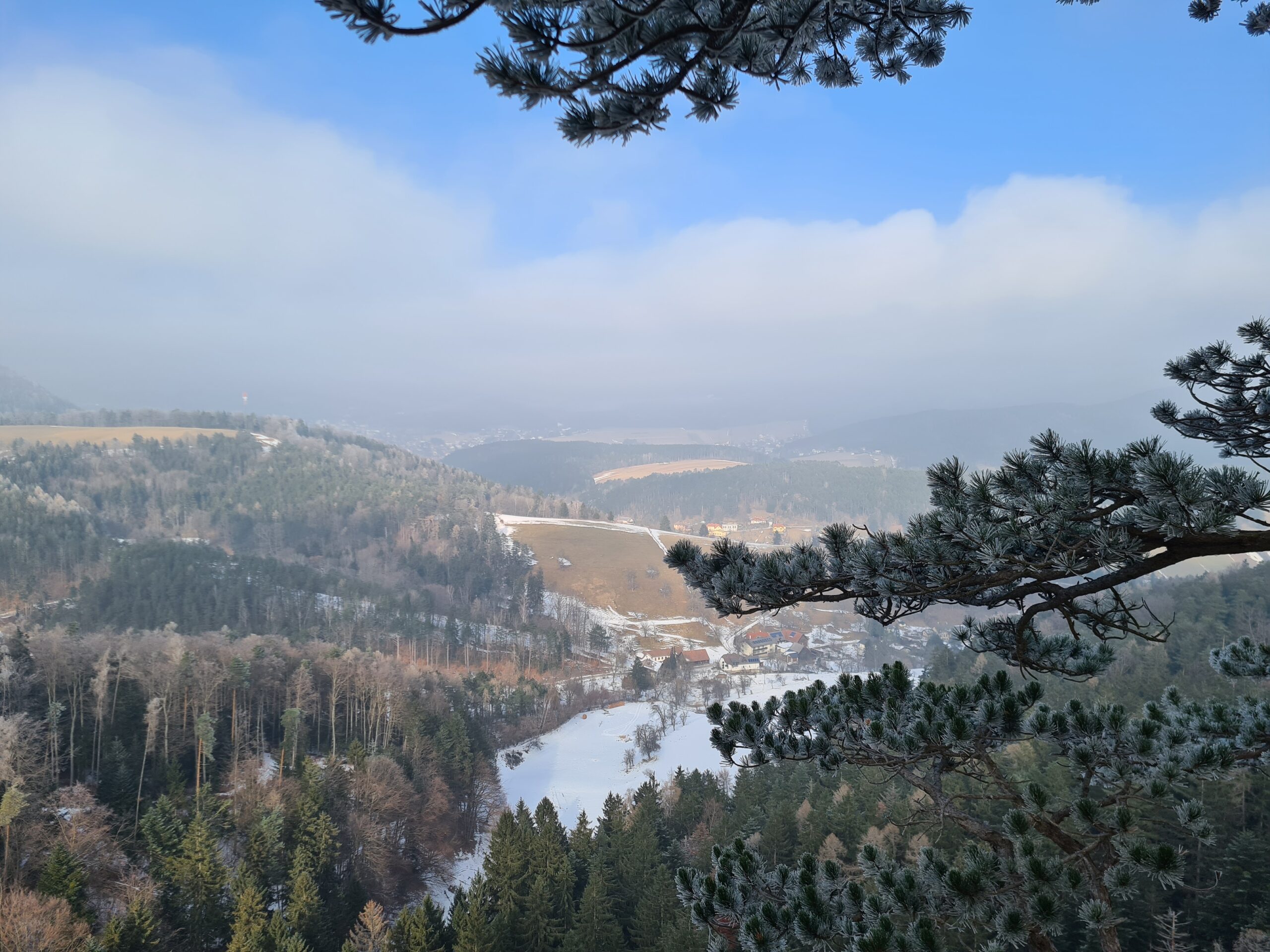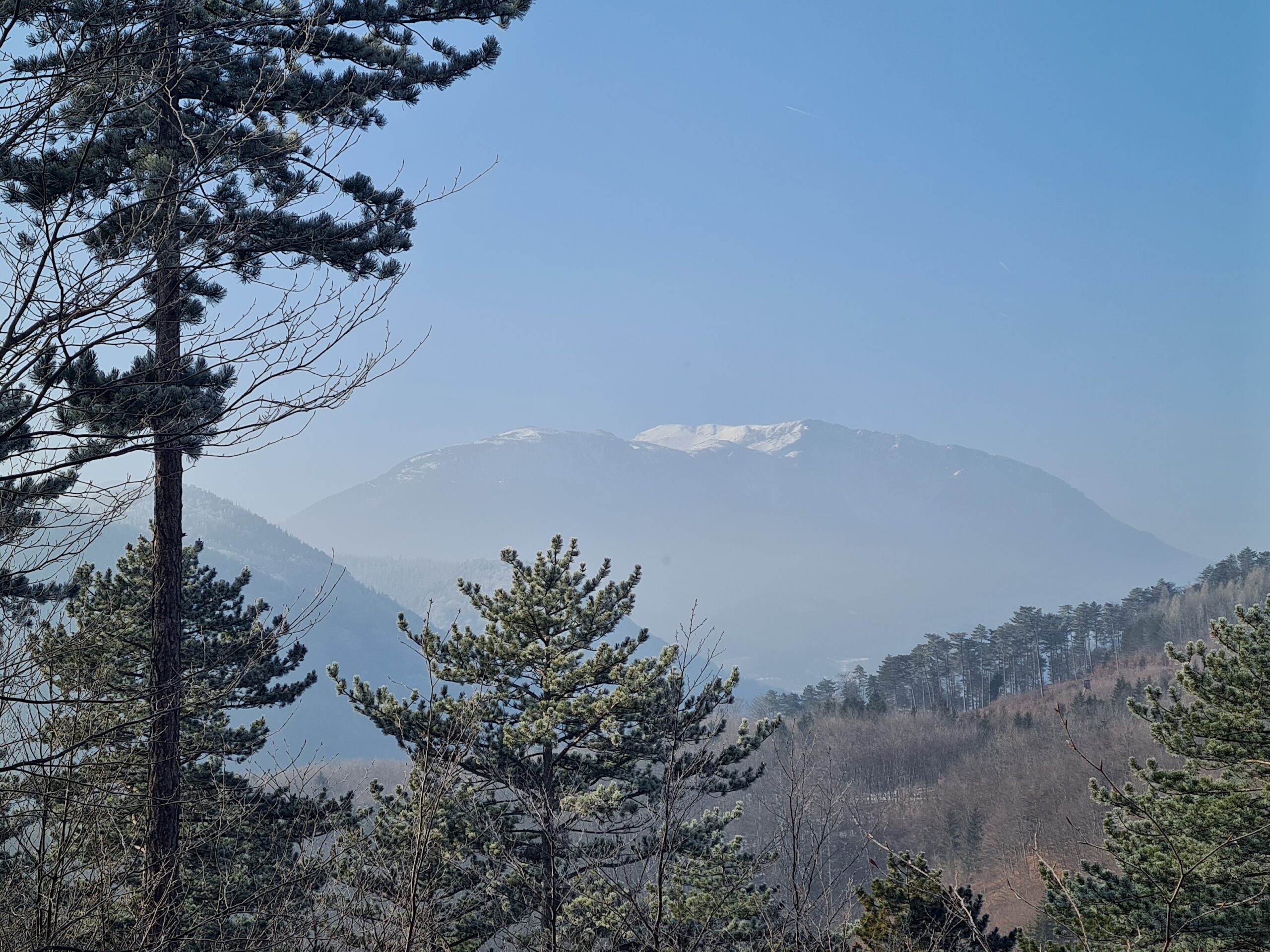 Im Naturpark Sierningtal – Flatzer Wand wurden die hier so typischen Föhren immer mehr und es wurde zwischendurch so sonnig, dass sich sogar der Schneeberg aus dem Nebel schälte.