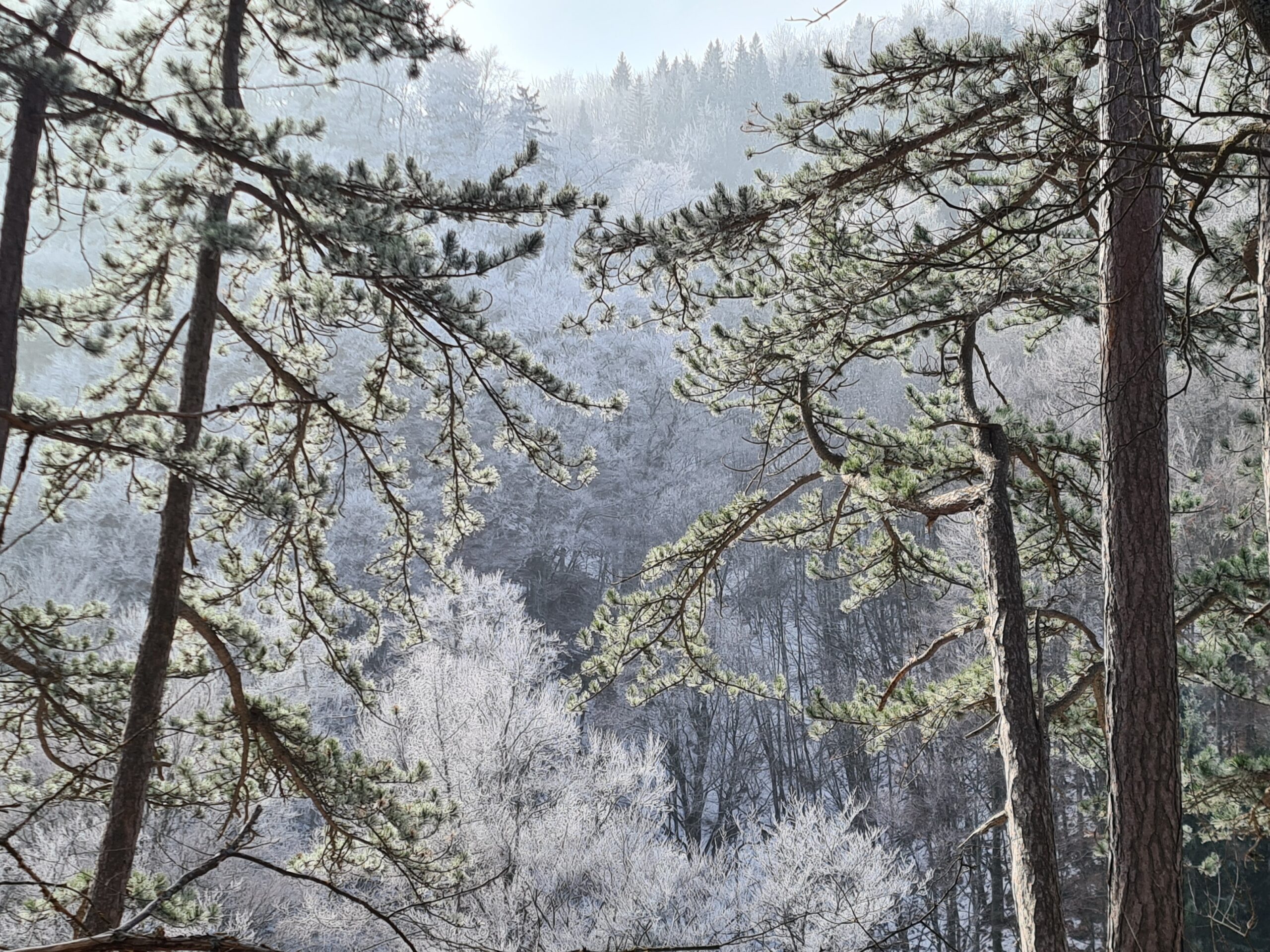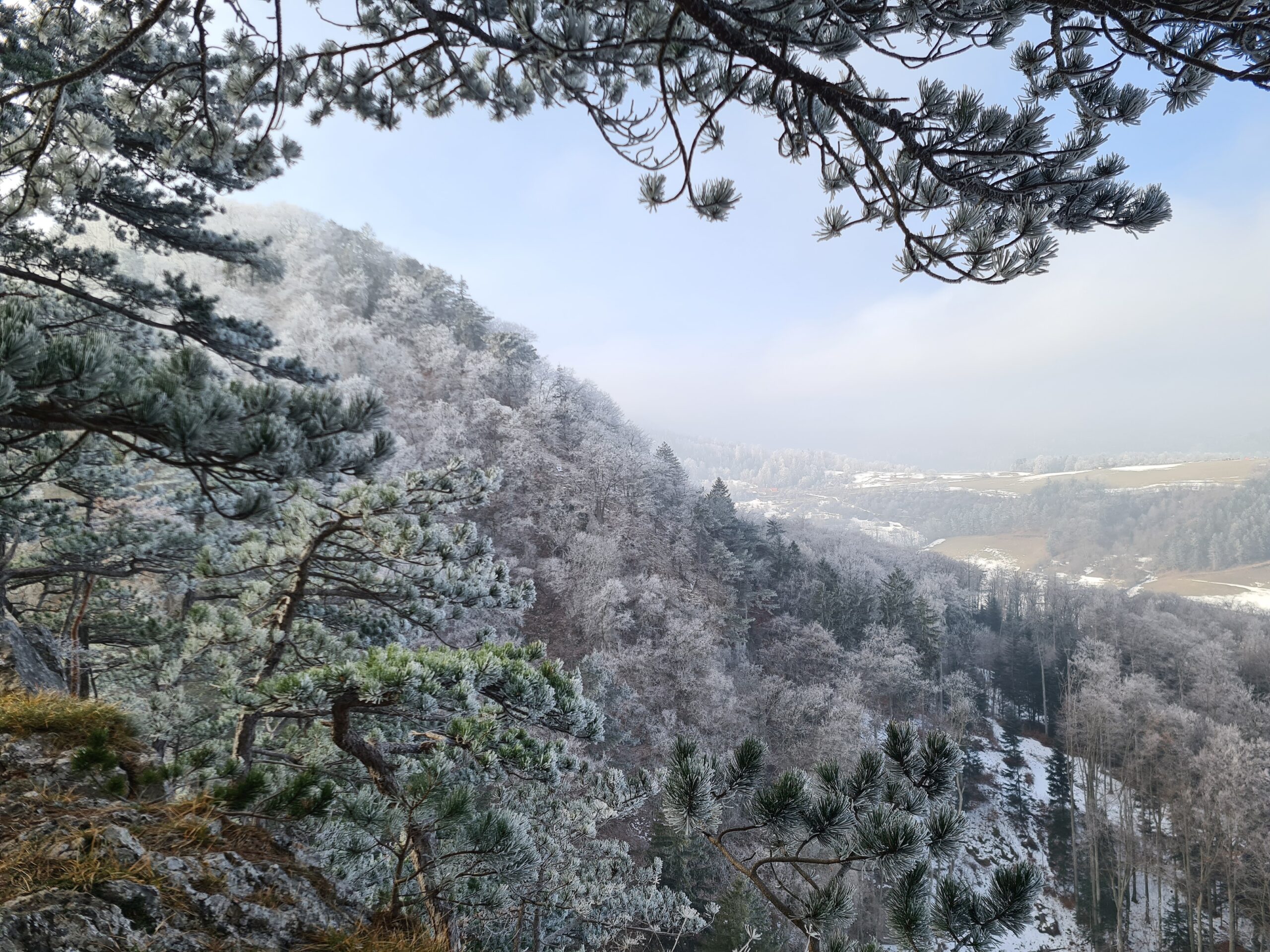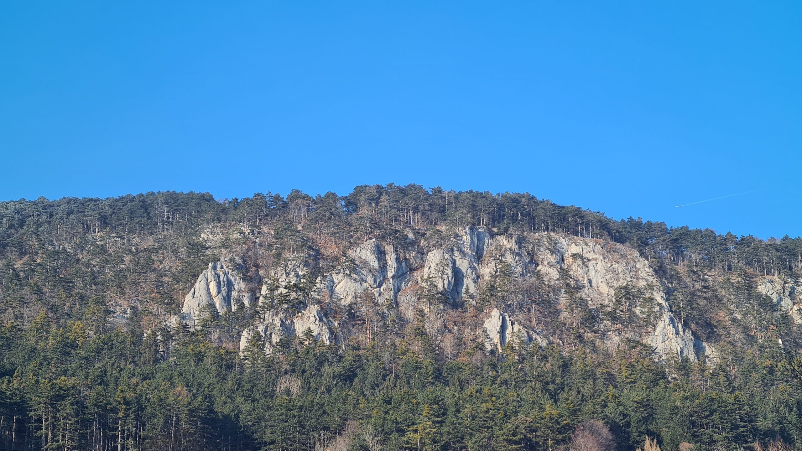 Im Naturpark Sierningtal – Flatzer Wand wurden die hier so typischen Föhren immer mehr und es wurde zwischendurch so sonnig, dass sich sogar der Schneeberg aus dem Nebel schälte.