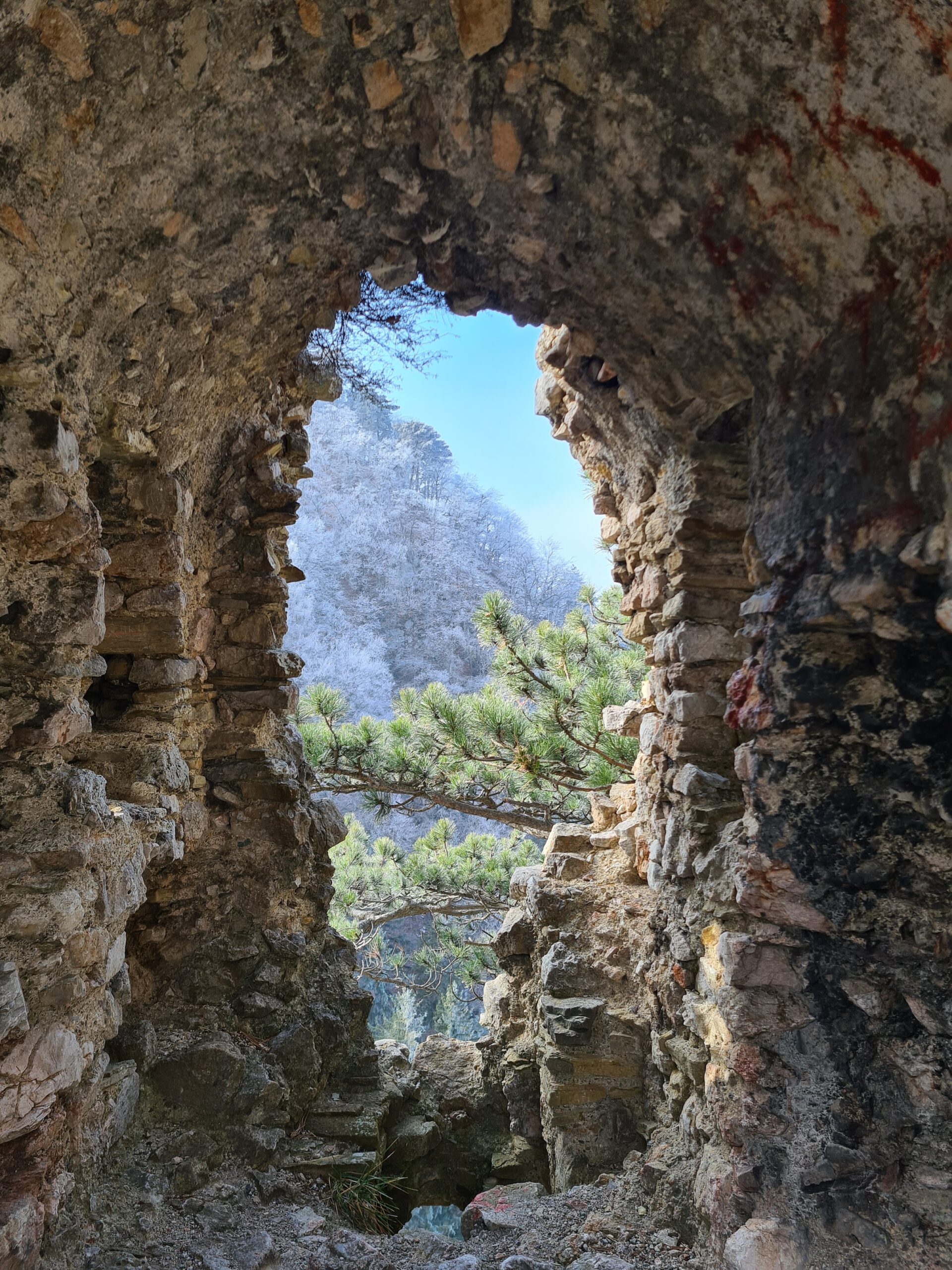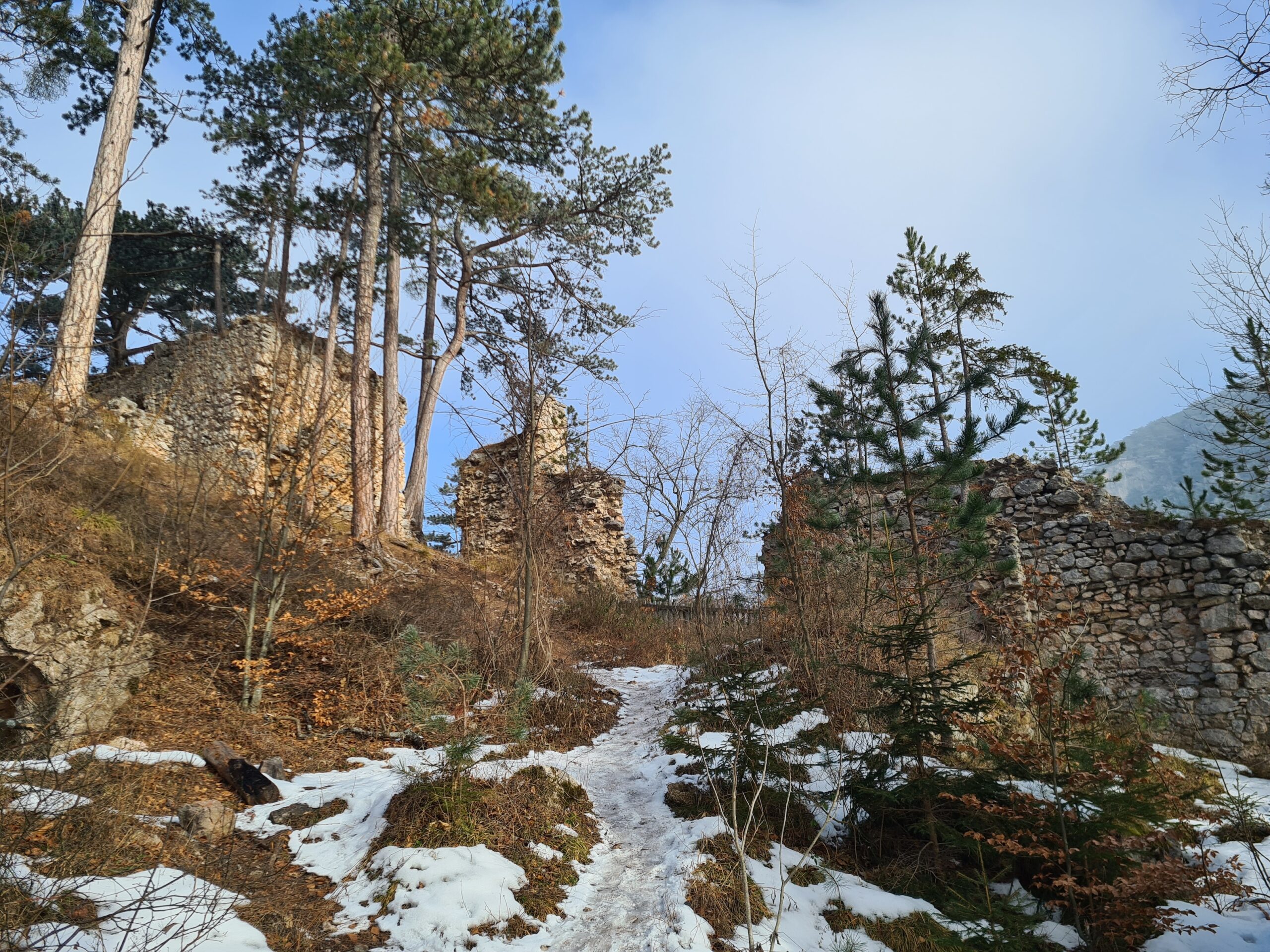 Ziemlich steil ging es das letzte Stück zur Ruine hinauf. Die Burg Schrattenstein stammt aus dem 12. Jahrhundert und wurde vermutlich noch im späten Mittelalter aufgegeben. Man kann sich auf dem Gelände frei umschauen und die Gebäudereste besichtigen. Ich war ganz überrascht, dass nun tatsächlich ein bisschen die Sonne rauskam. Die Hohe Wand, auf die man hier einen schönen Blick hätte, versteckte sich allerdings noch im Nebel. Ich machte eine kleine Pause mit Tee und Käsebrot in der Hoffnung, dass es vielleicht noch weiter aufreißen würde, was aber vorerst nicht der Fall war.