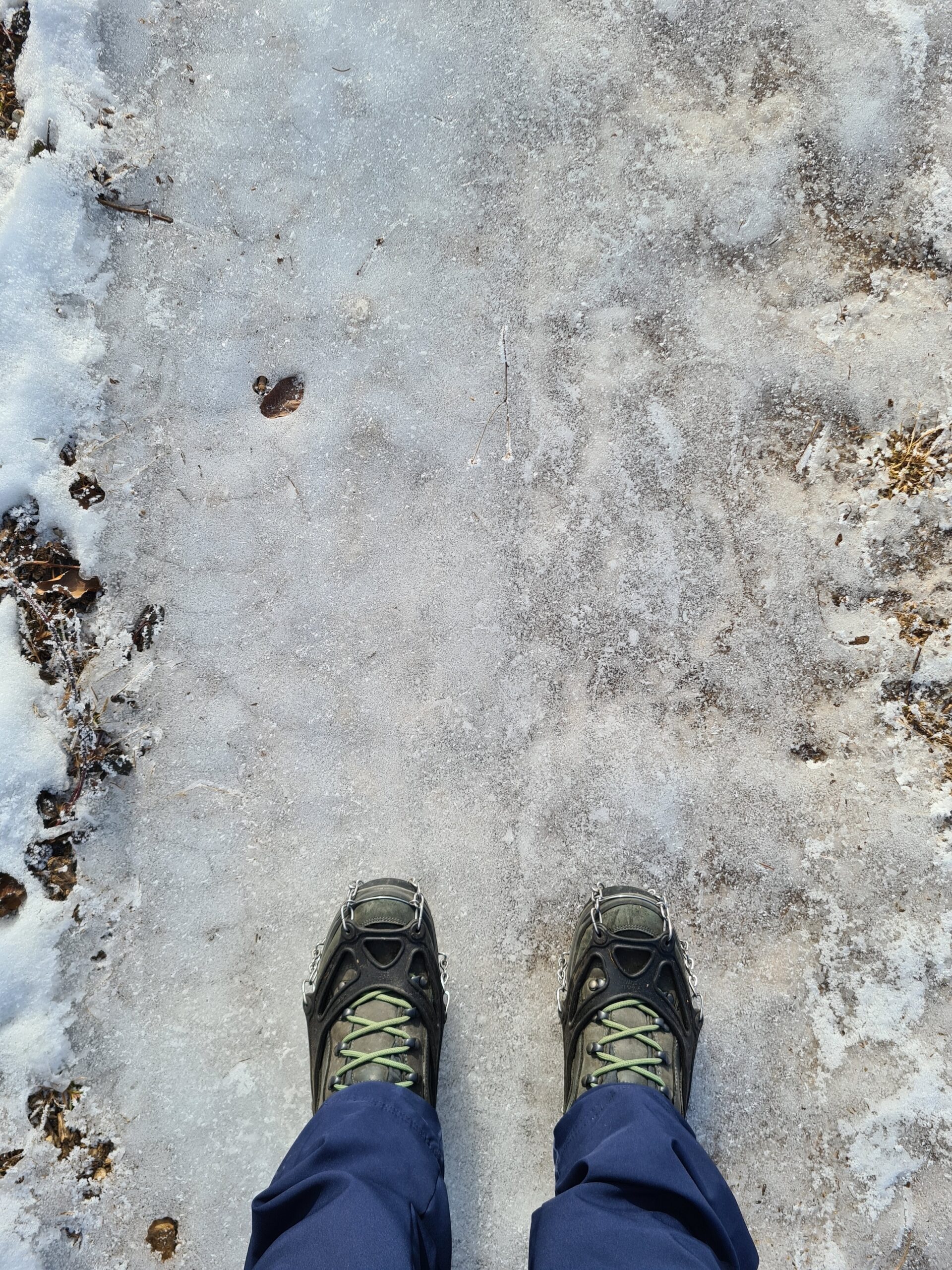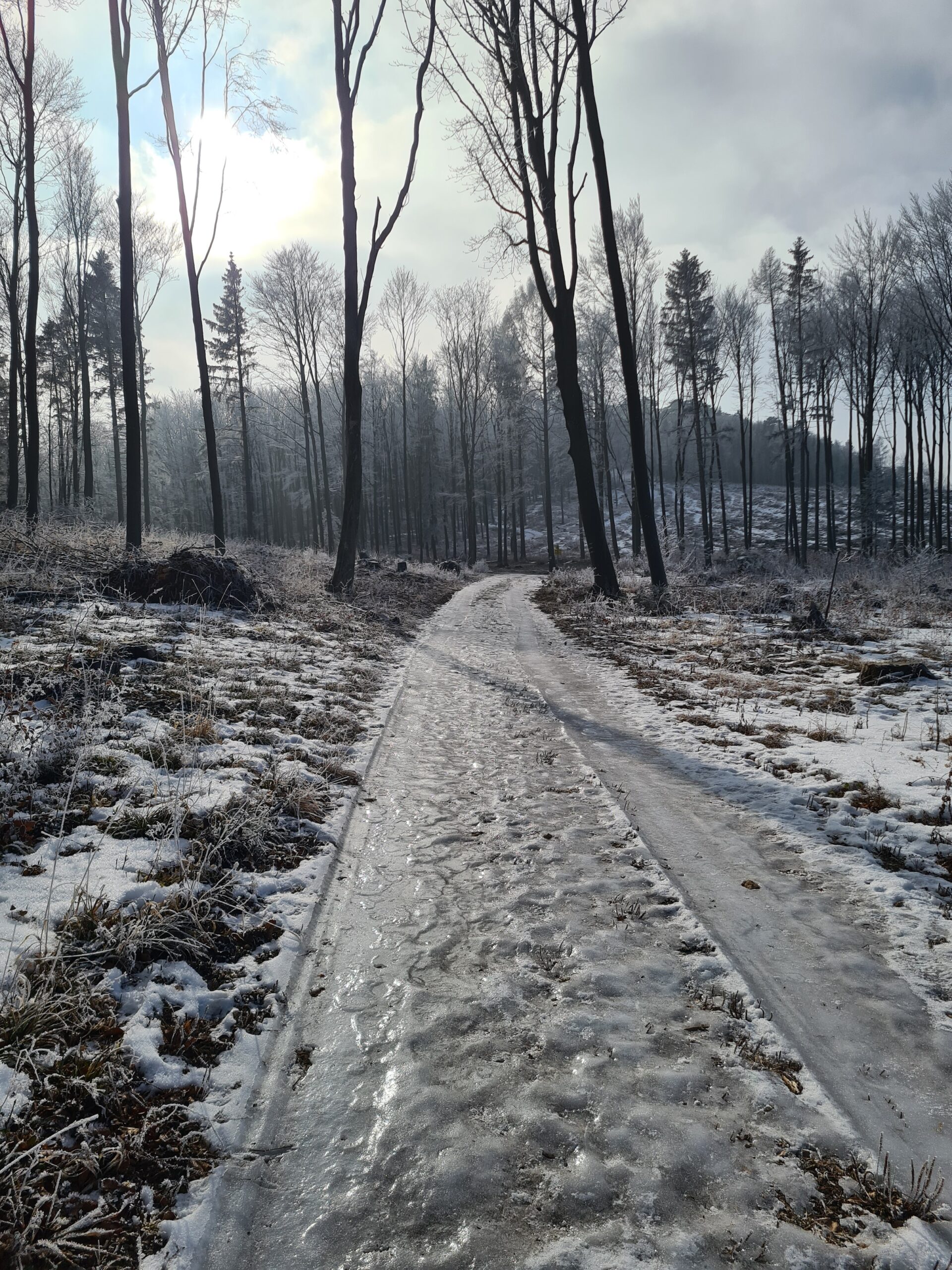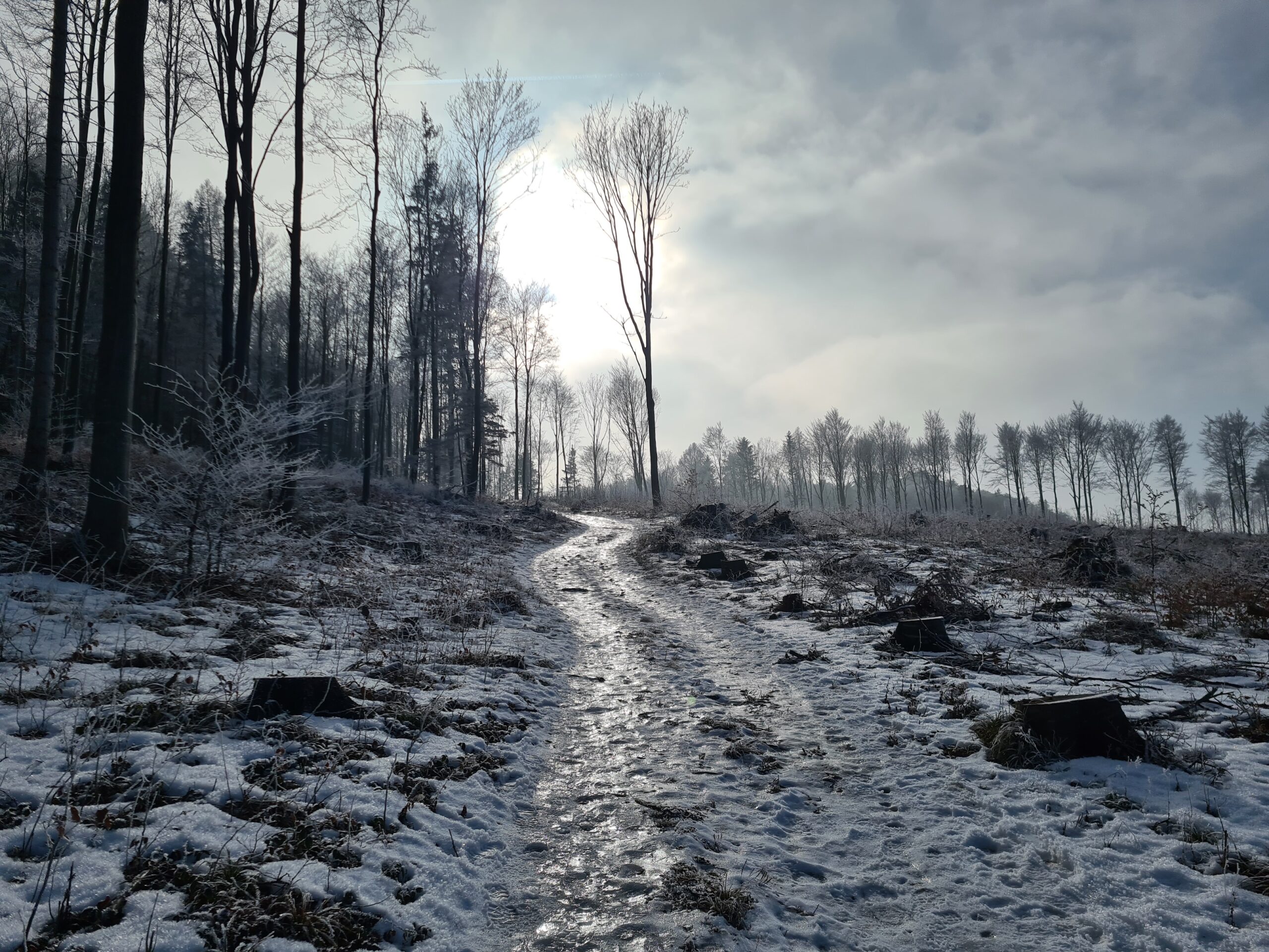 Von der Ruine ging ich nun weiter bergauf Richtung Lärbaumkreuz. Der Weg war teilweise die reinste Eisbahn, wie man an den Spiegelungen in der Sonne gut erkennen kann. Ohne Grödel hätte mich hier auch das beste Schuhprofil nicht mehr weitergebracht.