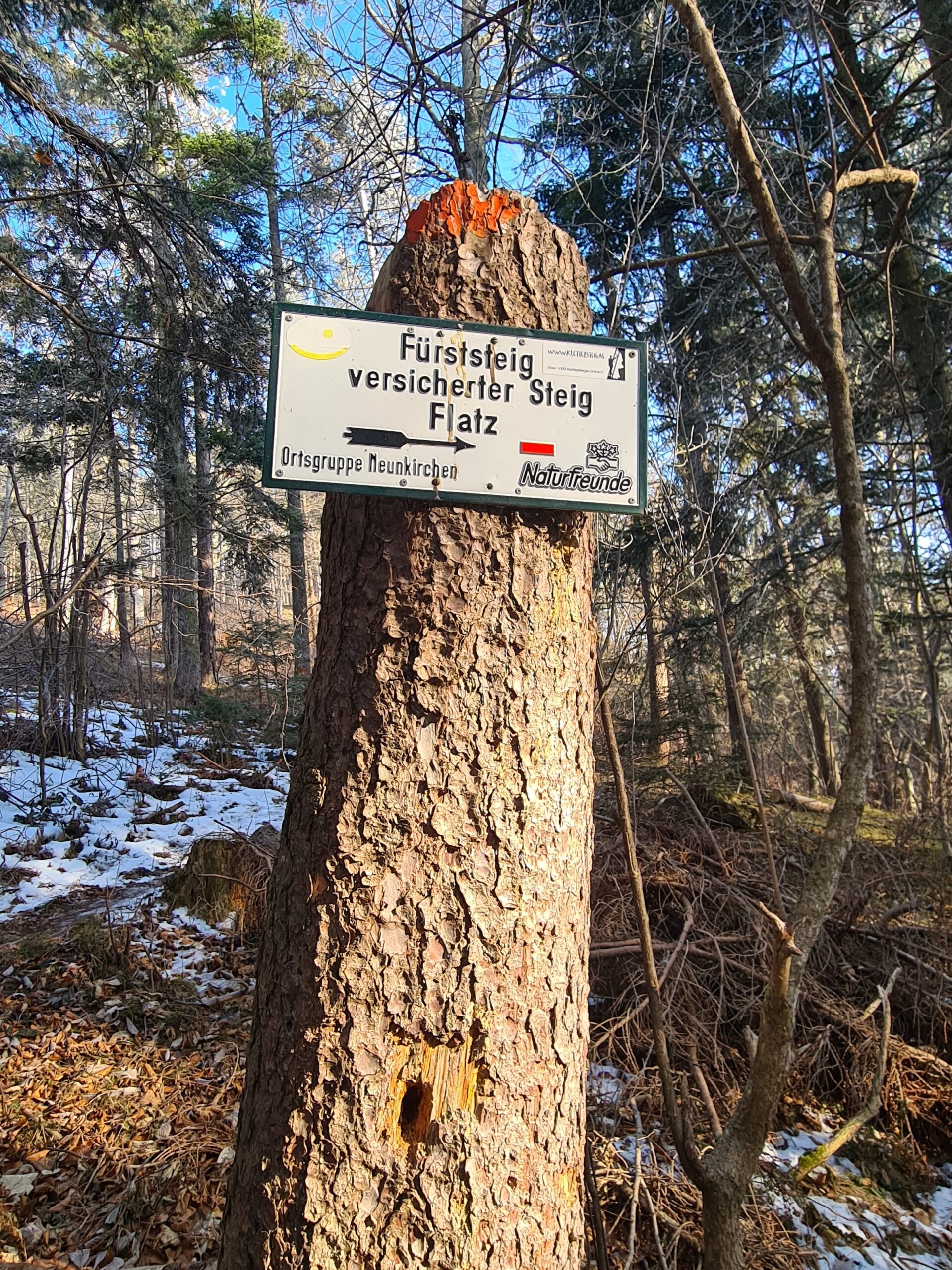 Ich folgte zunächst den Schildern Richtung Neunkirchner Haus, hielt mich am Ende aber links, als der Weg dorthin rechts abbog. Vor einem Jahr war ich in dieser Gegend schon einmal gewandert und nun wollte ich neue Wege ausprobieren. Kurz nach der Abzweigung zum Neunkirchner Haus zweigte dann auch für mich ein kleiner Pfad zum Fürststeig ab. Es gibt auf der Flatzer Wand eine Reihe von Klettersteigen unterschiedlicher Schwierigkeitsstufe. Der Fürststeig ist als Kategorie A eingestuft und ist eher ein gesicherter, steiler Wanderweg, der kein Klettersteigset erfordert und sich auch gut bergab gehen lässt. Überall dort, wo es steiler und unter Umständen auch rutschiger ist, gibt es eine Sicherung. Am Ende führt eine Leiter in eine kleine Durchgangshöhle.