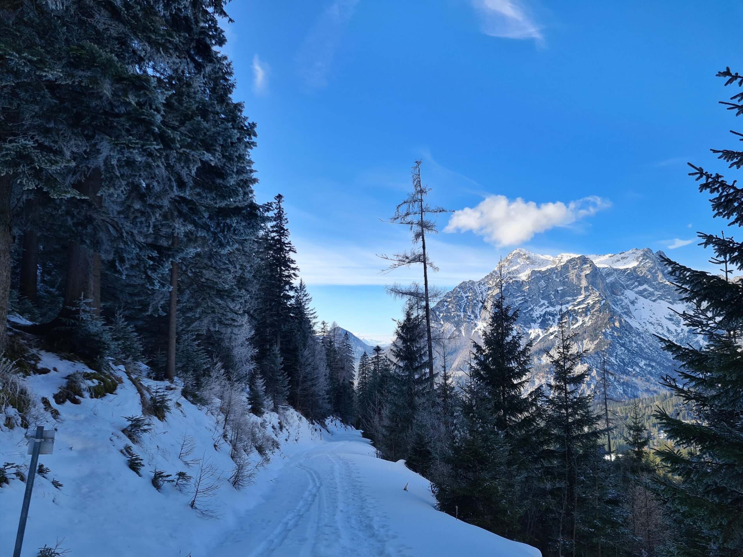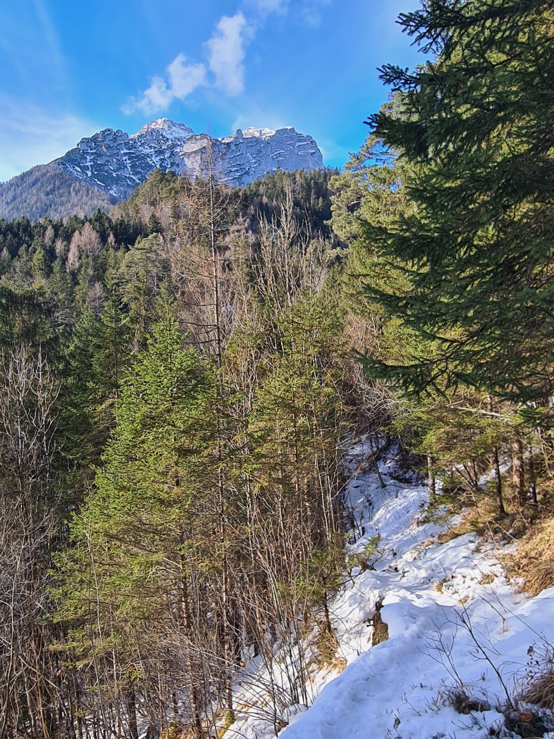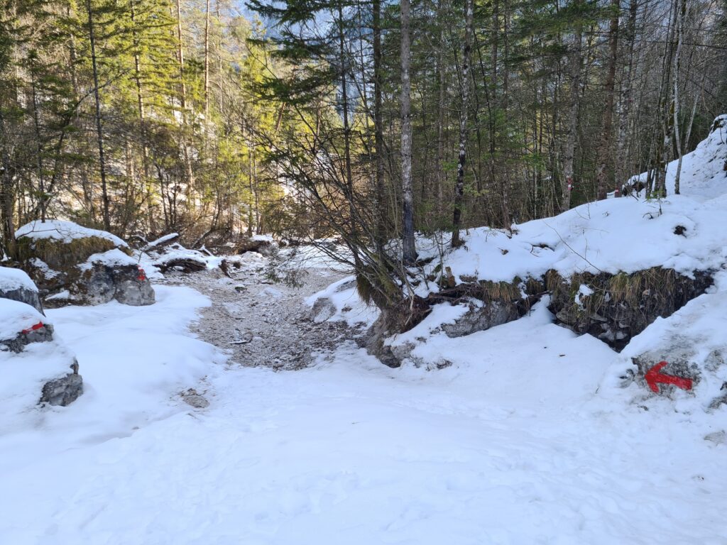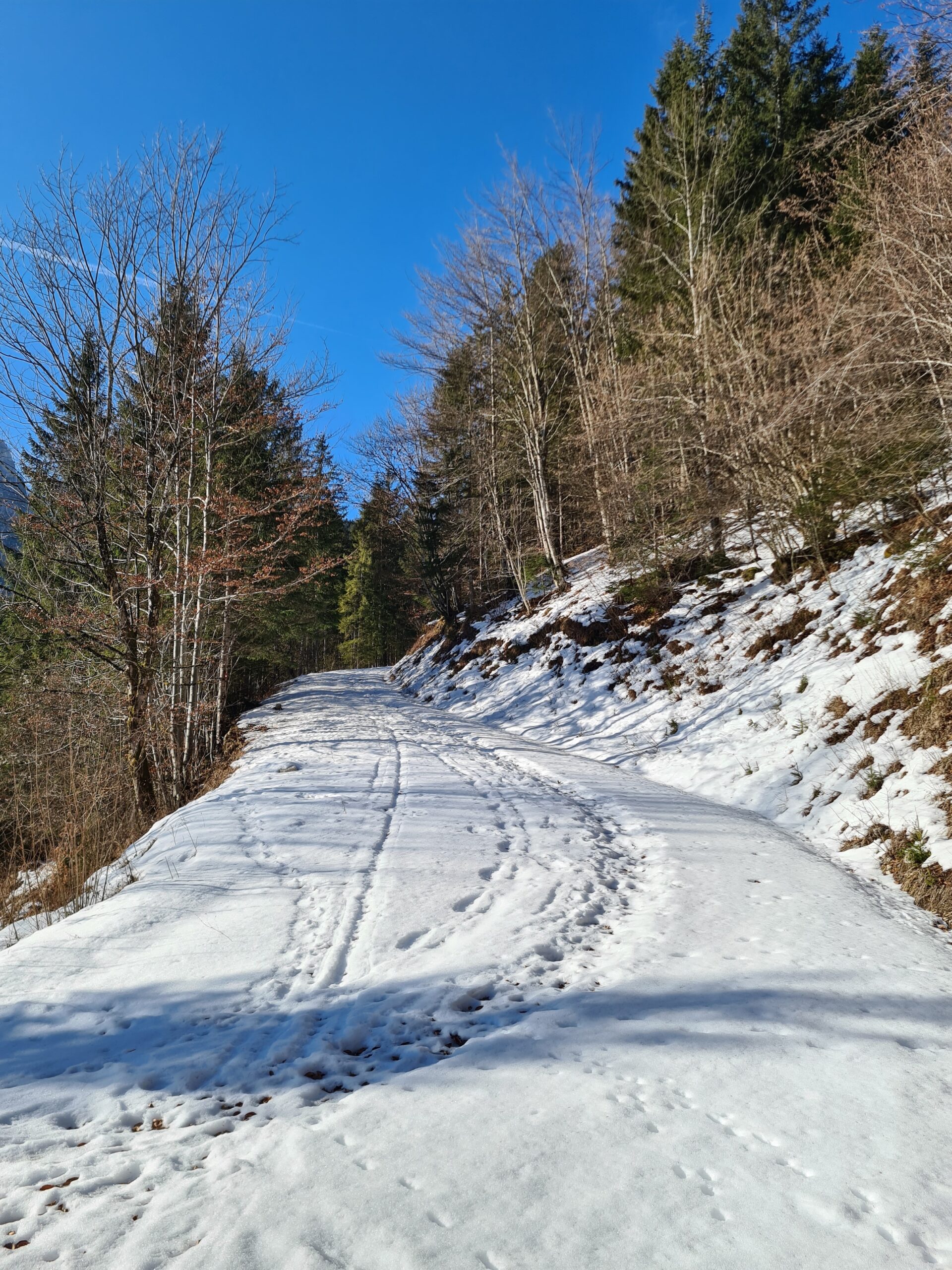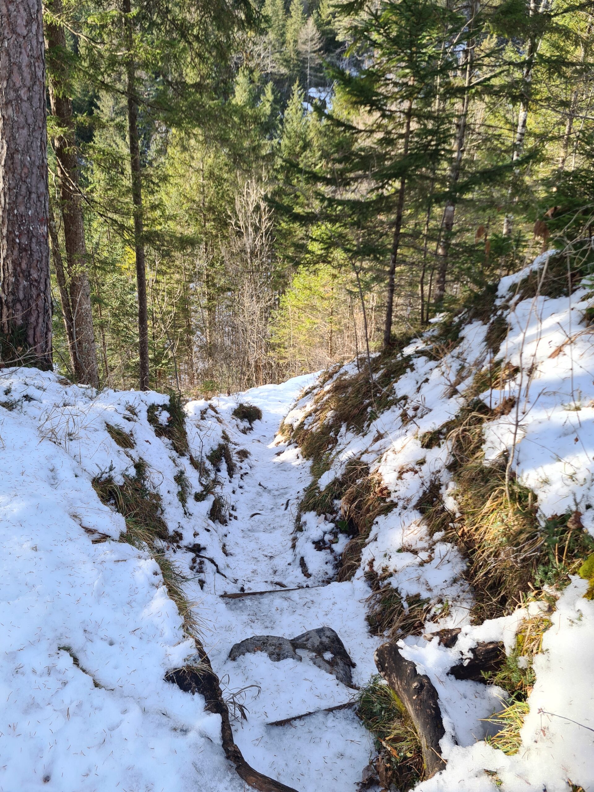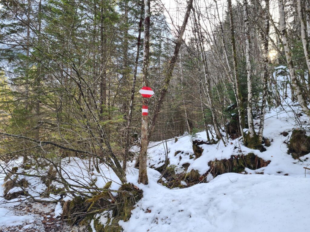 Nach etwa zwei Kilometer war es mit dem sanften Einstieg vorbei und es ging nun stetig bergauf. Der Wanderweg und die Forststraße kreuzen sich hier immer wieder. Der Wanderweg ist etwas steiler, aber deutlich kürzer. Bei den aktuellen Schneeverhältnissen war er allerdings teilweise etwas mühsam zu gehen. Der Schnee war ziemlich fest und teils gefroren und ich rutschte abwechselnd entweder weg oder brach in den Schnee ein. Gegen das Wegrutschen halfen aber zum Glück die Grödel, die ich bald an die Schuhe schnallte. Trotzdem ging ich zwischendurch sozusagen zur Entspannung eine Kehre auf der Straße aus. Weiter oben, als der Schnee weniger wurde, blieb ich dann ganz auf dem Wanderweg.