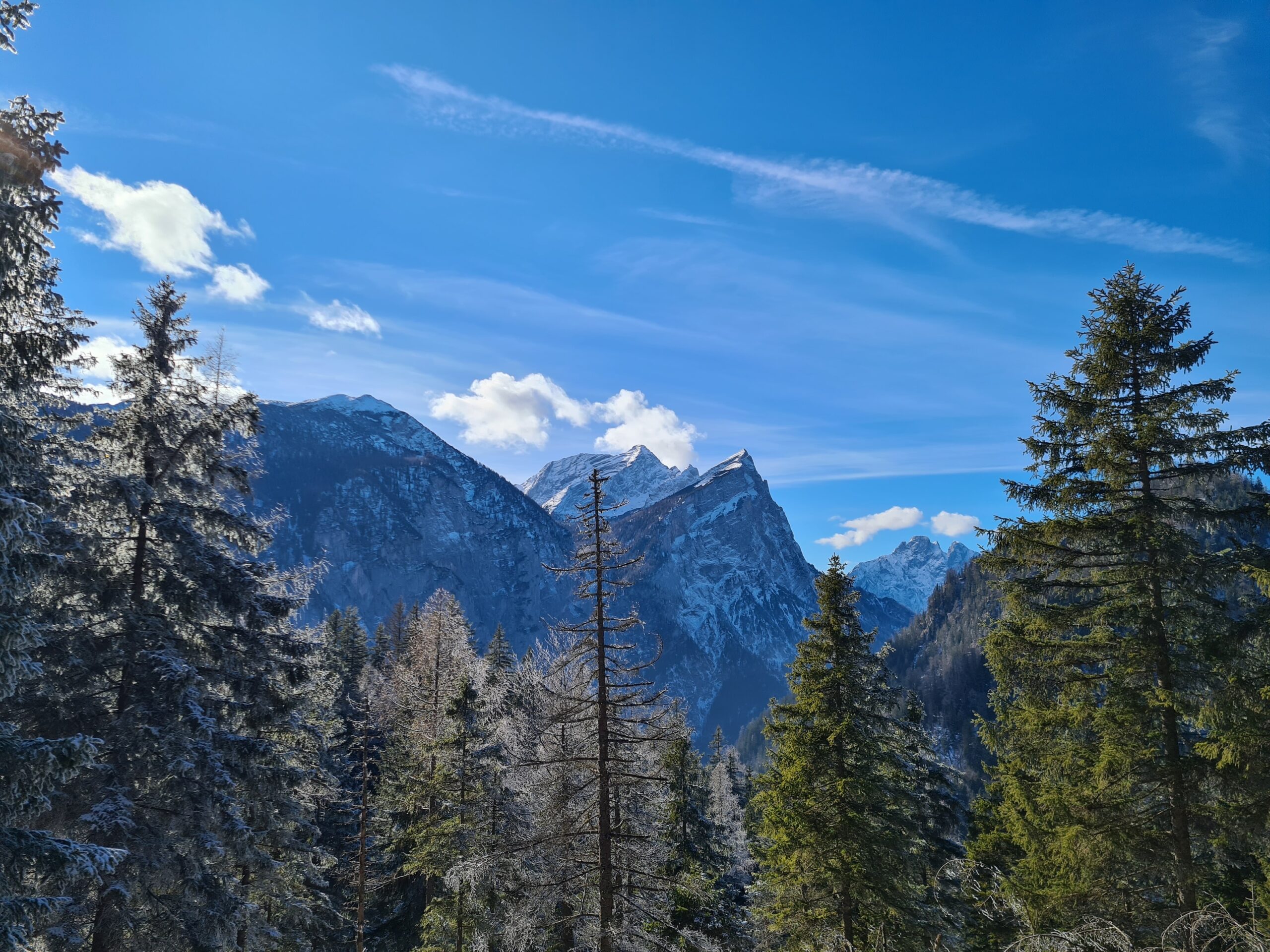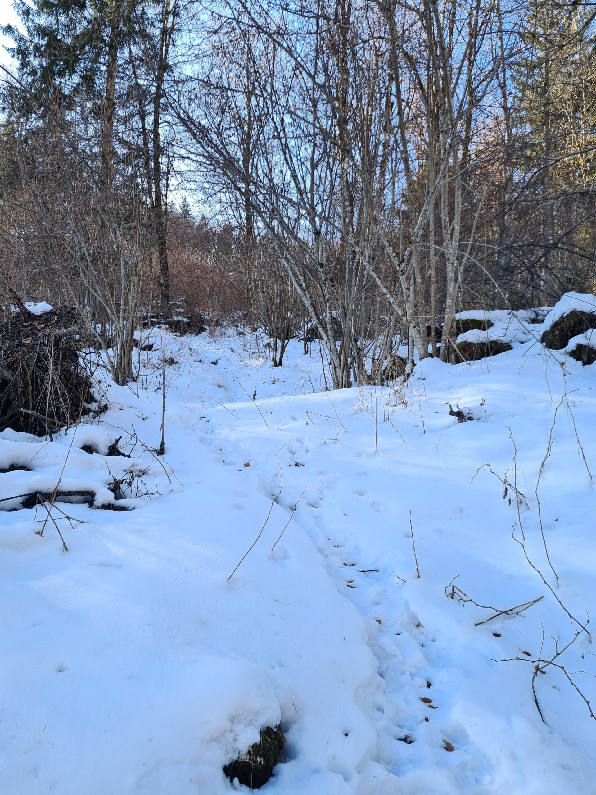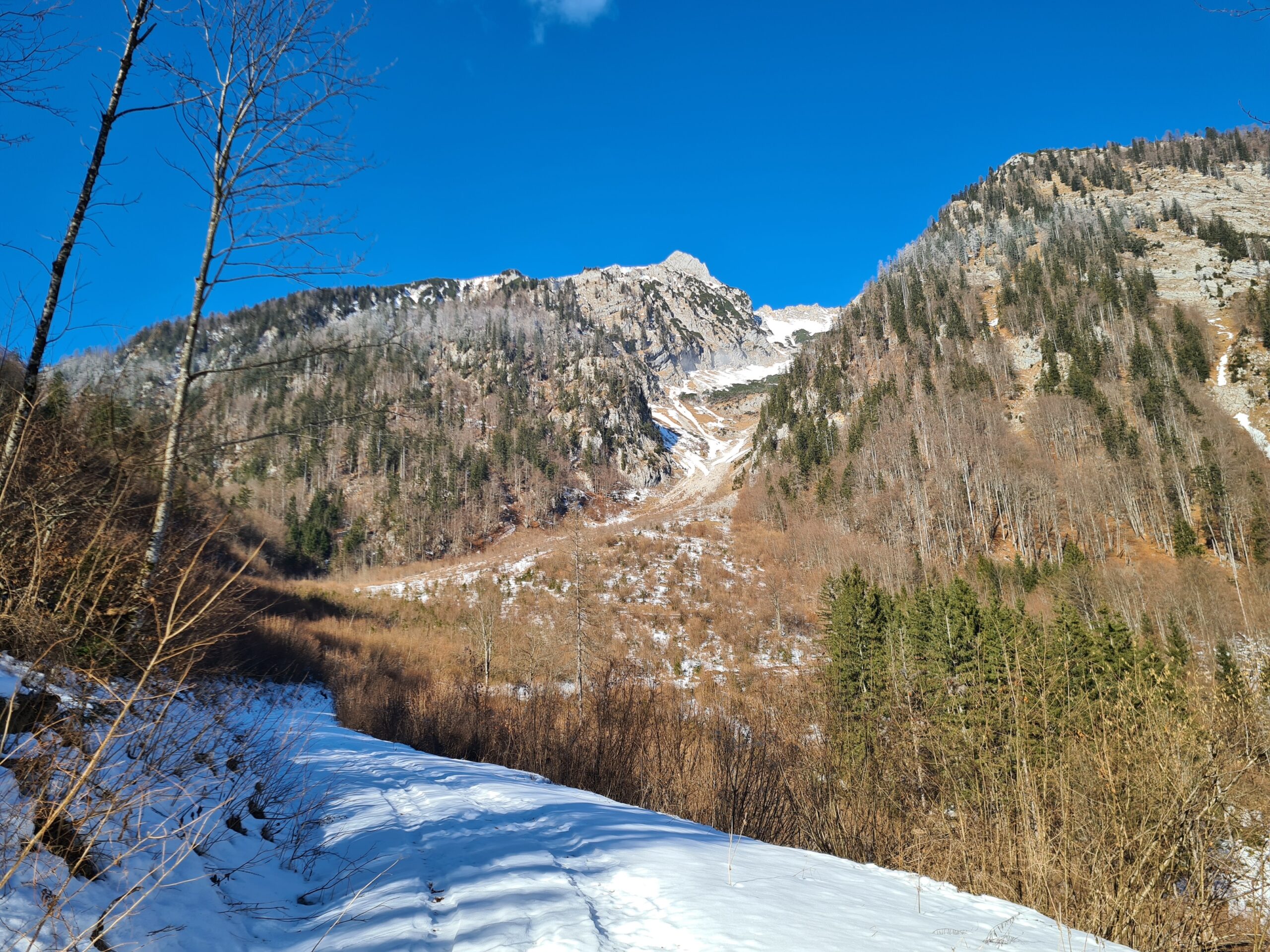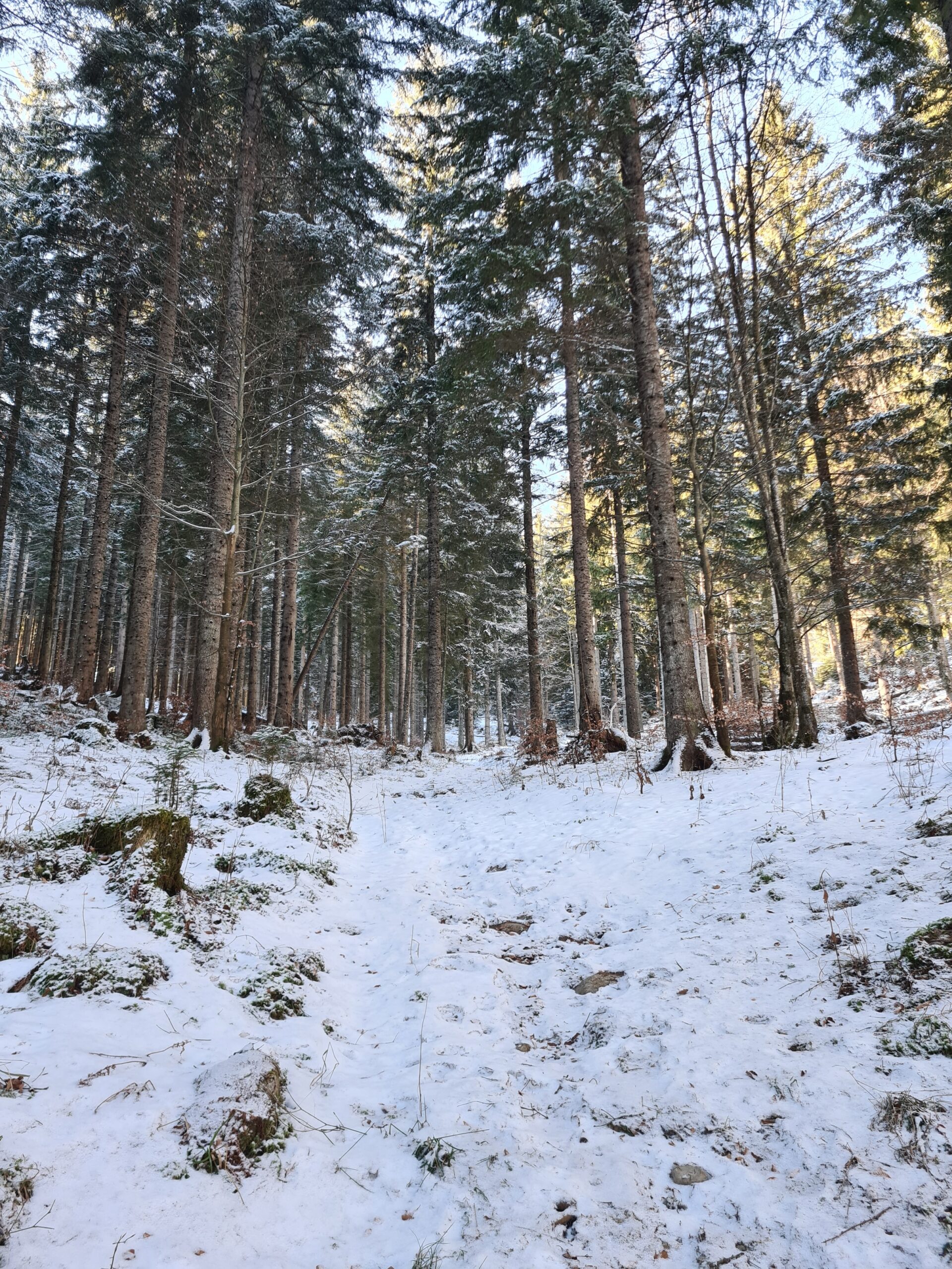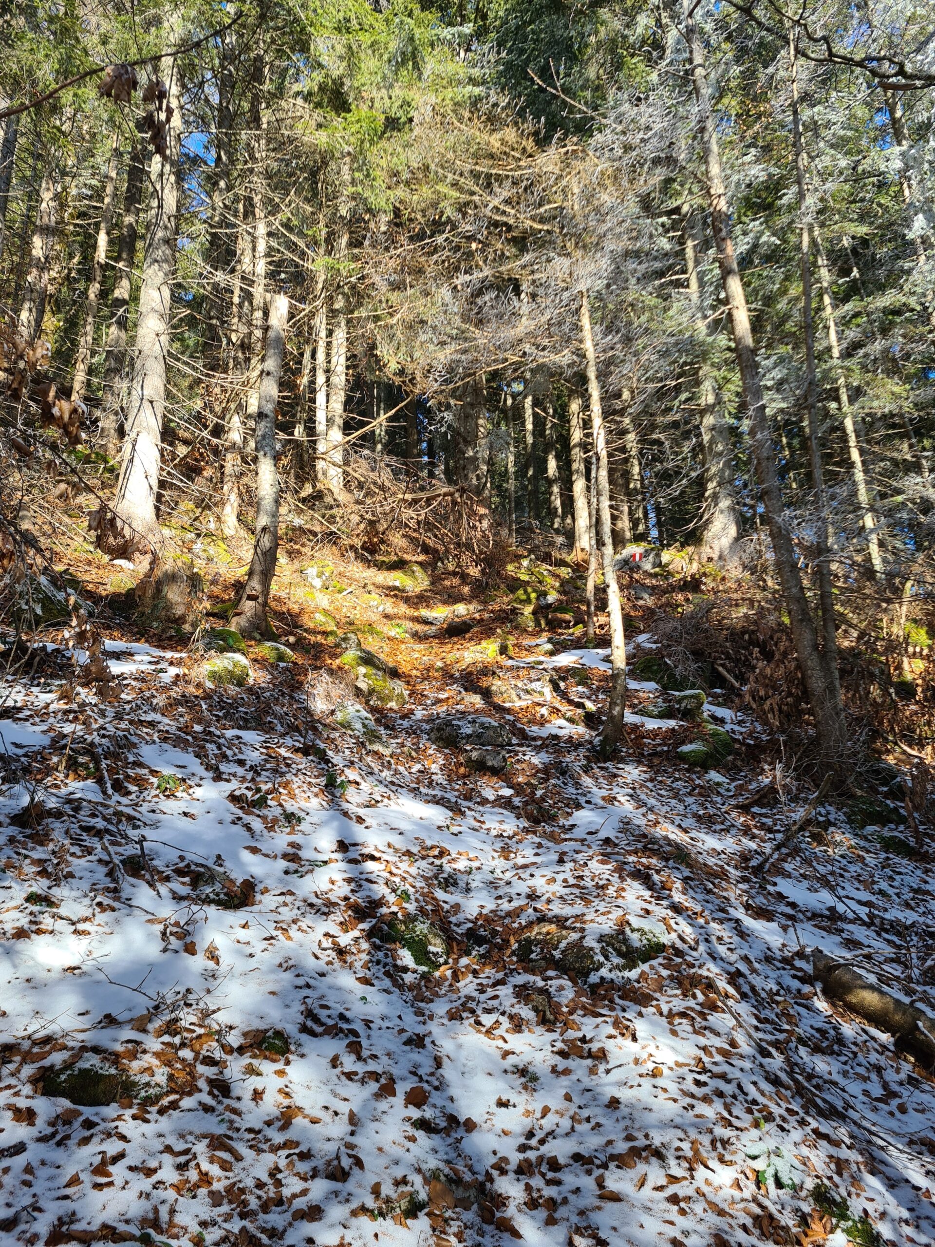 Nach etwa zwei Kilometer war es mit dem sanften Einstieg vorbei und es ging nun stetig bergauf. Der Wanderweg und die Forststraße kreuzen sich hier immer wieder. Der Wanderweg ist etwas steiler, aber deutlich kürzer. Bei den aktuellen Schneeverhältnissen war er allerdings teilweise etwas mühsam zu gehen. Der Schnee war ziemlich fest und teils gefroren und ich rutschte abwechselnd entweder weg oder brach in den Schnee ein. Gegen das Wegrutschen halfen aber zum Glück die Grödel, die ich bald an die Schuhe schnallte. Trotzdem ging ich zwischendurch sozusagen zur Entspannung eine Kehre auf der Straße aus. Weiter oben, als der Schnee weniger wurde, blieb ich dann ganz auf dem Wanderweg.