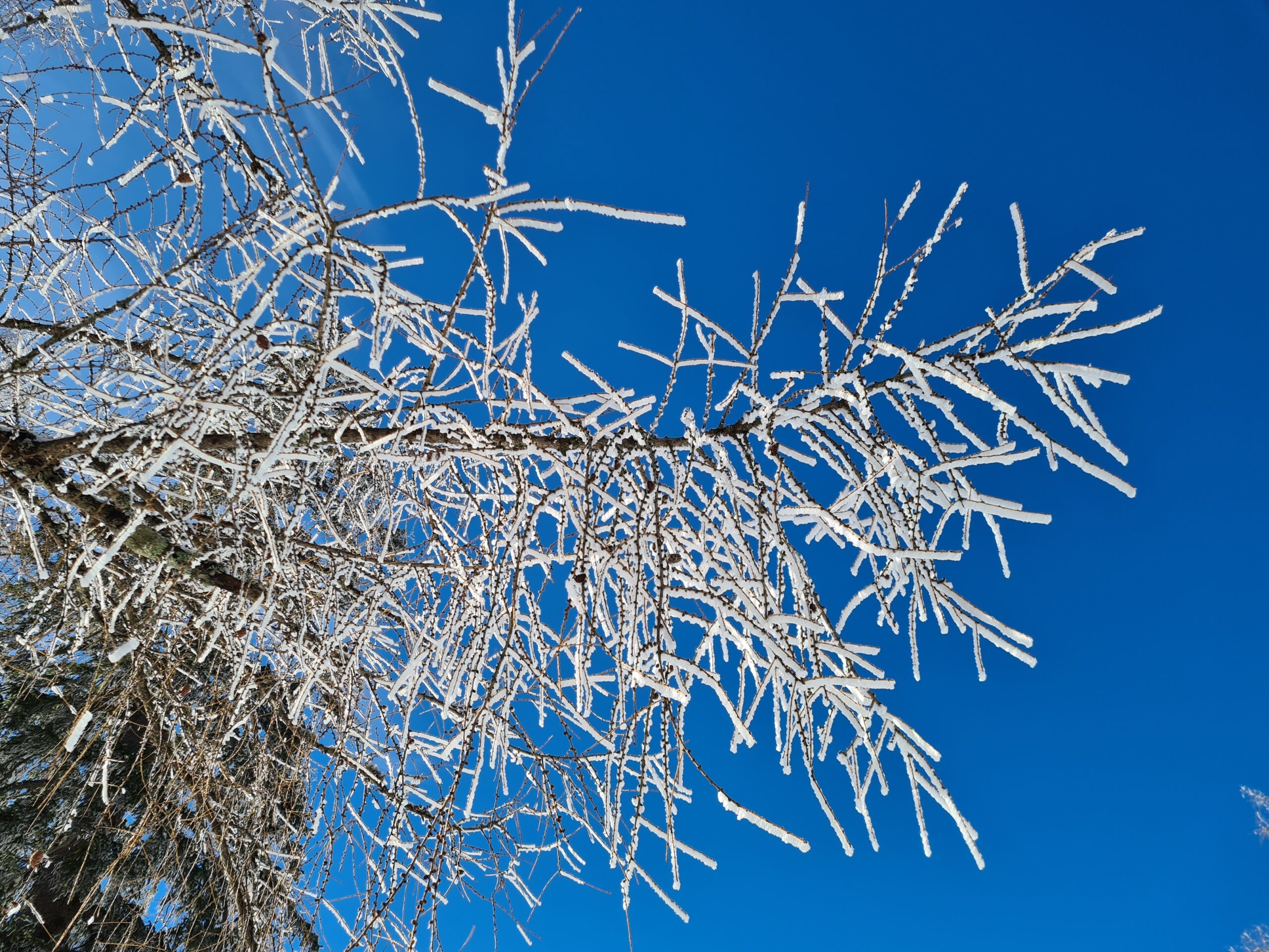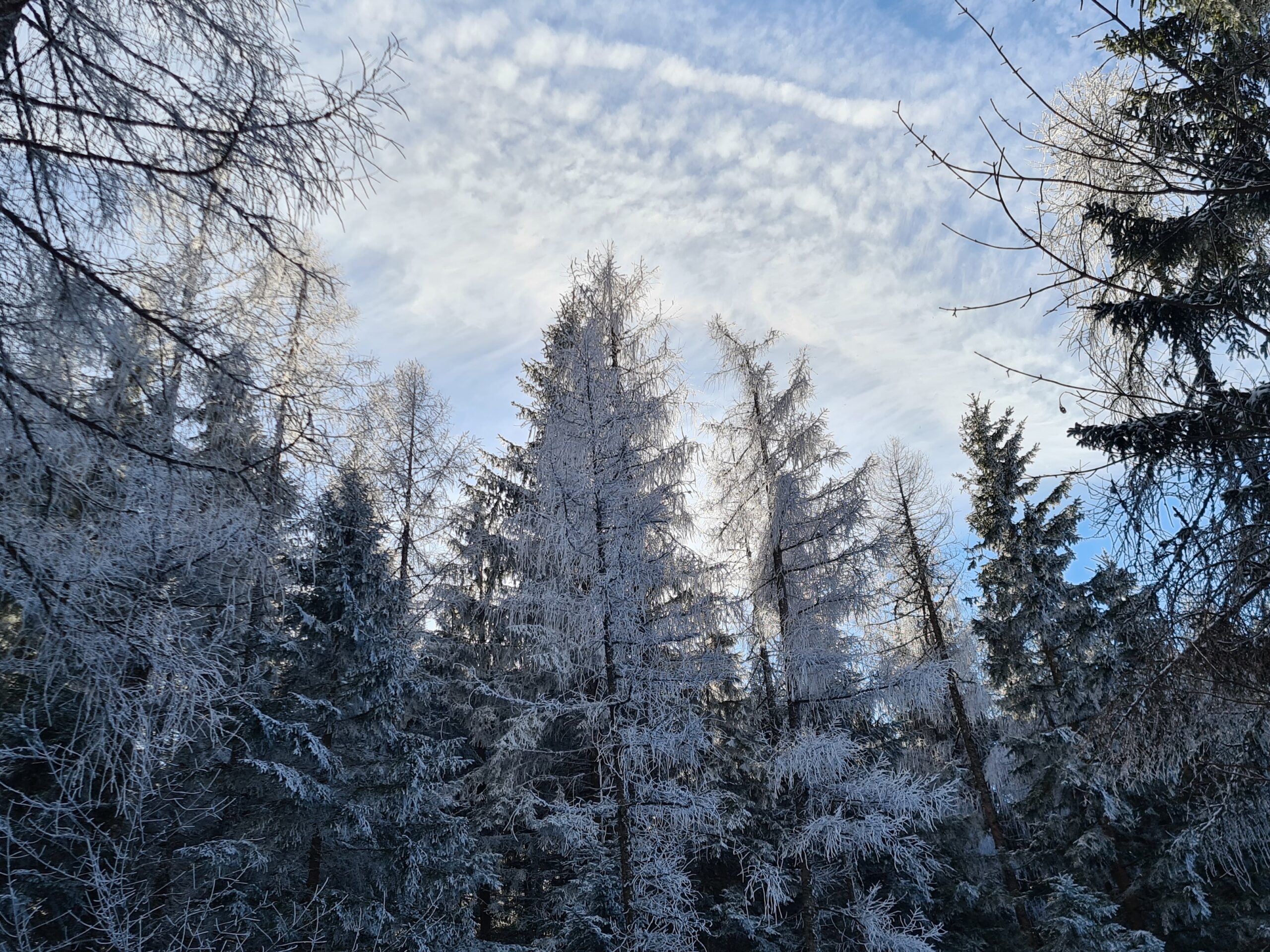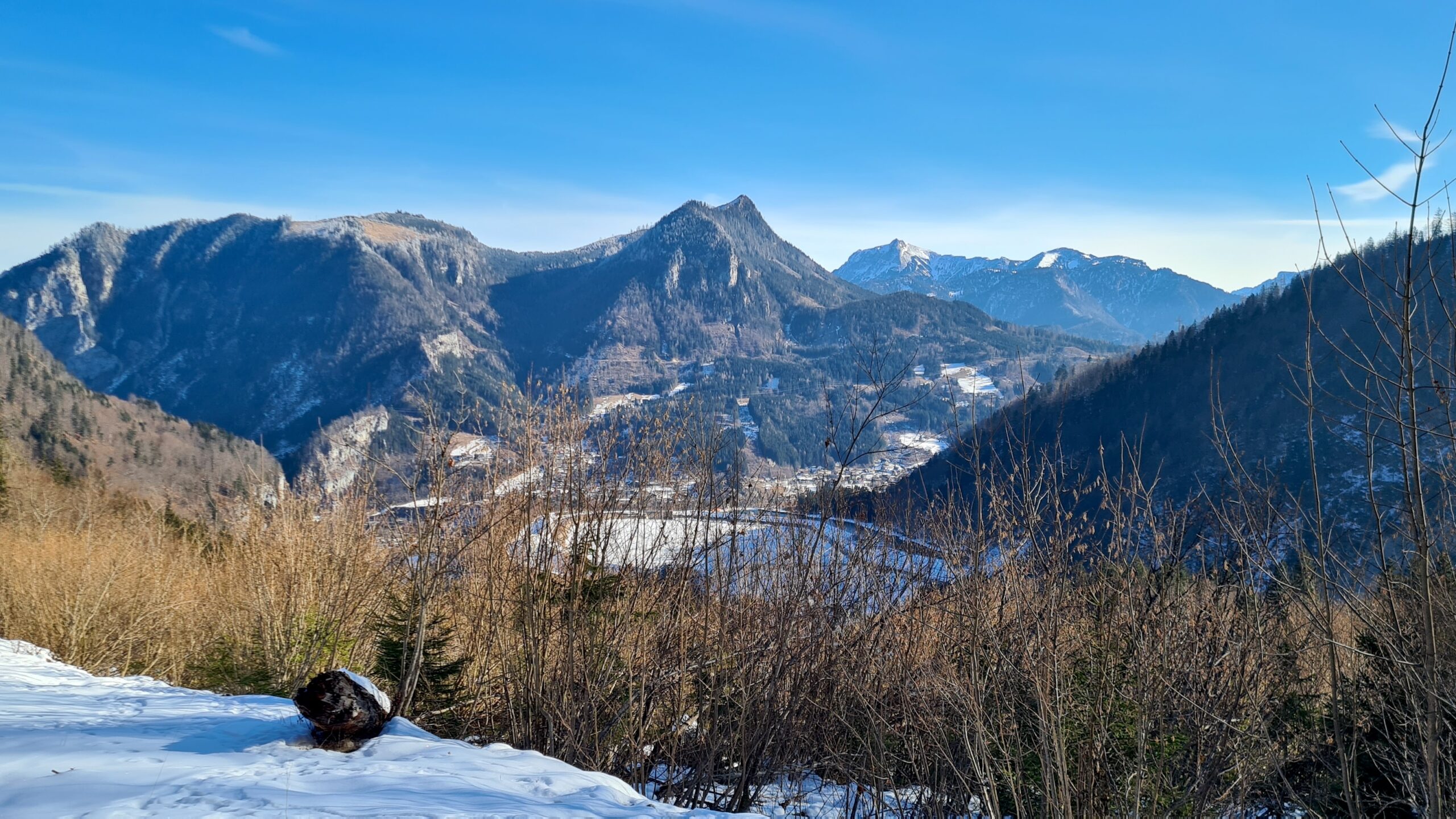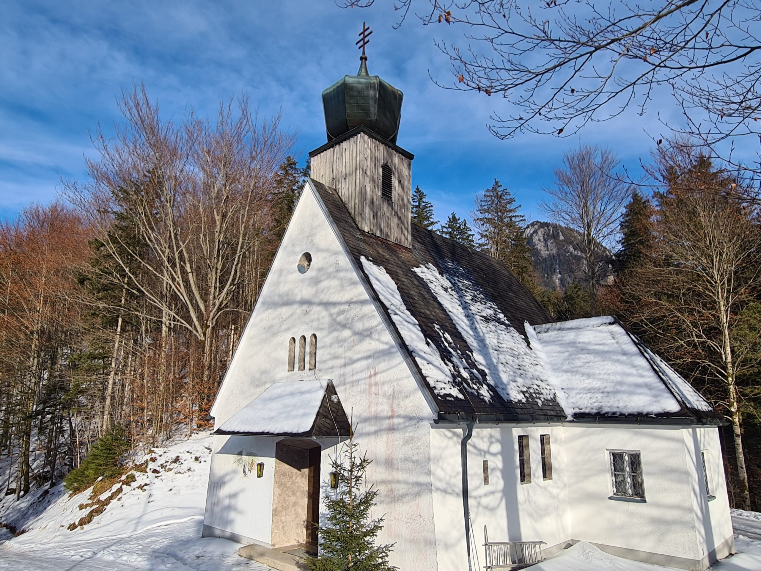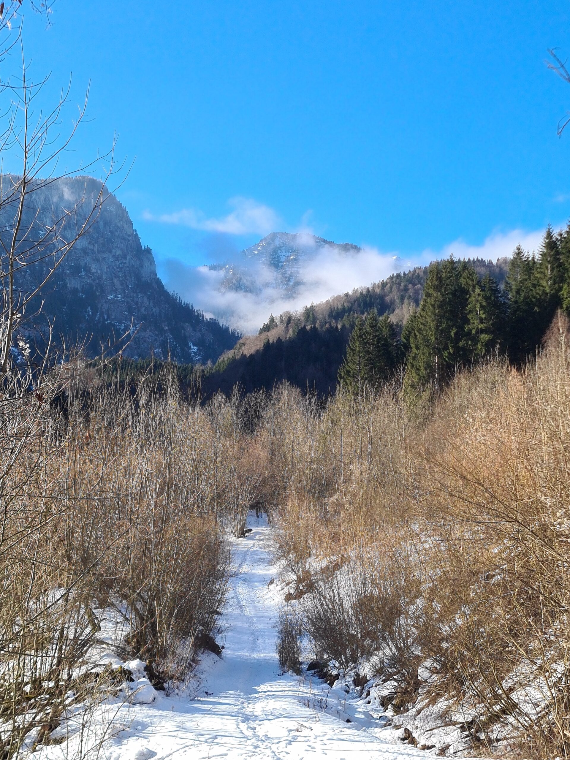 Nach etwa zwei Kilometer war es mit dem sanften Einstieg vorbei und es ging nun stetig bergauf. Der Wanderweg und die Forststraße kreuzen sich hier immer wieder. Der Wanderweg ist etwas steiler, aber deutlich kürzer. Bei den aktuellen Schneeverhältnissen war er allerdings teilweise etwas mühsam zu gehen. Der Schnee war ziemlich fest und teils gefroren und ich rutschte abwechselnd entweder weg oder brach in den Schnee ein. Gegen das Wegrutschen halfen aber zum Glück die Grödel, die ich bald an die Schuhe schnallte. Trotzdem ging ich zwischendurch sozusagen zur Entspannung eine Kehre auf der Straße aus. Weiter oben, als der Schnee weniger wurde, blieb ich dann ganz auf dem Wanderweg.