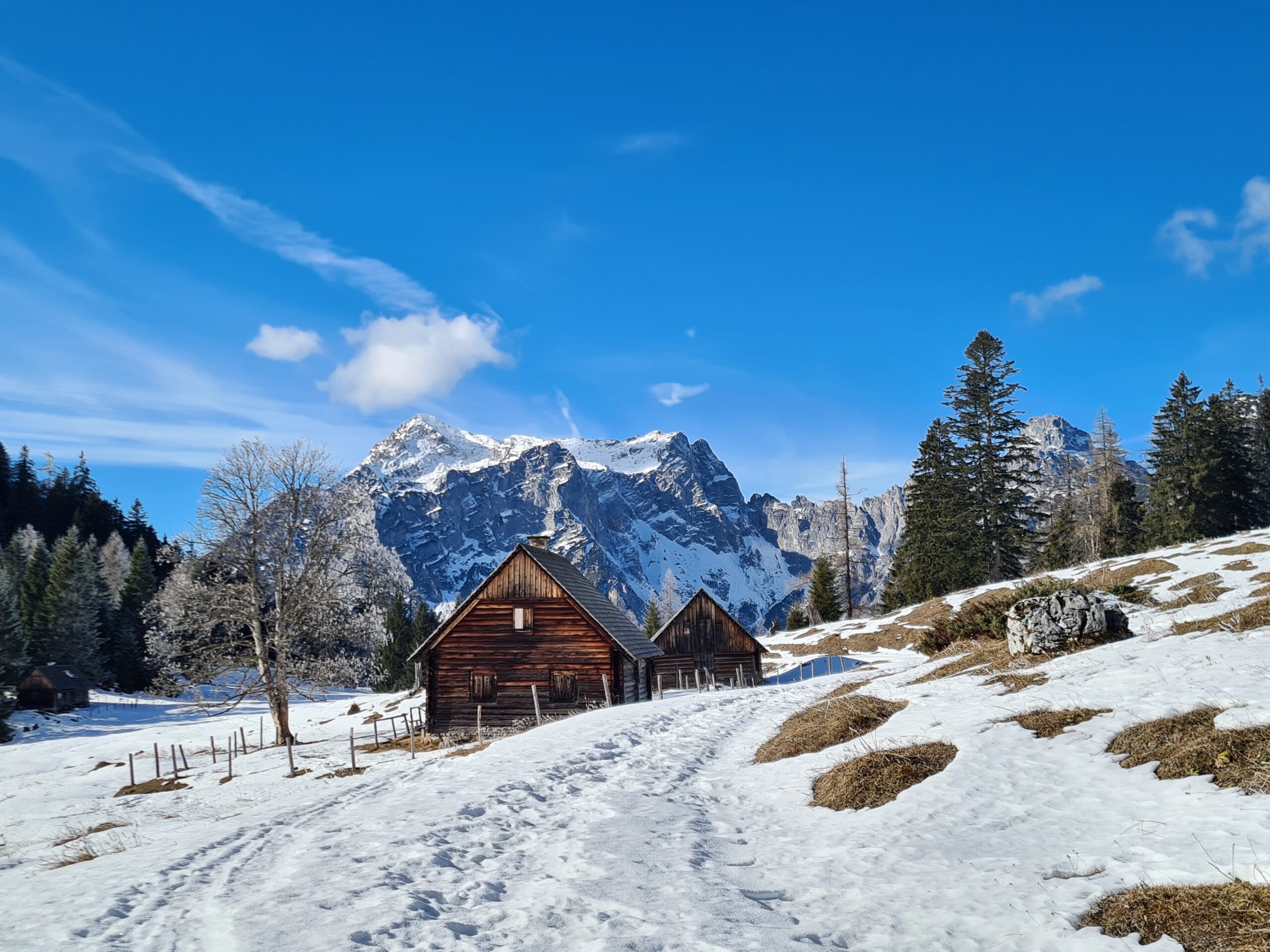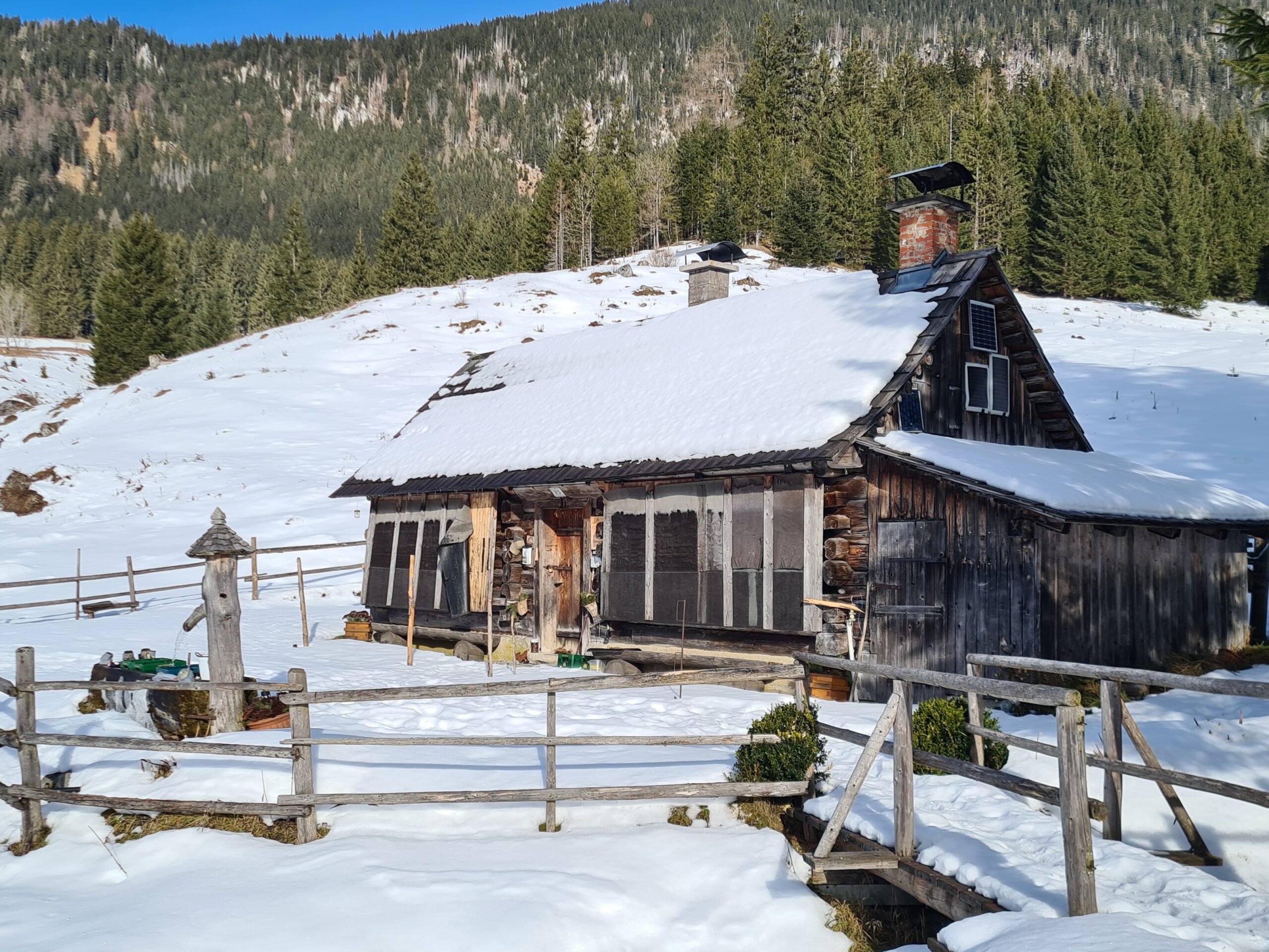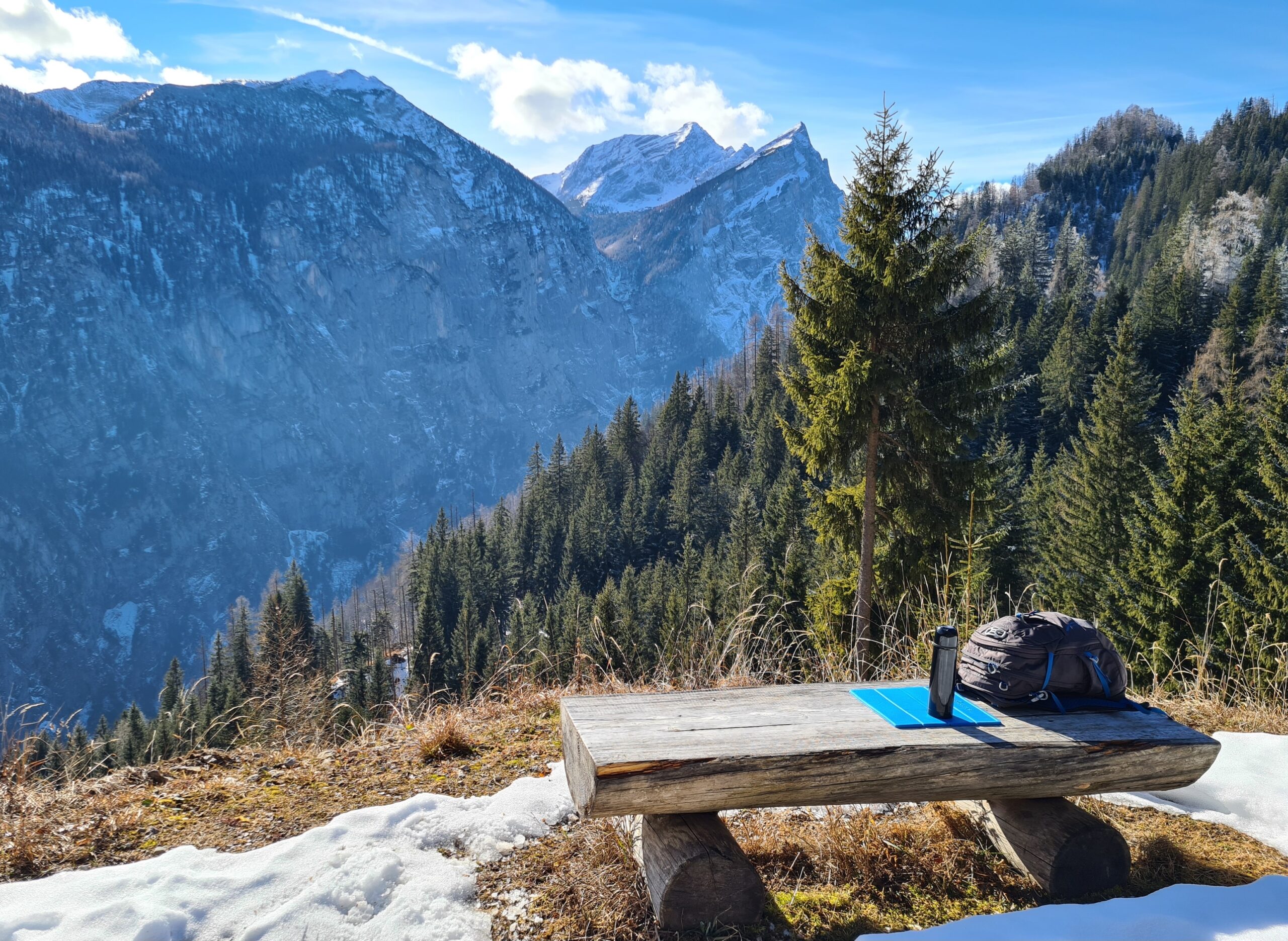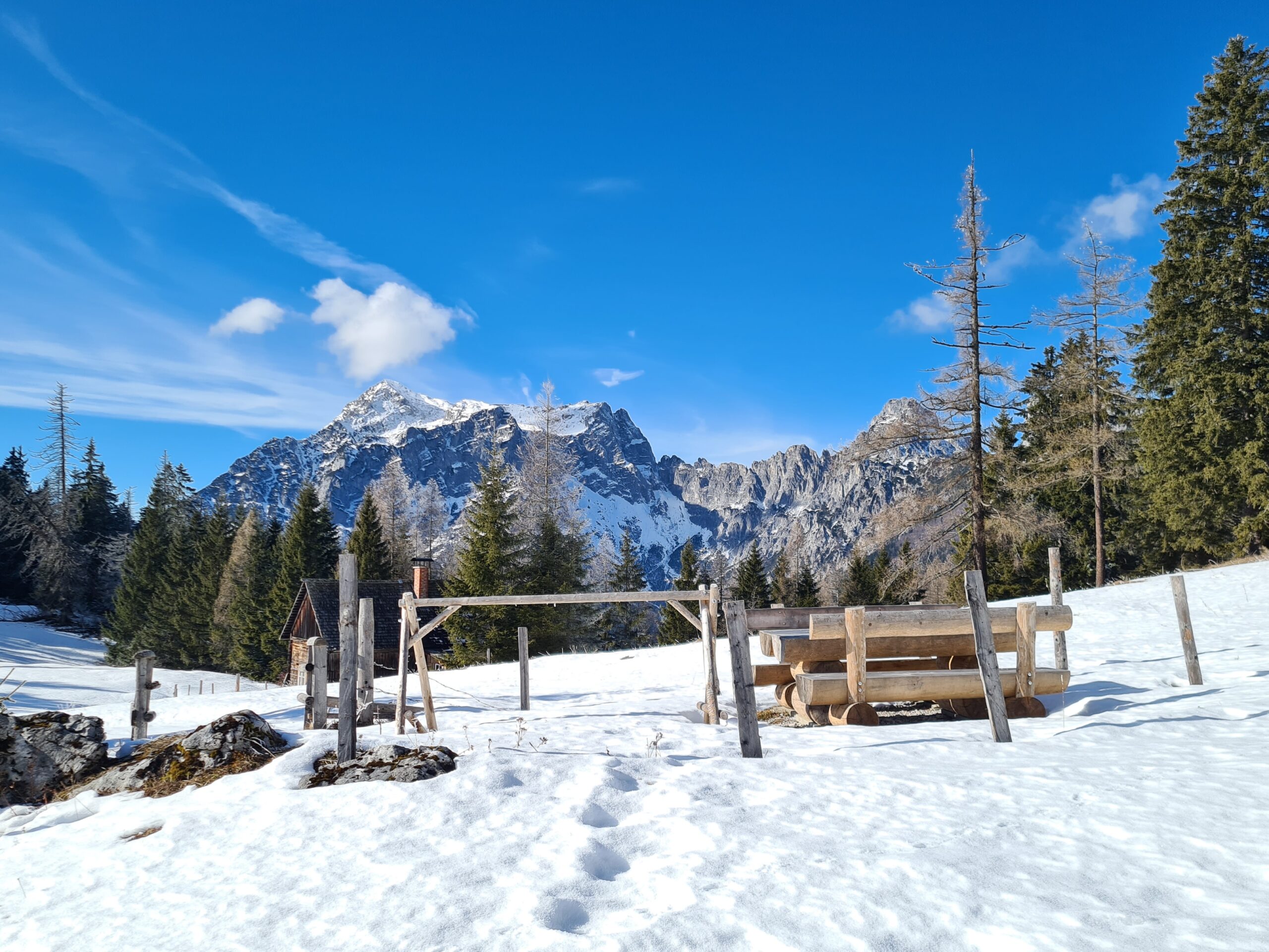 So einen schönen Pausenplatz und eine solche Wärme in der Sonne hatte ich nun schon länger nicht mehr beim Wandern, daher genoss ich mein Mittagsbrot hier umso mehr. Als ich bald darauf zur Hochscheibenalm kam, stellte ich fest, dass es auch hier einen Rastplatz mit tollem Panorama gibt. Während bisher außer auf dem Weg selbst kaum Schnee gewesen war, gab es hier oben nun eine richtig schöne Winterlandschaft.
