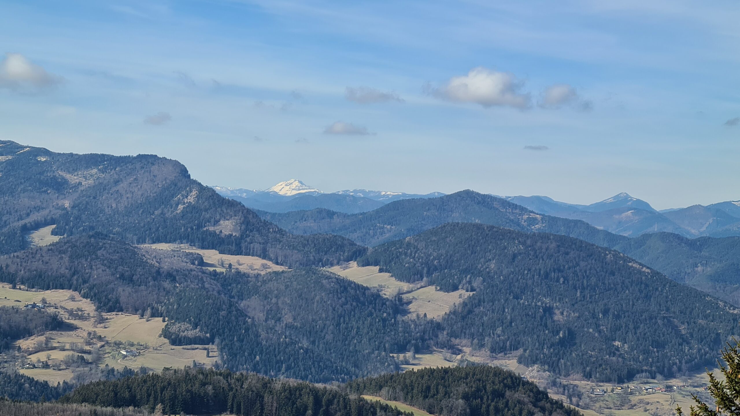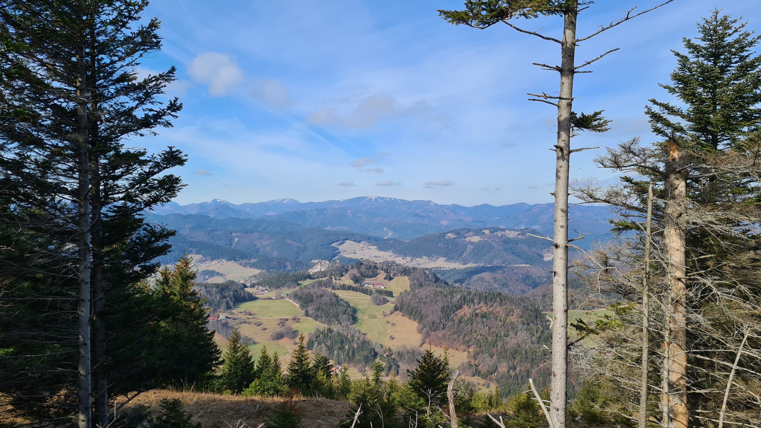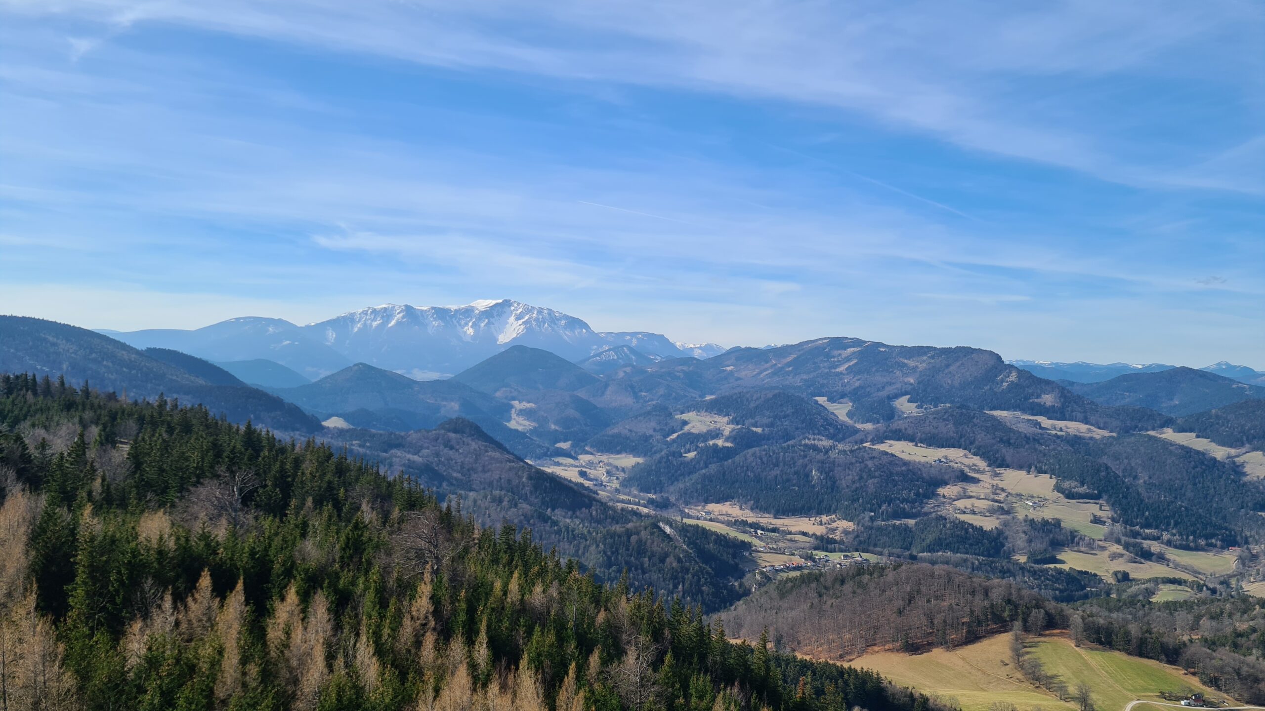 Beim zeitweilig steilen Anstieg kamen wir ordentlich ins Schwitzen, und als wir die Große Klause verließen, wärmte uns beim weiteren Weg zum Waldeggerhaus zusätzlich noch die Sonne. Unterwegs und vom Waldeggerhaus hatten wir schon erste schöne Blicke auf die Gutensteiner Alpen, den Schneeberg und den Ötscher.