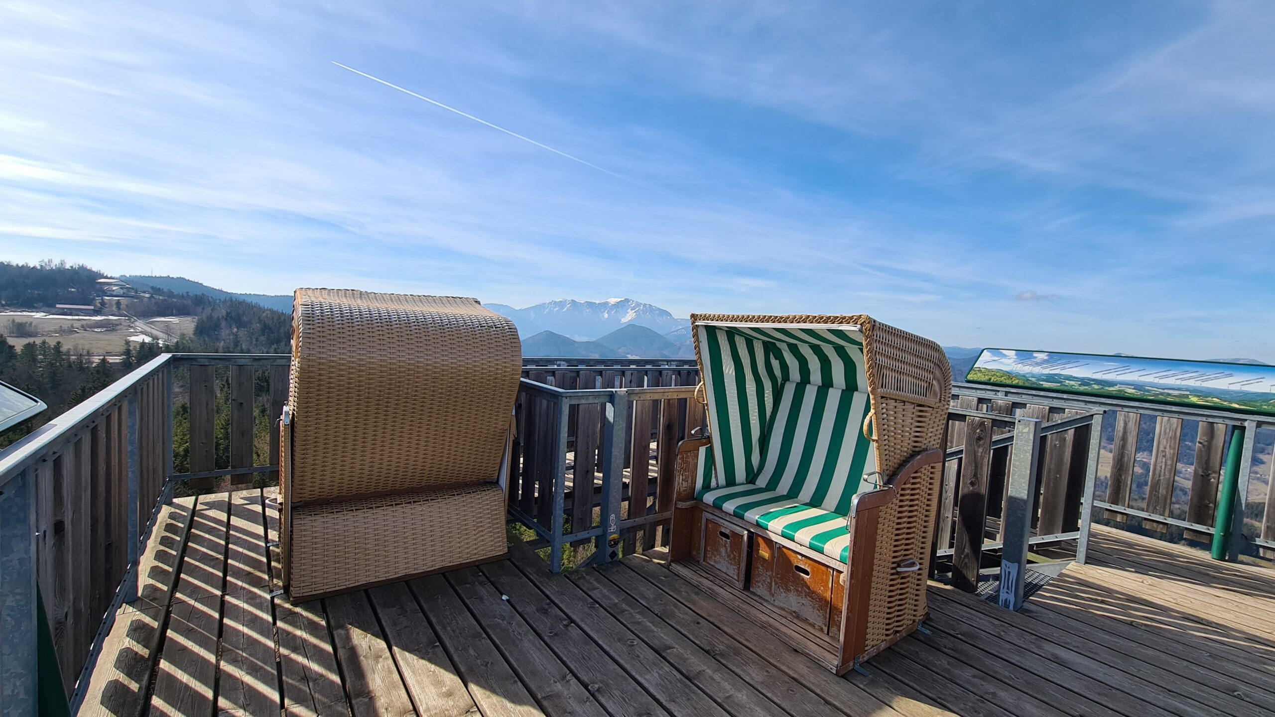 Noch schöner wurde der Ausblick dann vom Aussichtsturm, den wir gerade zur Mittagszeit erreichten. Ein passender Zeitpunkt also für unsere Jause, die wir im gemütlichen Strandkorb mit Panoramablick genossen.
