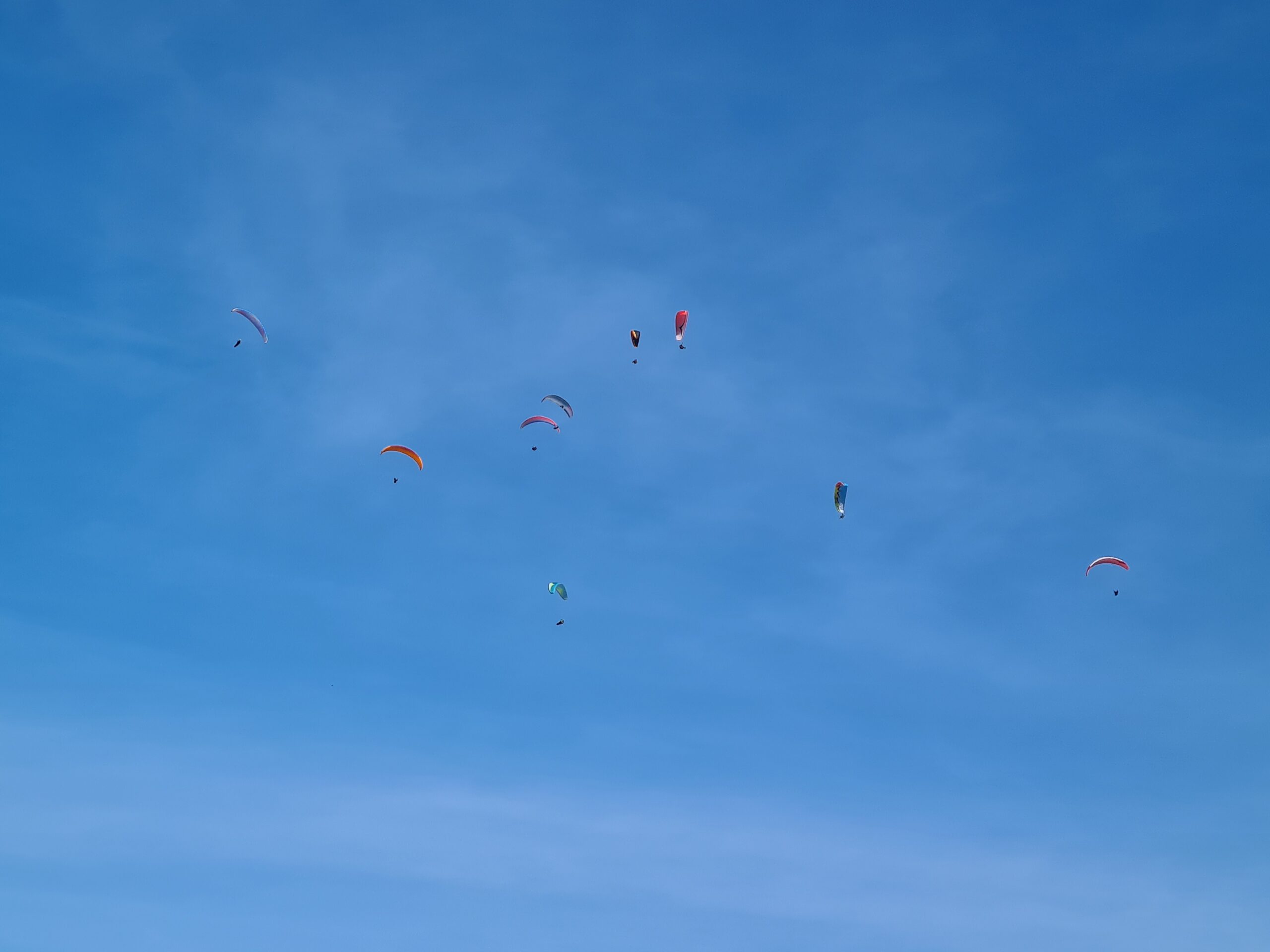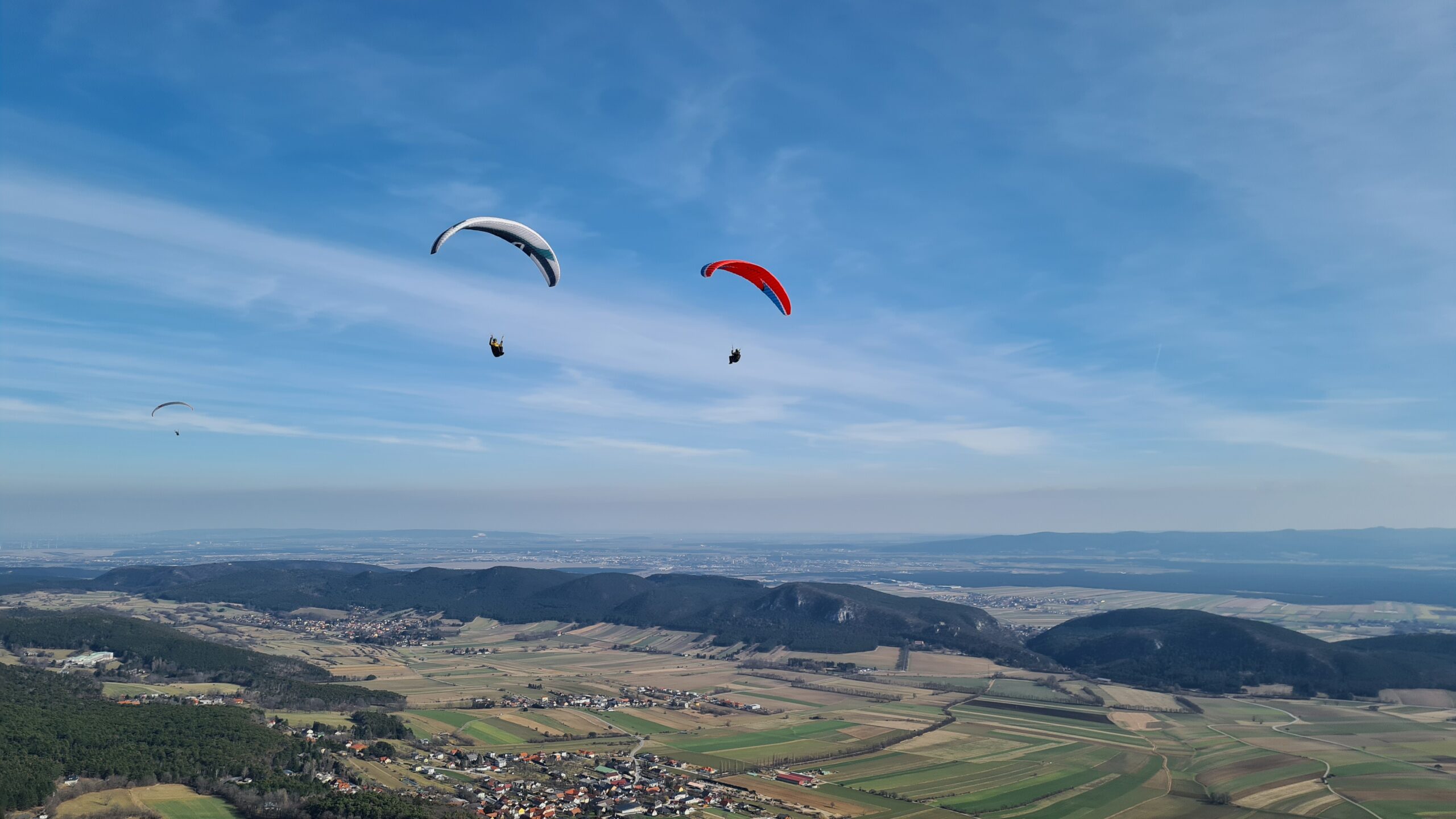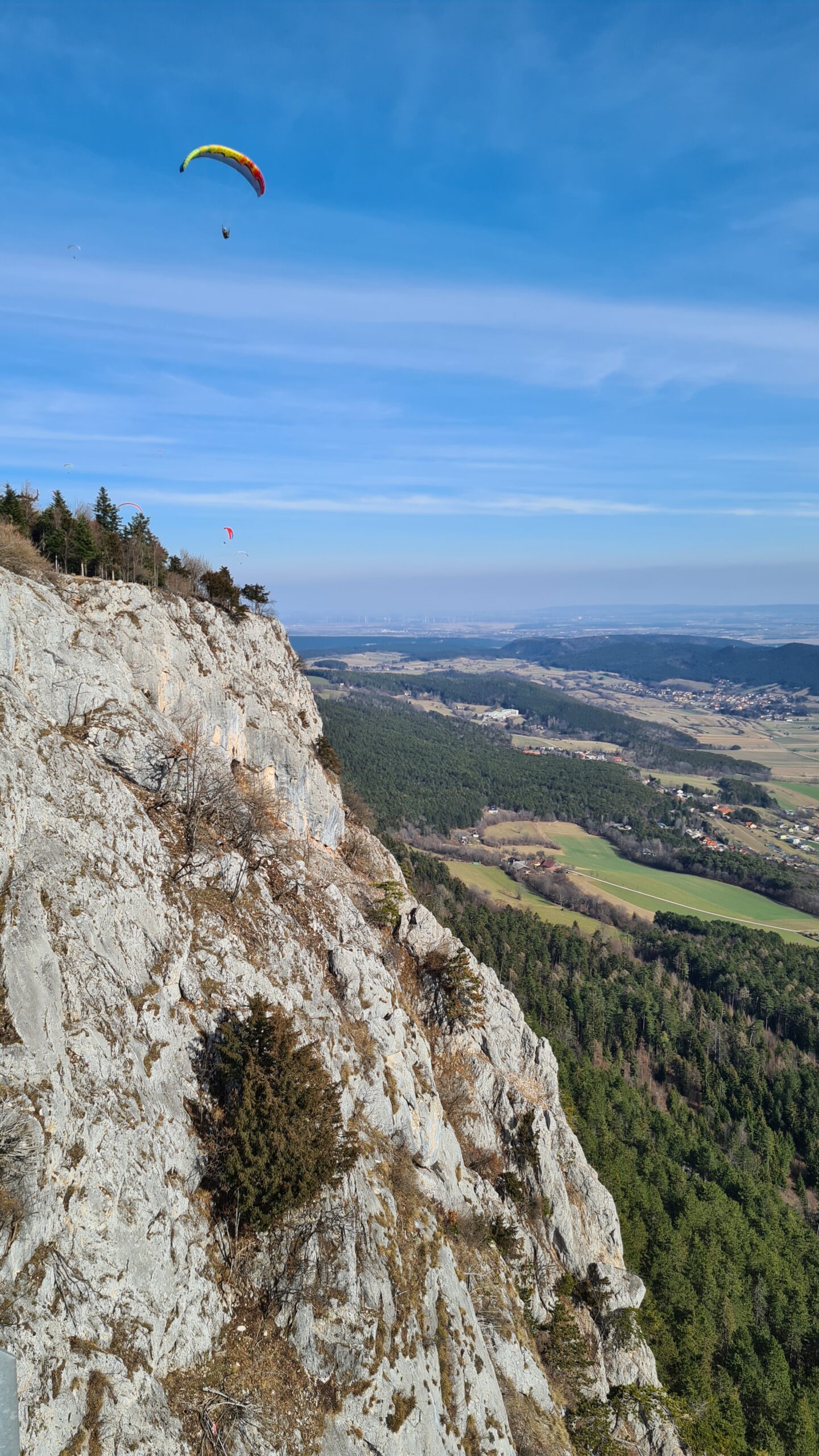 Danach hatten wir ein paar Probleme, um den richtigen Weg zu finden. Auf diesem Abschnitt hatte ich schon bei meiner letzten Wanderung hier gekämpft, aber nachdem wir ein Wildgehege passiert hatten, war dann doch der Skywalk angeschrieben. Von der Aussichtsplattform, die über der Hohen Wand hinausragt, konnten wir unzählige Paragleiter beobachten; Grund dafür ist eine Flugschule direkt beim Skywalk. Unter uns war gerade ein Kletterer auf dem schwierigen ÖTK-Steig unterwegs – es gab hier also einiges zu sehen.