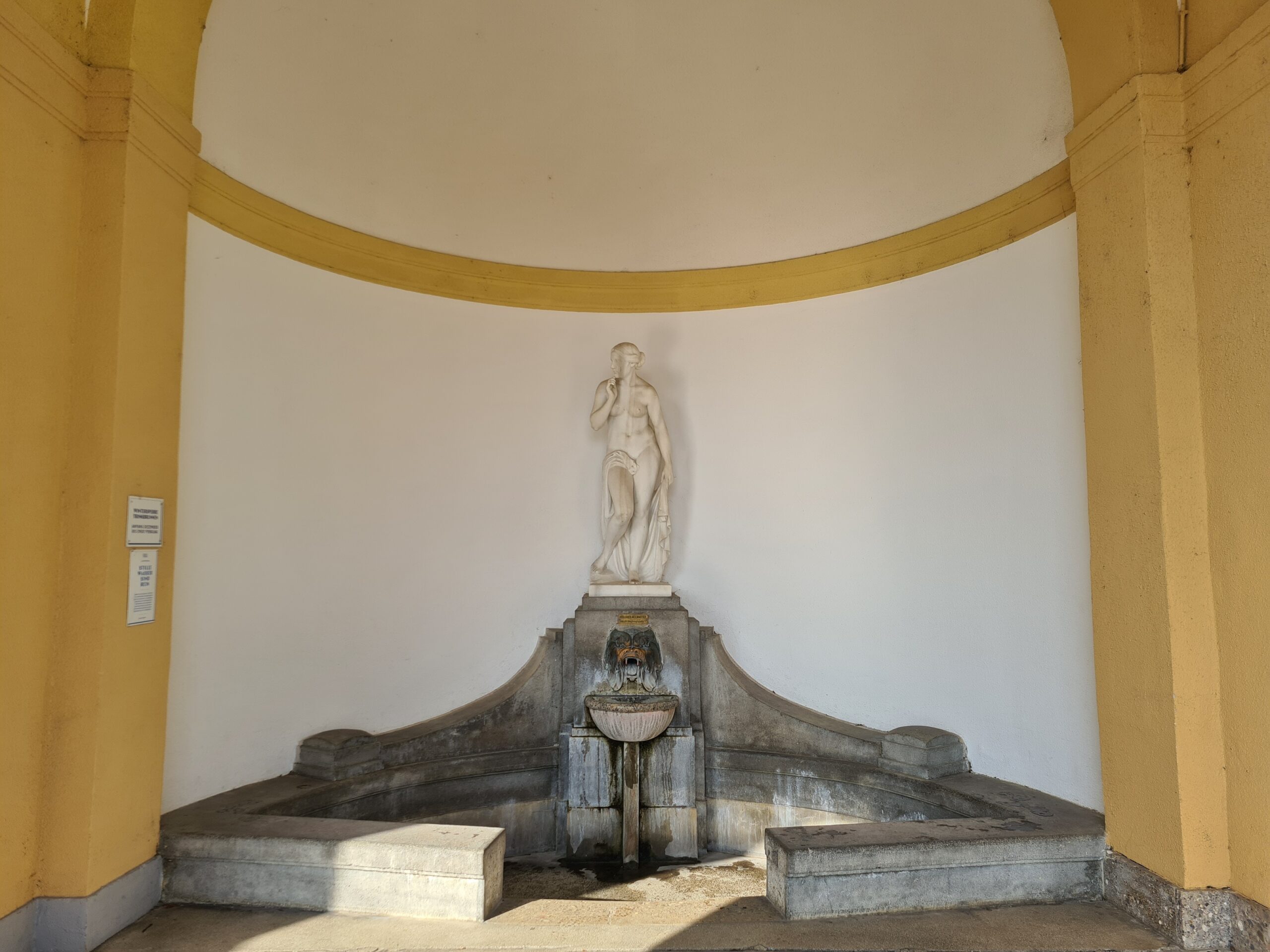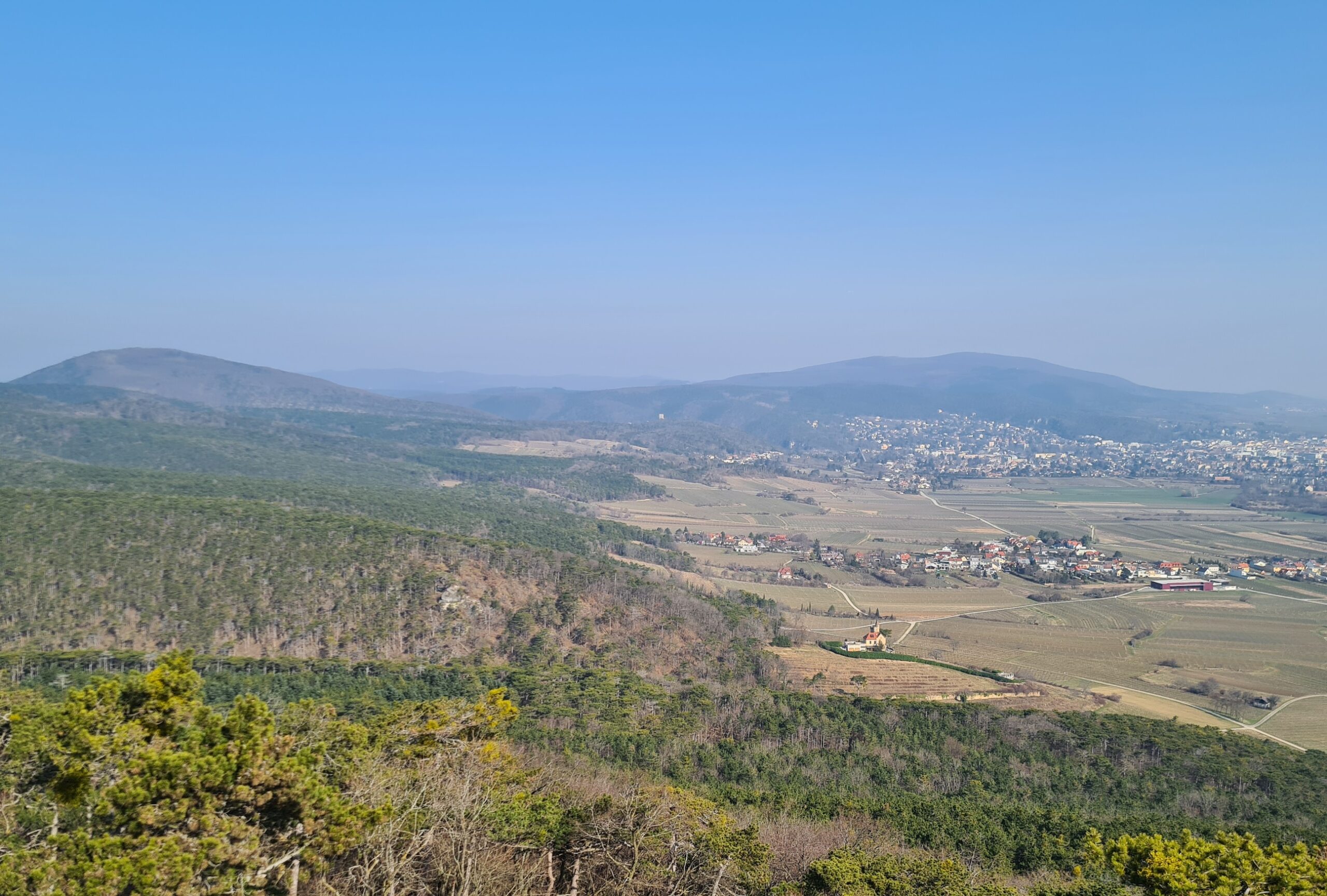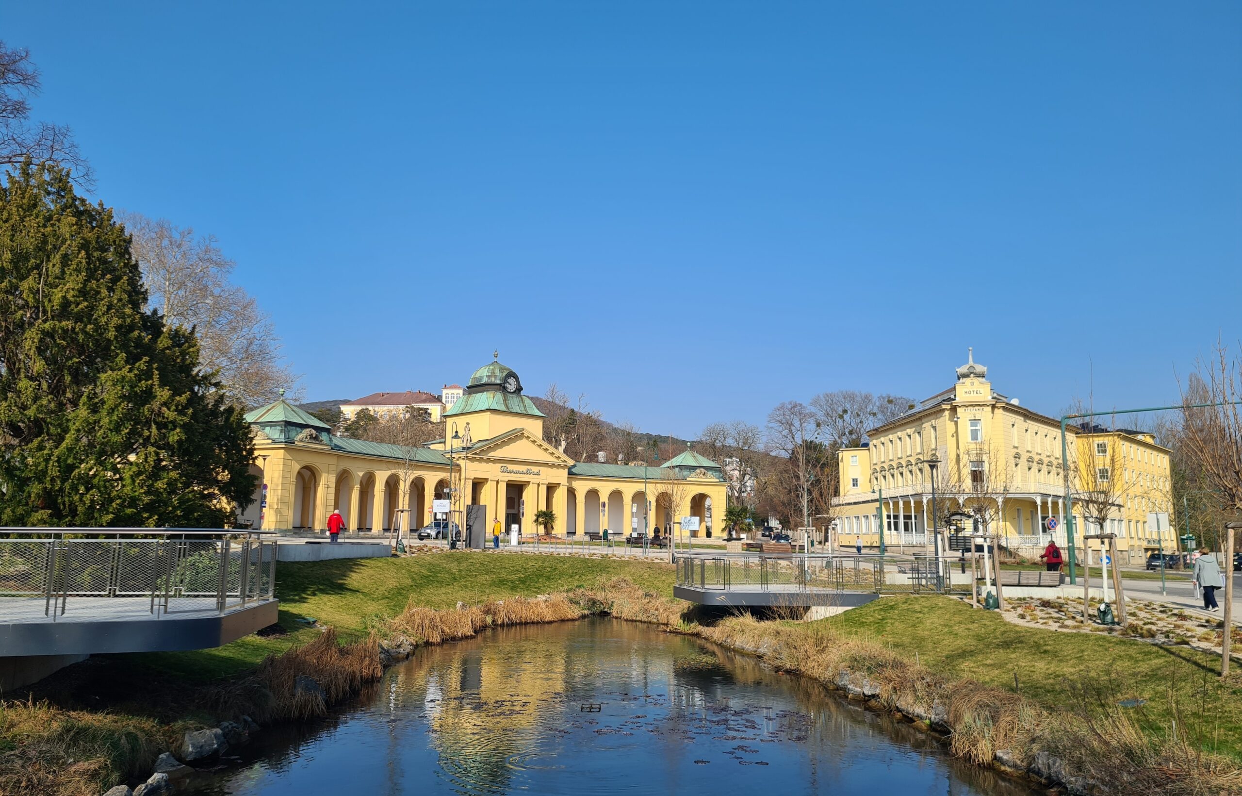 Bei strahlendem Sonnenschein, aber noch recht eisigem Wind startete ich am Bahnhof in Bad Vöslau und durchquerte erst mal die Stadt. Beim Thermalbad machte ich kurz Halt und füllte meine Trinkflasche mit Thermalwasser, ehe ich an der Anlage vorbei bergauf Richtung Wienerwald ging.