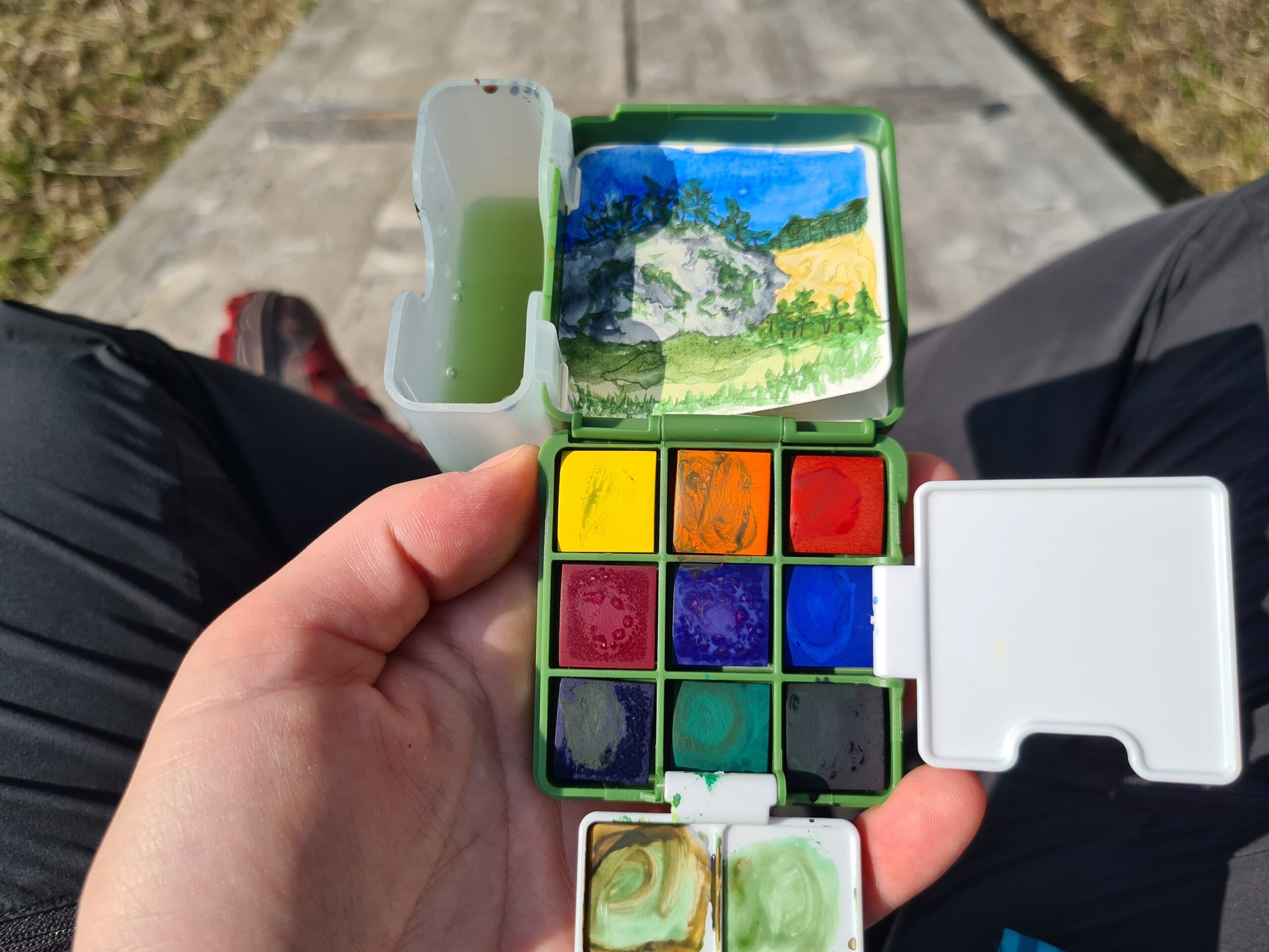 Ich wollte schon längst mein neues Reise-Aquarellset ausprobieren, das ich bereits seit Weihnachten habe. Es ist sehr praktisch, wenn man keinen Tisch hat und alles in einer Hand halten möchte (was beim anderen Set nicht gut geht), allerdings hatte ich doch ein wenig mit dem winzigen Papier-Format zu kämpfen. Da werde ich wohl noch ein wenig herumtesten müssen, was die ideale Lösung für draußen ist.