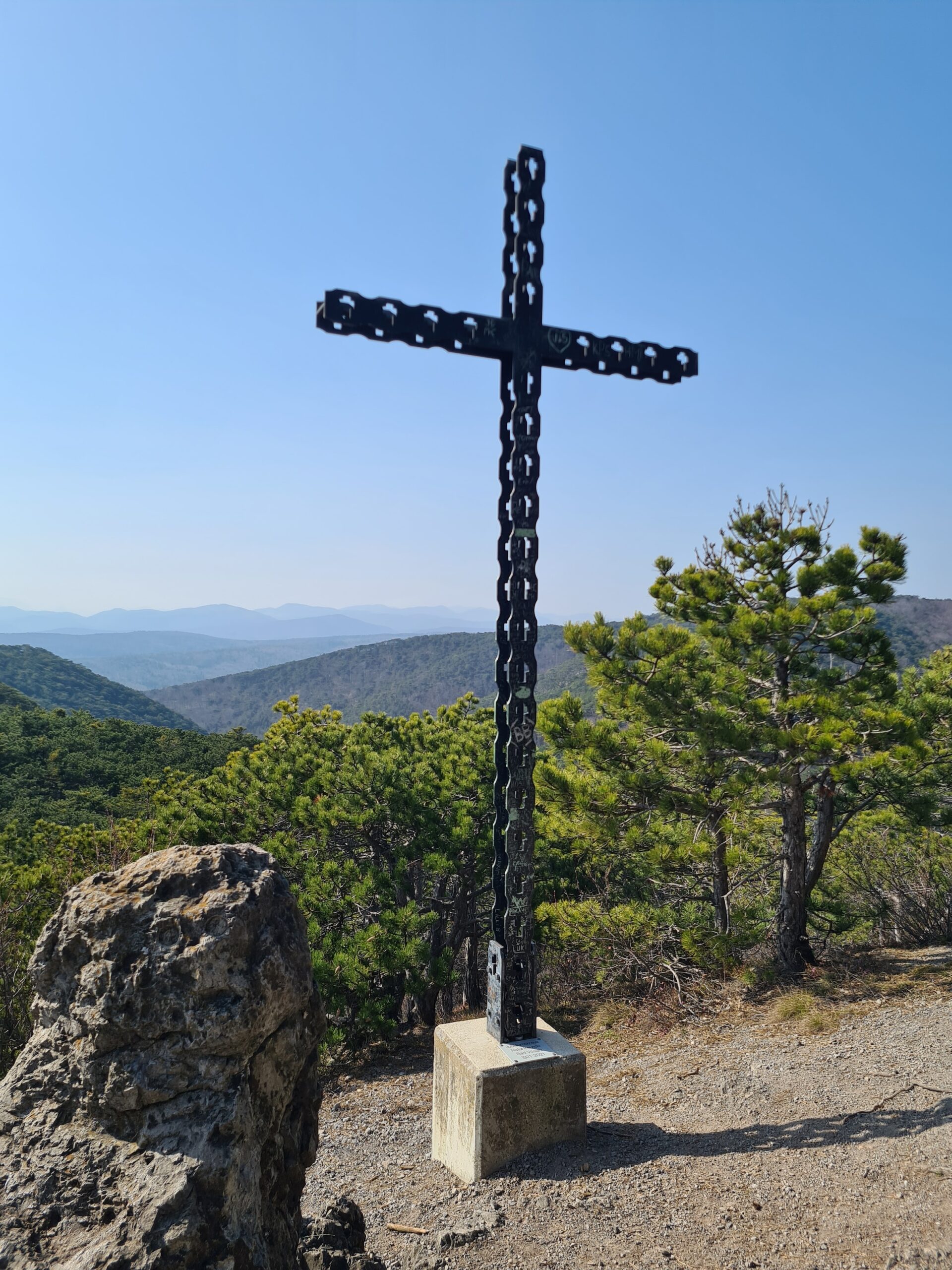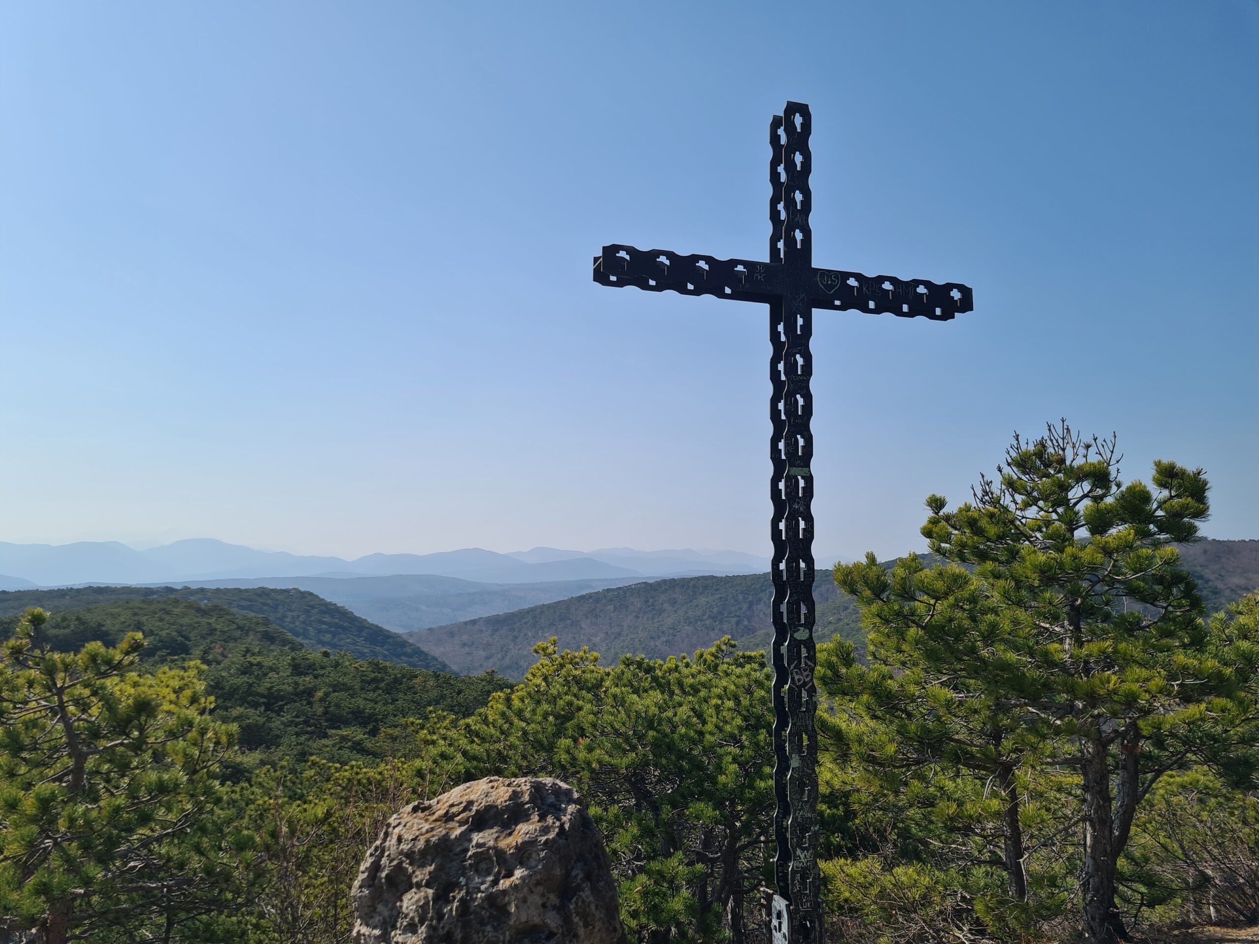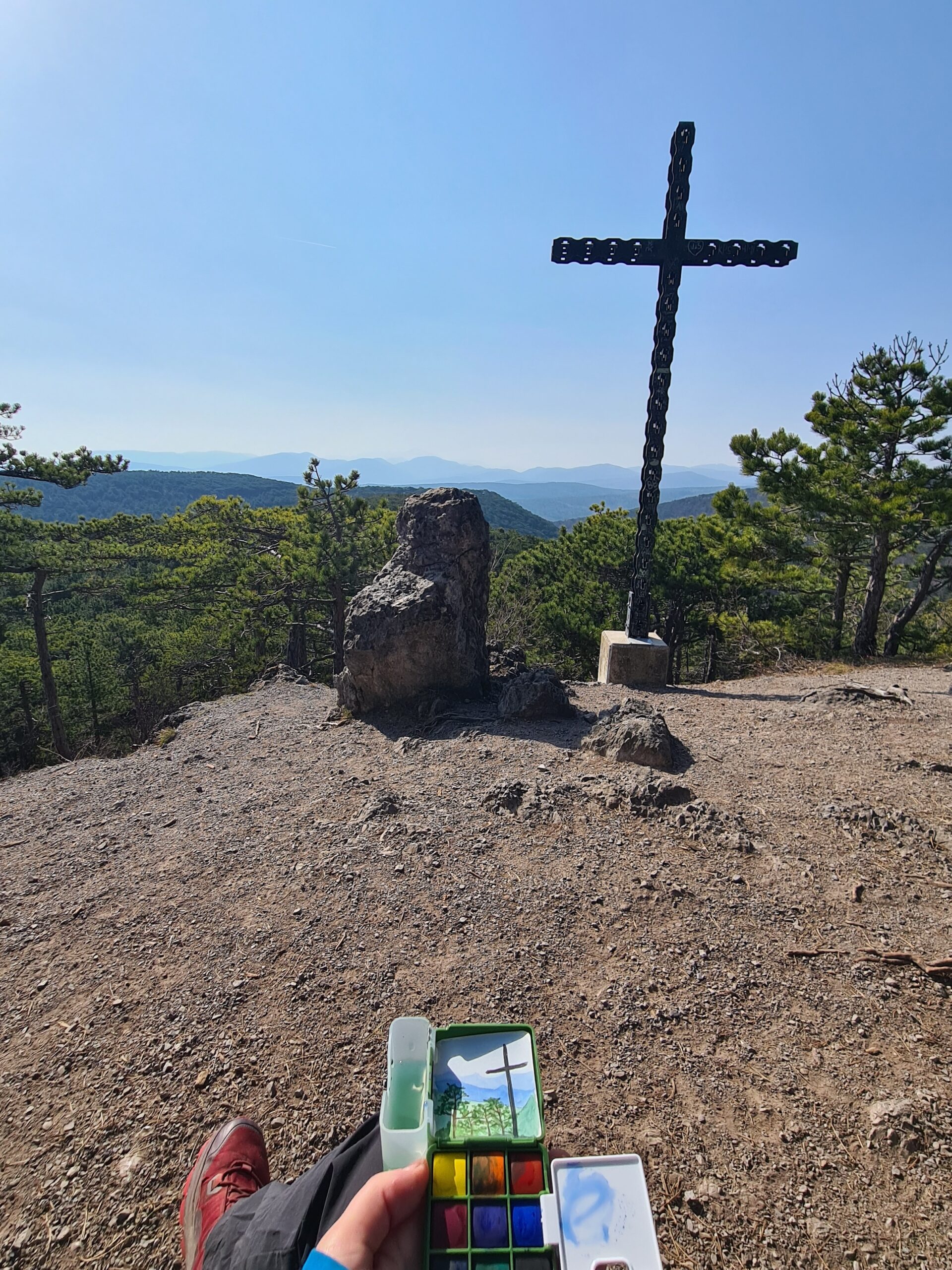 Kurz vor der Hütte bog ich rechts zum Jubiläumskreuz ab, wo es nicht nur einen schönen Ausblick, sondern auch Bänke in der Sonne gab. Genau der richtige Ort für die Mittagspause und eine weitere Mal-Session. Im Vergleich zum Steinbruch war hier aber ordentlich was los – es kamen fast im Minutentakt Biker und Wandergruppen rauf. Kein Wunder bei dem Wetter!