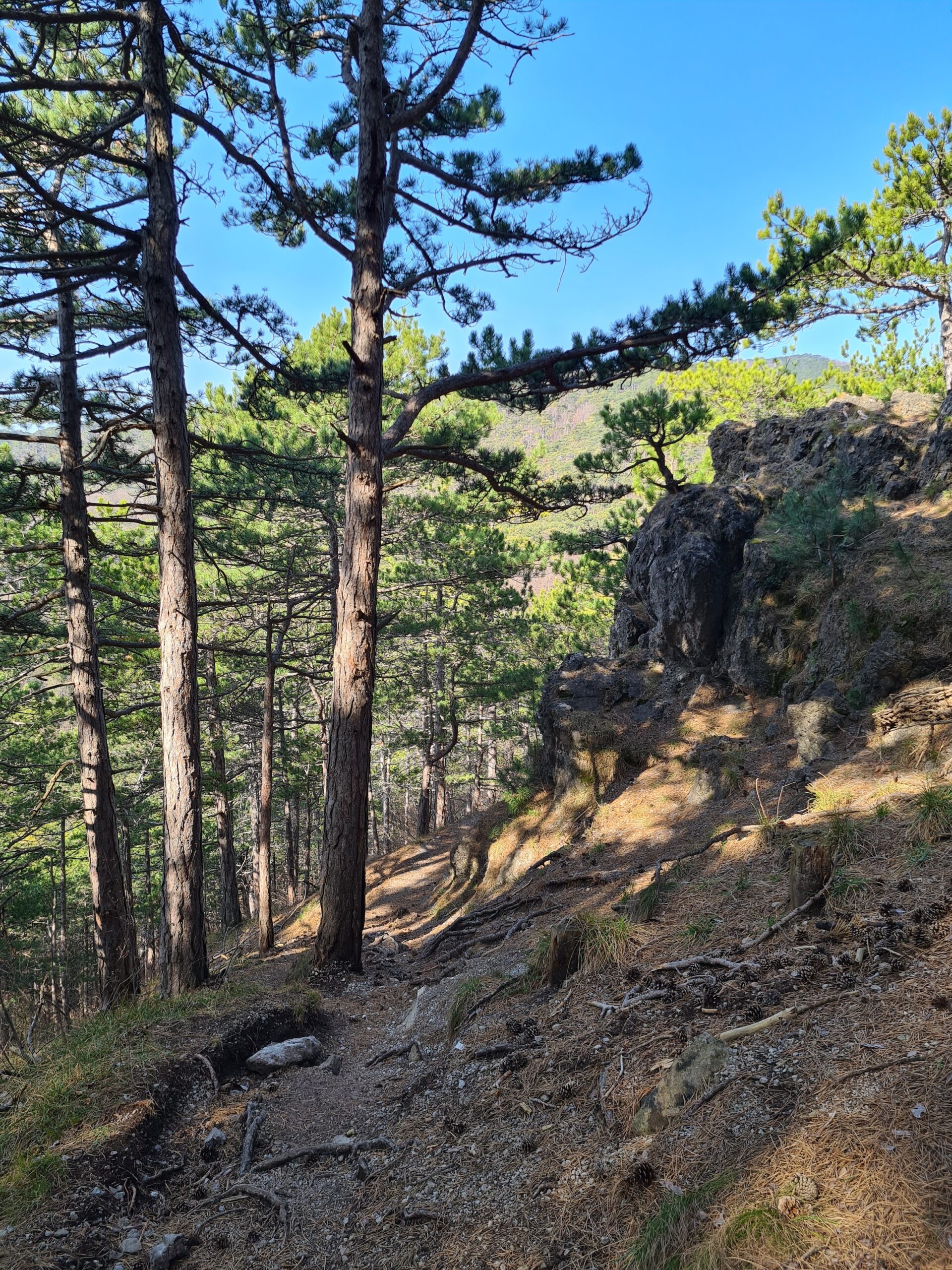 Das letzte Stück nach Pottenstein war dann allerdings noch eine Herausforderung. Ich folgte einem Weg, der zwar kein markierter Wanderweg, aber trotzdem als Fußweg in meiner Kartenmap eingezeichnet und zunächst auch deutlich als solcher erkennbar war. Trotzdem nahm ich zunächst eine falsche Abzweigung und hätte dieser wohl einfach weiter folgen sollen, da ich dann schon bald auf die Straße gestoßen wäre. Ich wollte aber lieber noch länger im Wald bleiben und ging zurück zu meinem Pfad, der sich dann allerdings immer wieder verlor. Teilweise war er auch ziemlich verwachsen, was auf den Fotos vermutlich nicht so dramatisch ausschaut, allerdings waren es vor allem Dornenranken. Ich hatte von oben zwar bereits einen Blick auf Pottenstein, konnte hier aber zunächst keinen Weg hinab finden. Zum Glück würde ich dann aber doch noch fündig und schaffte sogar noch einen kurzen Abstecher zum Billa für ein Eis, ehe ich wieder in den Zug stieg.