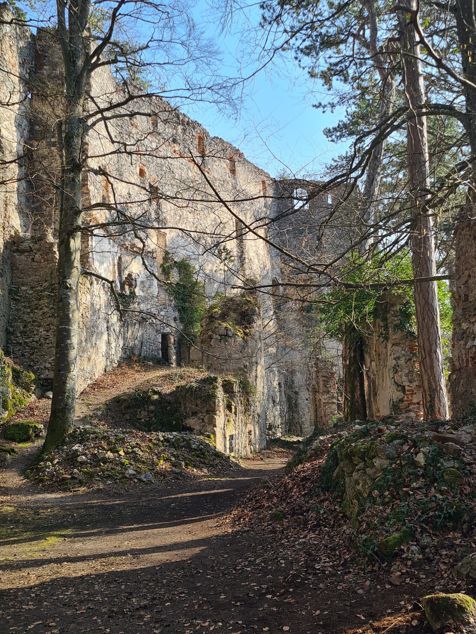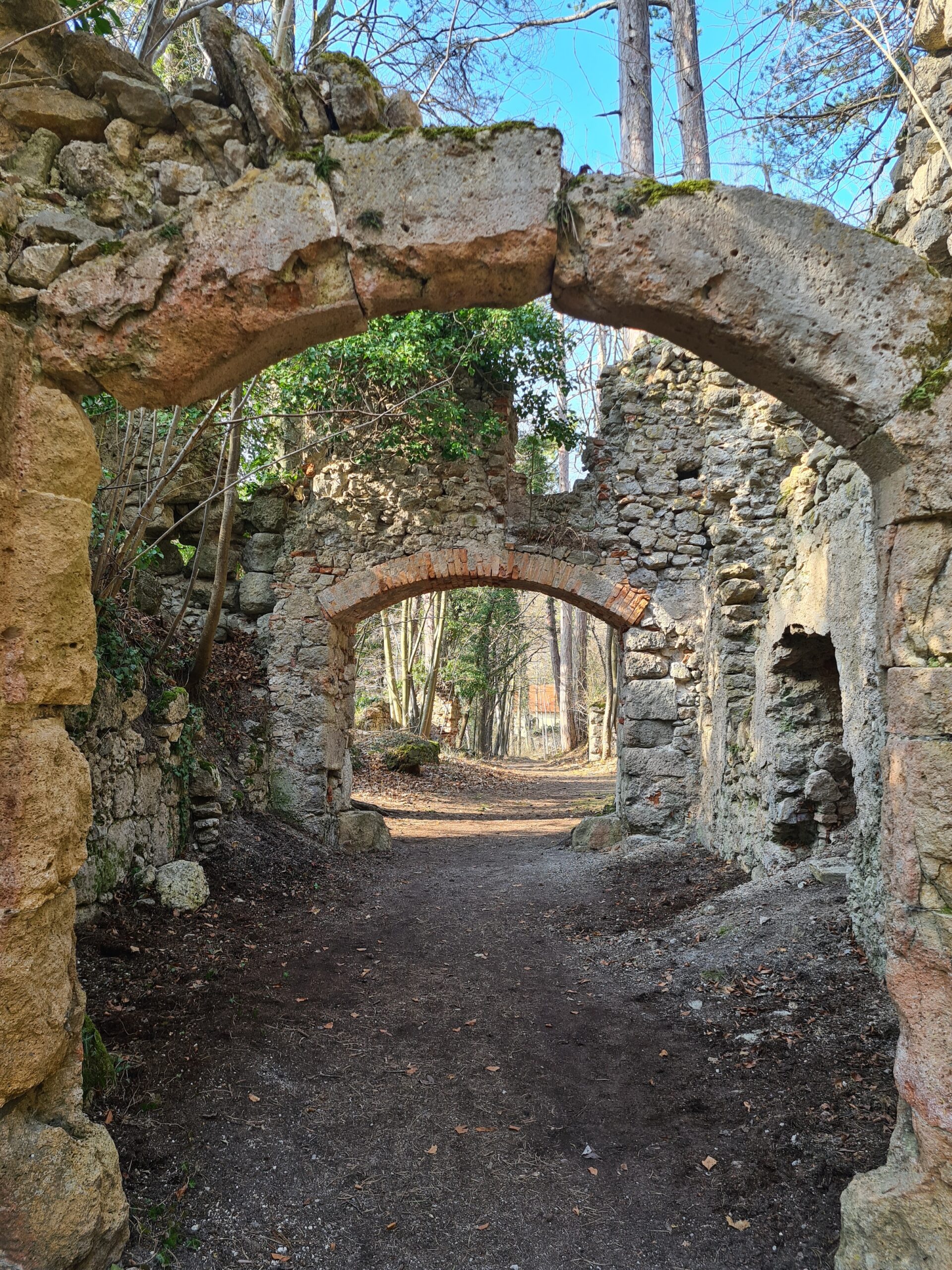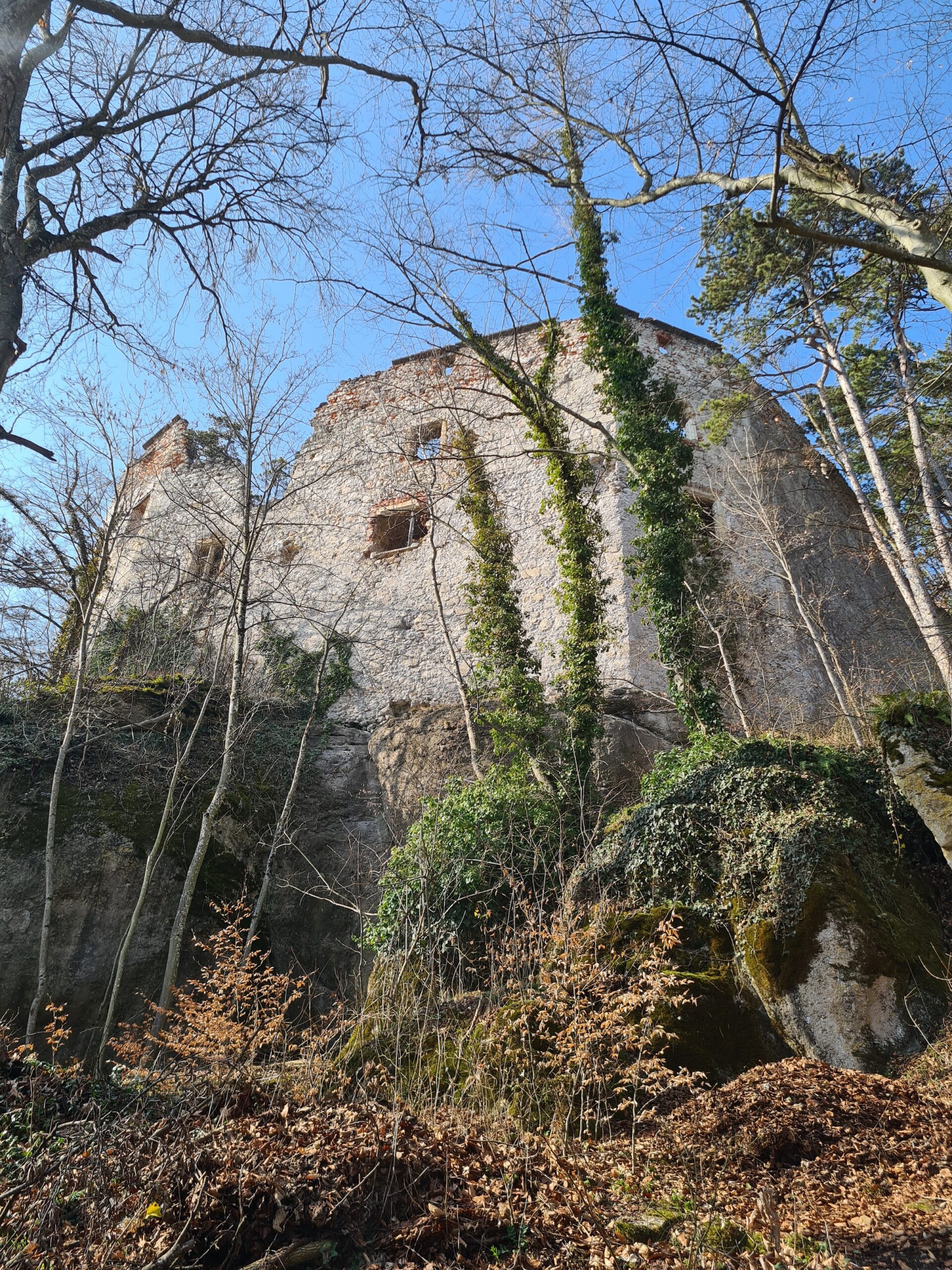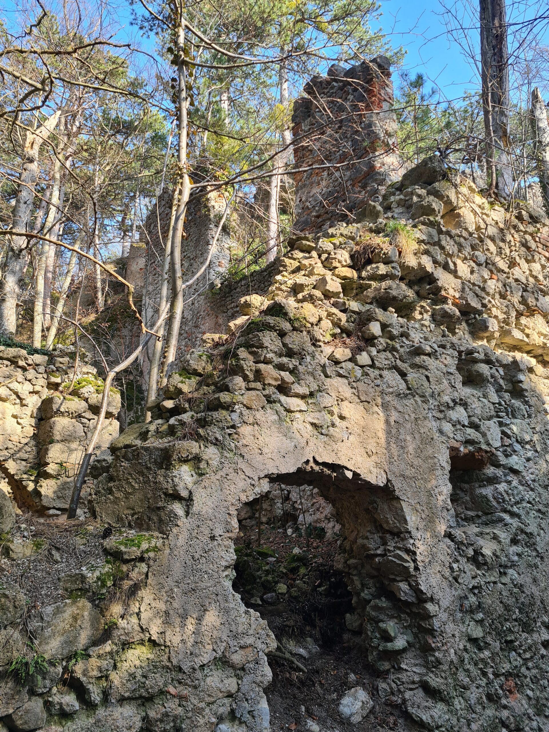 Bei der Ruine Merkenstein nahm ich mir etwas Zeit, um sie zu umrunden und zu erkunden. Die Burg stammt aus dem 12. Jahrhundert und wurde 1683 von osmanischen Truppen eingenommen und in Brand gesteckt. Für einen guten Eindruck der gesamten Anlage hätte ich mir hier eine Drohne gewünscht, aber zum Glück gibt es ja bereits Aufnahmen von oben wie etwa hier.