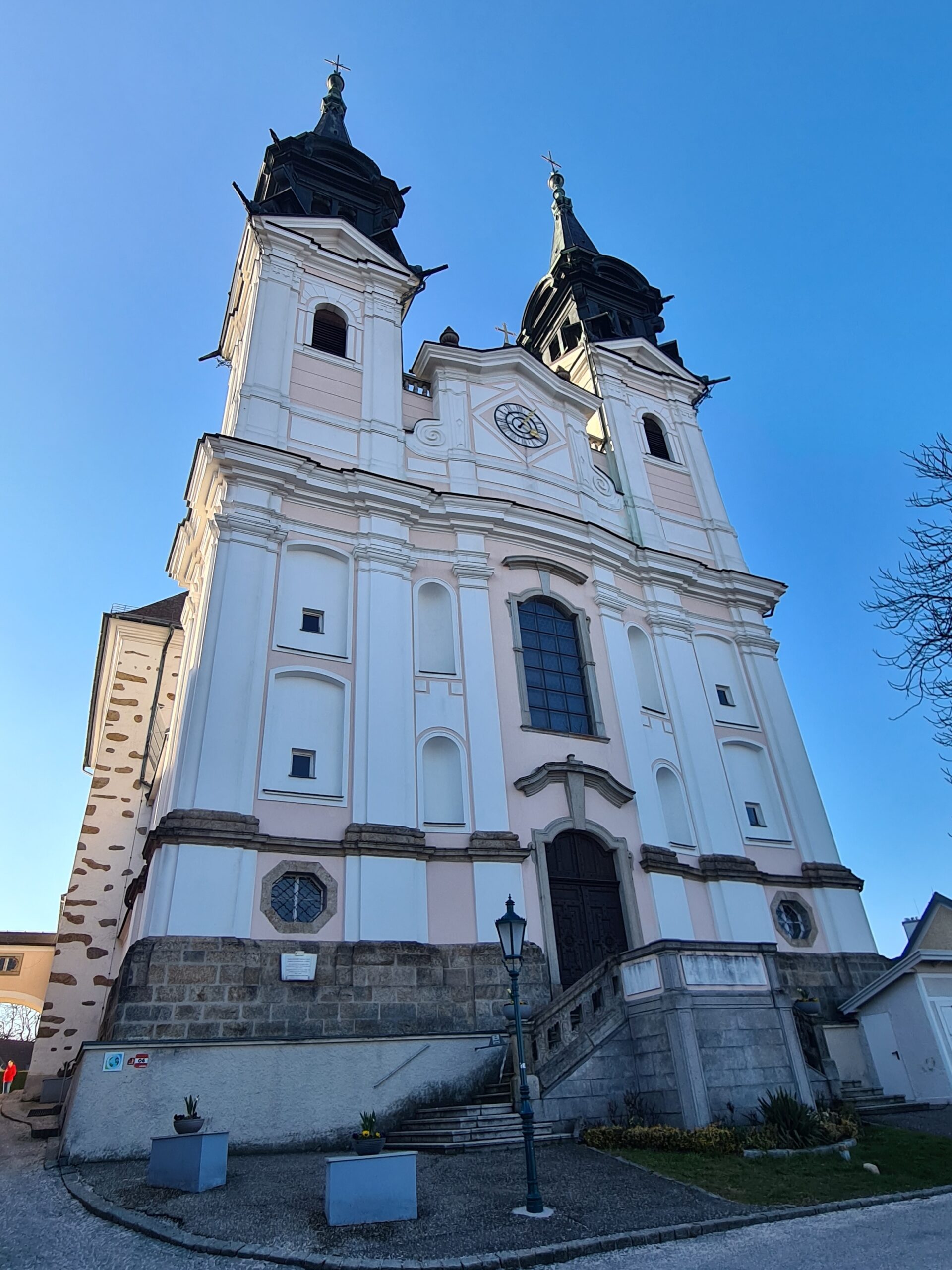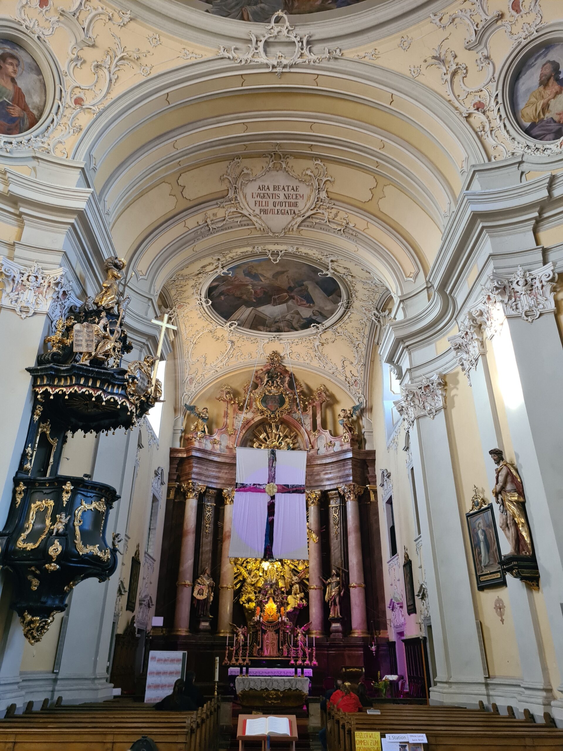 Auf dem Pöstlingberg befindet sich auch eine Wallfahrtskirche aus dem Jahr 1748. Aufgrund der Fastenzeit ist derzeit ein Teil des Altars verhüllt.