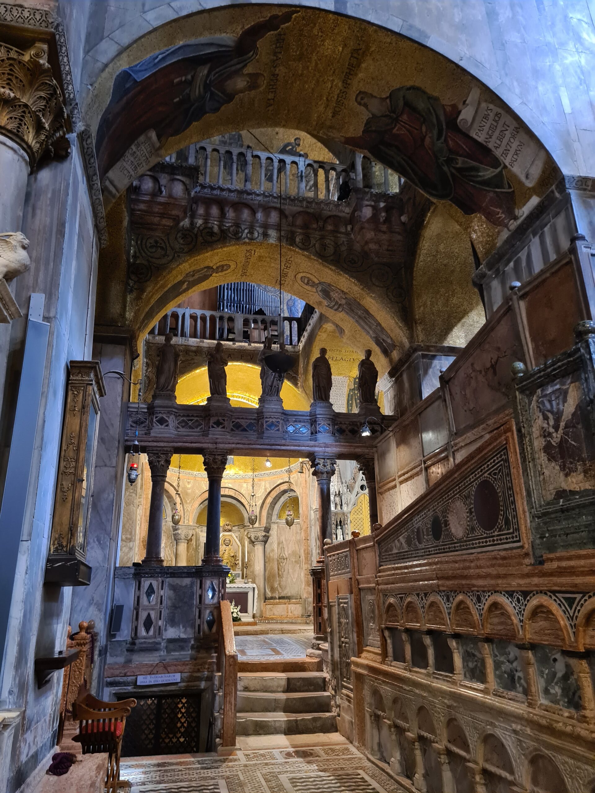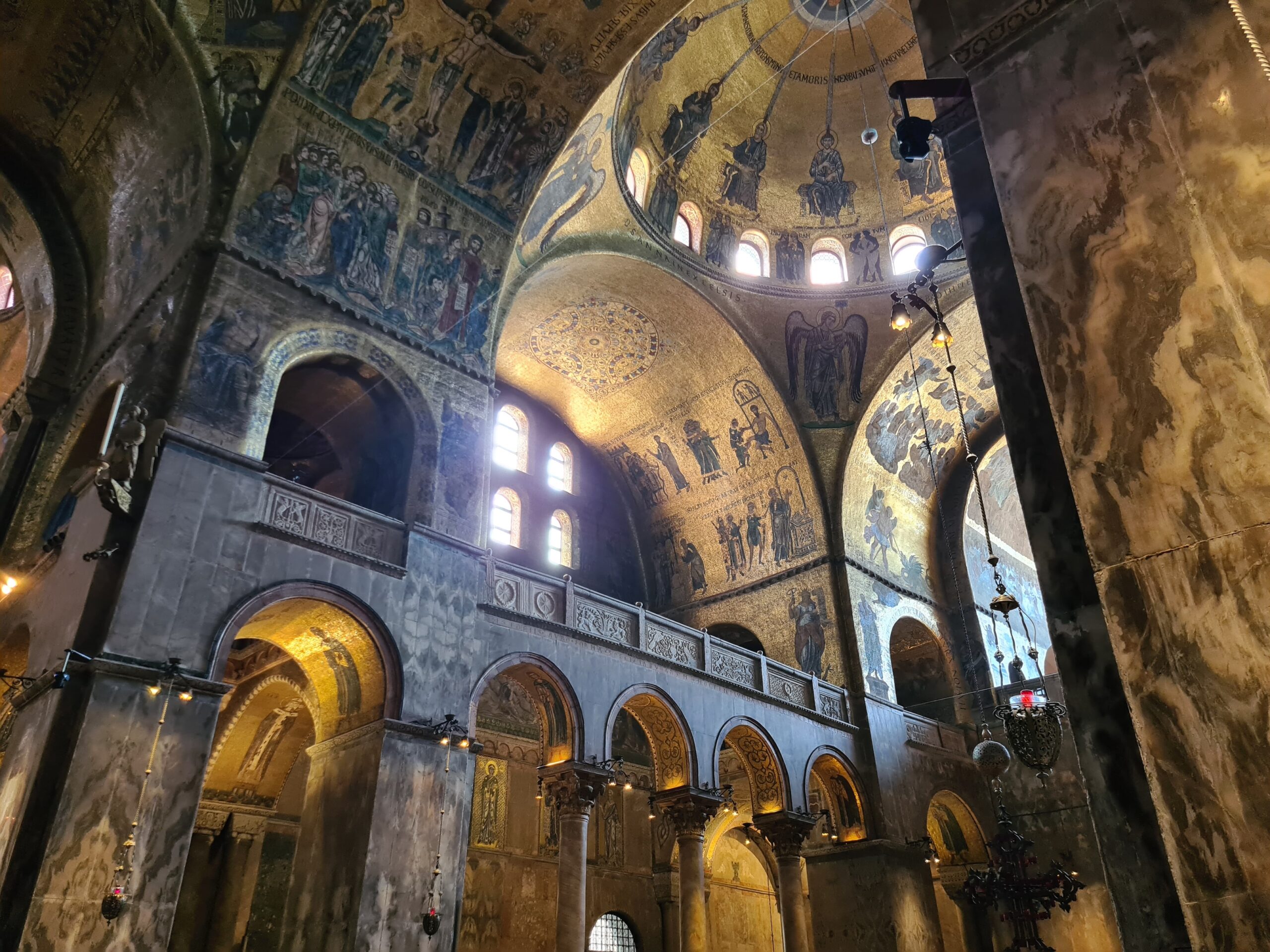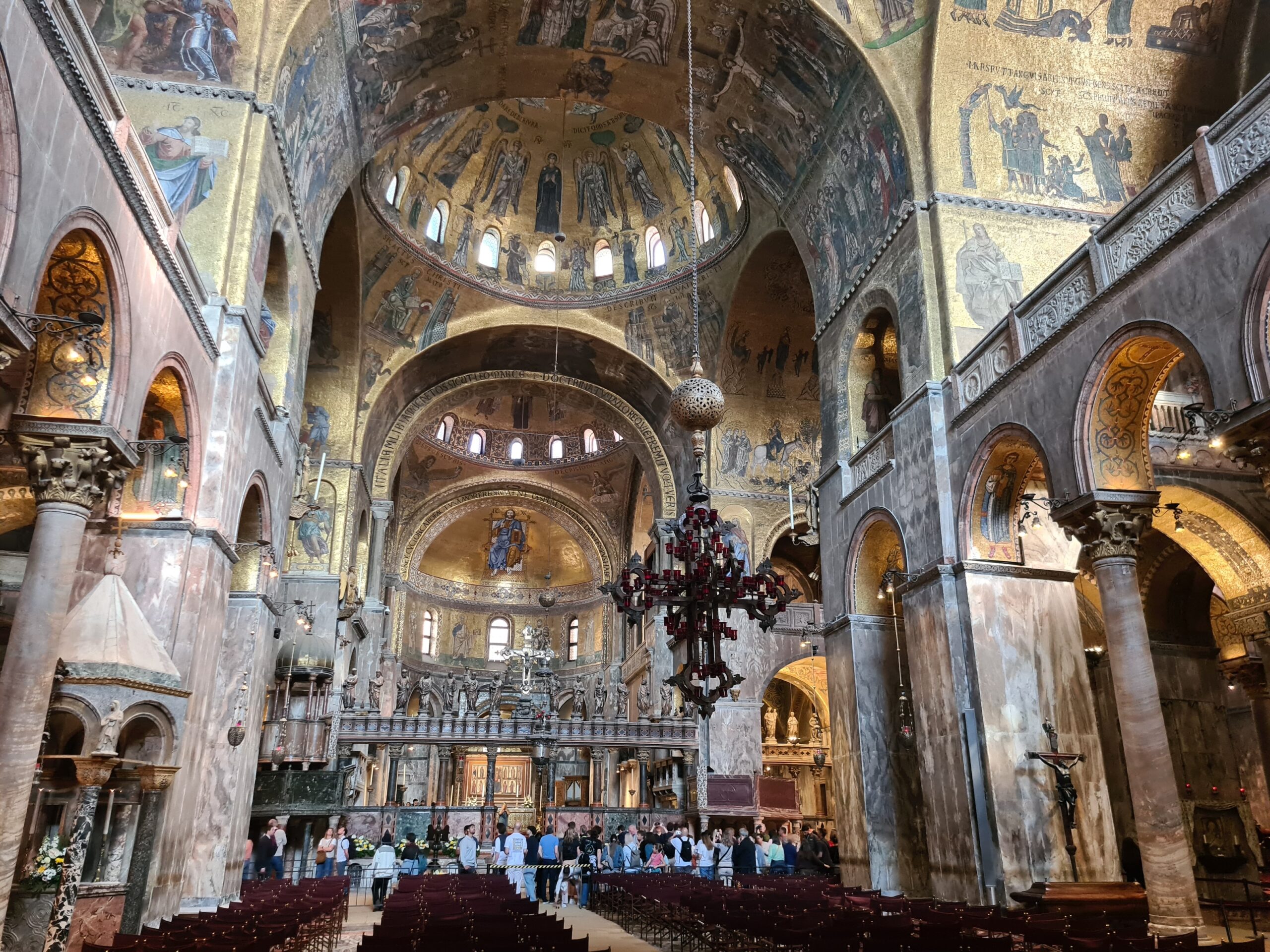 Ich war so vertieft, dass ich beinahe die Zeit übersah, denn ich hatte um 14:30 einen Timeslot im Markusdom gebucht. Daher riss ich mich los und machte mich auf den Weg zurück zu Hauptinsel. Hier war der Kontrast zu den frühen Morgenstunden enorm: Auf dem Markusplatz und rundherum war nun sehr viel los; es gab kaum noch ein Durchkommen. Ich muss auch ehrlich sagen, dass mich der Besuch im Markusdom eher enttäuschte. Natürlich ist die byzantinische Architektur und die Innengestaltung mit den goldenen Mosaiken sehr beeindruckend. Allerdings wird man in einem Einbahnsystem durchgeleitet, wodurch man oft kaum die Möglichkeit hat alles in Ruhe zu betrachten. Es ist drinnen auch so dunkel, dass man teilweise kaum Details sehen kann. Ich bereue es zwar nicht, dass ich den Dom besichtigt habe, aber es war nicht ganz das atemberaubende Erlebnis, das ich mir erhofft hatte.